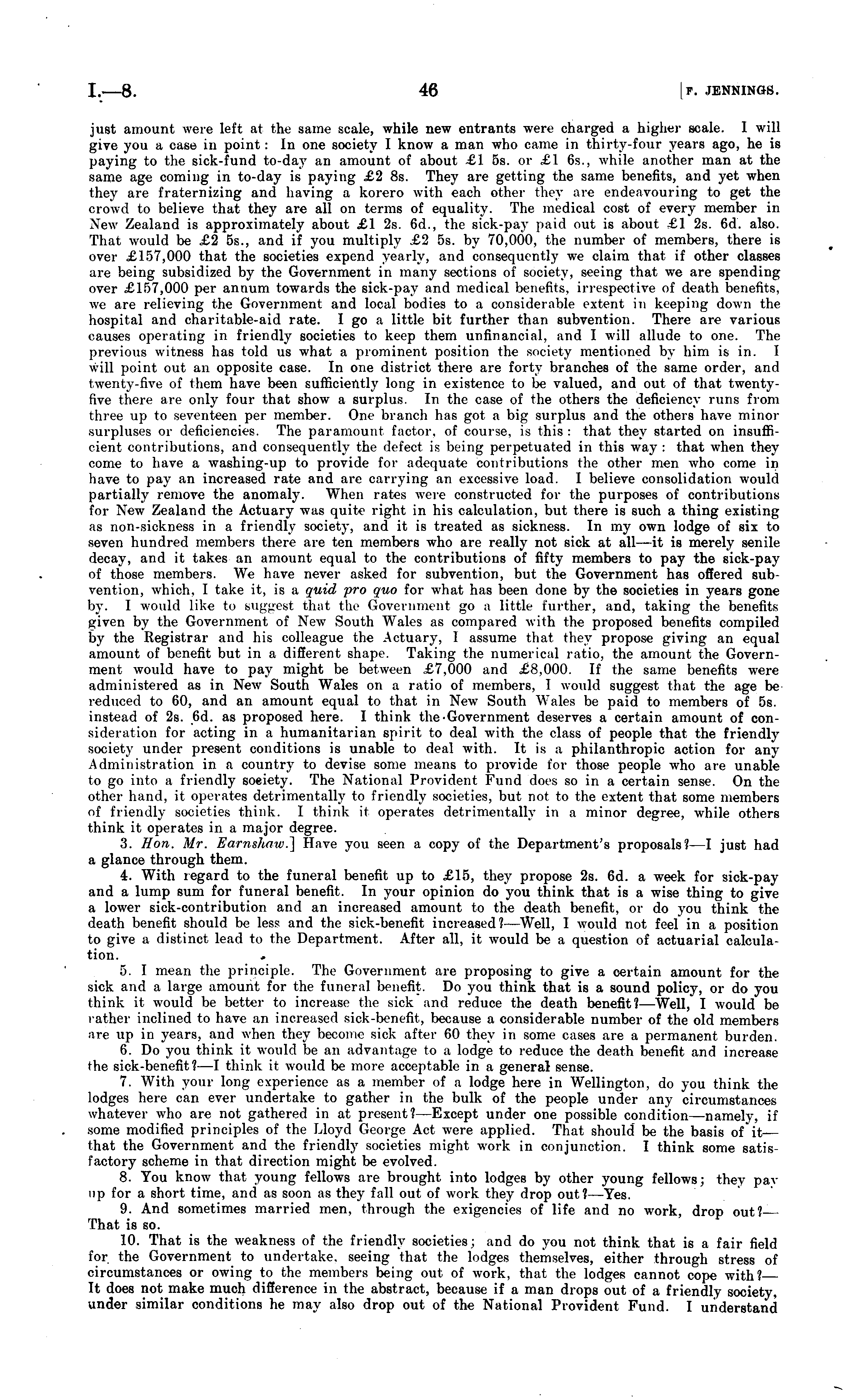 just amount were left at the same scale, while new entrants were charged a higher scale. I will give you a case in point: In one society I know a man who came in thirty-four years ago, he is paying to the sick-fund to-day an amount of about £1 ss. or £1 65., while another man at the same age coming in to-day is paying £2 Bs. They are getting the same benefits, and yet when they are fraternizing and having a korero with each other they are endeavouring to get the crowd to believe that they are all on terms of equality. The medical cost of every member in New Zealand is approximately about £1 2s. 6d., the sick-pay paid out is about £1 2s. 6d. also. That would be £2 55., and if you multiply £2 ss. by 70,000, the number of members, there is over £157,000 that the societies expend yearly, and consequently we claim that if other classes are being subsidized by the Government in many sections of society, seeing that we are spending over £157,000 per annum towards the sick-pay and medical benefits, irrespective of death benefits, we are relieving the Government and local bodies to a considerable extent in keeping down the hospital and charitable-aid rate. Igo a little bit further than subvention. There are various causes operating in friendly societies to keep them unfinancial, and I will allude to one. The previous witness has told us what a prominent position the society mentioned by him is in. I will point out an opposite case. In one district there are forty branches of the same order, and twenty-five of them have been sufficiently long in existence to be valued, and out of that twentyfive there are only four that show a surplus. In the case of the others the deficiency rune from three up to seventeen per member. One branch has got a big surplus and the others have minor surpluses or deficiencies. The paramount factor, of course, is this : that they started on insufficient contributions, and consequently the defect is being perpetuated in this way : that when they come to have a washing-up to provide for adequate contributions the other men who come in have to pay an increased rate and arc carrying an excessive load. I believe consolidation would partially remove the anomaly. When rates were constructed for the purposes of contributions for New Zealand the Actuary was quite right in his calculation, but there is such a thing existing as non-sickness in a friendly society, and it is treated as sickness. In my own lodge of six to seven hundred members there are ten members who are really not sick at all—it is merely senile decay, and it takes an amount equal to the contributions of fifty members to pay the sick-pay of those members. We have never asked for subvention, but the Government has offered subvention, which, I take it, is a quid pro quo for what has been done by the societies in years gone by. I would like to suggest that the Government go a little further, and, taking the benefits given by the Government of New South Wales as compared with the proposed benefits compiled by the Registrar and his colleague the Actuary, I assume that they propose giving an equal amount of benefit but in a different shape. Taking the numerical ratio, the amount the Government would have to pay might be between £7,000 and £8,000. If the same benefits were administered as in New South Wales on a ratio of members, I would suggest that the age be reduced to 60, and an amount equal to that in New South Wales be paid to members of ss. instead of 2s. 6d. as proposed here. I think the-Government deserves a certain amount of consideration for acting in a humanitarian spirit to deal with the class of people that the friendly society under present conditions is unable to deal with. It is a philanthropic action for any Administration in a country to devise some means to provide for those people who are unable to go into a friendly society. The National Provident Fund does so in a certain sense. On the other hand, it operates detrimentally to friendly societies, but not to the extent that some members of friendly societies think. I think it operates detrimentally in a minor degree, while others think it operates in a major degree. 3. Hon. Mr. Earnshmv.] Have you seen a copy of the Department's proposals?—l just had a glance through them. i. With regard to the funeral benefit up to £15, they propose 2s. 6d. a week for sick-pay and a lump sum for funeral benefit. In your opinion do you think that is a wise thing to give a lower sick-contribution and an increased amount to the death benefit, or do you think the death benefit should be less and the sick-benefit increased? —Well, I would not feel in a position to give a distinct lead to the Department. After all, it would be a question of actuarial calculation. 5. I mean the principle. The Government are proposing to give a certain amount for the sick and a large amount for the funeral benefit. Do you think that is a sound policy, or do you think it would be better to increase the sick and reduce the death benefit? —Well, I would be rather inclined to have an increased sick-benefit, because a considerable number of the old members are up in years, and when they become sick after 60 they in some cases are a permanent burden. 6. Do you think it would be an advantage to a lodge to reduce the death benefit and increase the sick-benefit ?—I think it would be more acceptable in a general sense. 7. With your long experience as a member of a lodge here in Wellington, do you think the lodges here can ever undertake to gather in the bulk of the people under any circumstances whatever who are not gathered in at present?— Except under one possible condition—namely, if some modified principles of the Lloyd George Act were applied. That should be the basis of it that the Government and the friendly societies might work in conjunction. I think some satisfactory scheme in that direction might be evolved. 8. You know that young fellows are brought into lodges by 