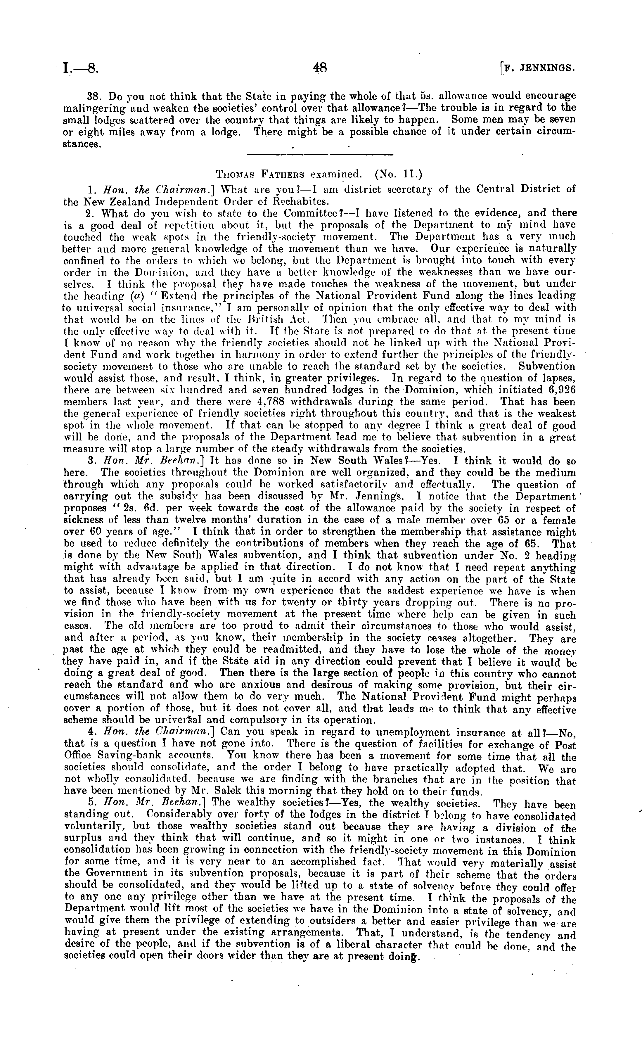 Thomas Fathers examined. (No. 11.) 1. Hon. the Chairman.'] What are you? —1 am district secretary of the Central District of the New Zealand Independent Order of Kcchabites. 2. What do you wish to state to the Committee? —I have listened to the evidence, and there is a good deal of repetition about it, but the proposals of the Department to my mind have touched the weak spots in the friendly-society movement. The Department lias a very much better and more general knowledge of the movement than we have. Our experience is naturally confined to the orders to which we belong, but the Department is broughi into touch with every order in the Dominion, and they have a better knowledge of the weaknesses than we have ourselves. I think the proposal they hare made touches the weakness of the movement, but under the heading (a) " Extend the principles of the National Provident Fund along the lines leading to universal social insurance," I am personally of opinion that the only effective way to deal with that would be on the lines of the British Act. Then you embrace all. and that to my mind is the only effective way to dial with it. If the State is not prepared to do that at the present time I know of no reason why the friendly societies should not be linked up with the National Provident Fund and work together in harmony in order to extend further the principles of the friendlysociety movement to those who ;re unable to reach the standard set by the societies. Subvention would assist those, and result. T think, in greater privileges. In regard to the question of lapses, there are between six hundred and seven hundred lodges in the Dominion, which initiated 6,926 members last year, and there were 4,788 withdrawals during the came period. That has been the general experience of friendly societies right throughout this country, and that is the weakest spot in the whole movement. If that can be stopped to any degree I think a great deal of good will be done, and the proposals of the Department lead me to believe that subvention in a great measure will stop a large number of the steady withdrawals from the societies. 3. Hon. Mr. Beth/in.] It has done so in New South Wales? —Yes. I think it would do so here. The societies throughout the Dominion are well organized, and they could be the medium through which any proposals could be worked satisfactorily and effectually. The question of carrying out the subsidy has been discussed by Mr. Jennings. I notice that the Department proposes " 2s. fid. per week towards the cost of the allowance paid by the society in respect of sickness of less than twelve months' duration in the case of a male member over 65 or a female over 60 years of age." I think that in order to strengthen the membership that assistance might be used to reduce definitely the contributions of members when the\' reach the age of 65. That is done by the New South Wales subvention, and I think that subvention under No. 2 heading might with advantage be applied in that direction. I do not know that I need repeat anything that has already been said, but I am quite in accord with any action on the part of the" State to assist, because I know from my own experience that the saddest experience we have is when we find those who have been with us for twenty or thirty years dropping out. There is no provision in the friendly-society movement at the present time where help can be given in such cases. The old members are too proud to admit their circumstances to those who would assist, and after a period, as you know, their membership in the society ceases altogether. They are past the age at which they could be readmitted, and they have to lose the whole of the money they have paid in, and if the State aid in any direction could prevent that I believe it would be doing a great deal of good. Then there is the large section of people v) this country who cannot reach the standard and who are anxious and desirous of making some provision, but their circumstances will not allow them to do very much. The National Provident Fund micrht perhaps cover a portion of those, but it does not cover all, and that leads ms <o think that any effective scheme should be universal and compulsory in its operation. 4. Hon. the Chairman."] Can you speak in regard to unemployment insurance at all? No, that is a question I have not gone into. There is the question of facilities for exchange of Post Office Saving-bank accounts. You know there has been a movement for some time that all the societies should consolidate, and the order I belong to have practically adopted that. We are not wholly consolidated, because we are finding with the branches that are in the position that have been mentioned by Mr. Salek this morning that they hold on to their funds. 5. Hon. Mr. Beehan.] The wealthy societies? —Yes, the wealthy societies. They have been standing out. Considerably over forty of the lodges in the district I belong to have consolidated voluntarily, but those wealthy societies stand out because they are having a division of the surplus and they think that will continue, and so it might in one or two instances. I think consolidation has been growing in connection with the friendly-society movement in this Dominion for some time, and it is very near to an accomplished fact. That would very materially assist the Government in its subvention proposals, because it is part of their scheme that the" orders should be consolidated, and they would be lifted up to a state of solvency before they could offer to any one any privilege other than we have at the present time. I think the proposals of the Department would lift most of the societies we have in the Dominion into a state of solvency, and would give them the privilege of extending to outsiders a better and easier privilege than we are having at present under the existing arrangements. That, I understand, is the tendency and desire of the people, and if the subvention is of a l