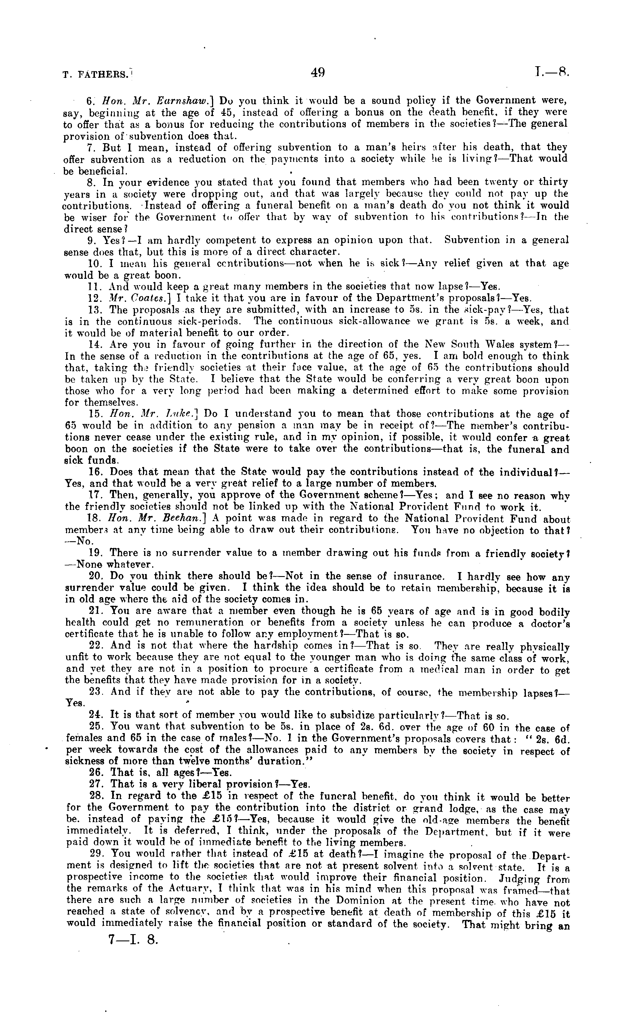 6. Hon. Mr. Earnshaw.] Do you think it would be a sound policy if the Government were, say, beginning at the age of 45, instead of offering a bonus on the death benefit, if they were to offer that as- a bonus for reducing the contributions of members in the societies? —The general provision of subvention does that. 7. But I mean, instead of offering subvention to a man's heirs after his death, that they offer subvention as a reduction on the payments into a society while be is living?— That would be beneficial. 8. In your evidence you stated that you found that members who had been twenty or thirty years in a society were dropping out, and that was largely because they could not pay up the contributions. Instead of offering a funeral benefit on a man's death do you not think it would be wiser for the Government t<> oiler that by way of subvention to his contributions] — In the direct sense? 9. Yes?—l am hardly competent to express an opinion upon that. Subvention in a general sense does that, but this is more of a direct character. 10. I ineau his general contributions —not when he is sick? —Any relief given at that age would be a great boon. 11. And would keep a many members in the societies that now lapse?— Yes. 12. Mr. Coatcs.] I take it that you are in favour of the Department's proposals?— Yes. 13. The proposals as they are submitted, with an increase to ss. in the sick-pay? —Yes, that is in the continuous sick-periods. The continuous sick-allowance we grant is Tis. a week, and it would be of material benefit to our order. 14. Are you in favour of going further in the direction of the New South Wales system?— In the sense of a reduction in the contributions at the age of 65, yes. lam bold enough to think that, taking th; friendly societies at their face value, at the age of 65 the contributions should be taken up by the State. I believe that the State would be conferring a very great boon upon those who for a very long period had been making a determined effort to make some provision for themselves. 15. Hon. Mr. f.nke.] Do I understand you to mean that those contributions at the age of 65 would be in addition to any pension a man may be in receipt of?— The member's contributions never cease under the existing rule, and in my opinion, if possible, it would confer a great boon on the societies if the State were to take over the contributions—that is, the funeral and sick funds. 16. Does that mean that the State would pay the contributions instead of the individual? — Yes, and that would be a very great relief to a large number of members. 17. Then, generally, you approve of the Government scheme? —Yes; and I see no reason why the friendly societies should not be linked up with the National Provident Fund to work it. 18. Hon. Mr. Beehan.] A point was made in regard to the National Provident Fund about member.? at any time being able to draw out their contributions. You have no objection to that? —No. 19. There is no surrender value to a member drawing out his funds from a friendly society? —None whatever. 20. Do you think there should be? —Not in the sense of insurance. I hardly see how any surrender value could be given. I think the idea should be to retain membership, because it is in old age where the aid of the society comes in. 21. You are aware that a member even though he is 65 years of age and is in good bodily health could get no remuneration or benefits from a society unless he can produce a doctor's certificate that he is unable to follow any employment?— That is so. 22. And is not that where the hardship comes in?— That is so. They are really physically unfit to work because they are not equal to the younger man who is doing tTie same class of work, and yet they are not in a position to procure a certificate from a medical man in order to get the benefits that they have made provision for in a society. 23. And if they are not able to pay the contributions, of course, the membership lapses?— Yes. 24. It is that sort of member you would like to subsidize particularly?— That is so. 25. You want that subvention to be ss. in place of 2s. 6d. over the age of 60 in the case of females and 65 in the case of males? —No. lin the Government's proposals covers that: " 2s. 6d. per week towards the cost of the allowances paid to any members by the society in respect of sickness of more than twelve months' duration." 26. That is, all ages?— Yes. 27. That is a very liberal provision?— Yes. 28. In regard to the £15 in respect of the funeral benefit, do you think it would be better for the Government to pay the contribution into the district or errand lodge, as the case may be. instead of paying: the £15? —Yes, because it would give the old-ace members the benefit immediately. It is deferred, I think, under the proposals of the Department, but if it were paid down it would be of immediate benefit to the living members. 29. You would rather that instead of £15 at death? —I imagine the proposal of the Department is designed to lift the societies that are not at present solvent into a solvent state. It is a prospective income to the societies that would improve their financial position. Judging from the remarks of the Actuary, I think that was in his mind when this proposal was framed that there are such a large number of societies in the Dominion at the present time who have not reached a state of solvency, and by a prospective benefit at death of membership of this £15 it would immediately raise the financial position or standard of the society. That might bring an