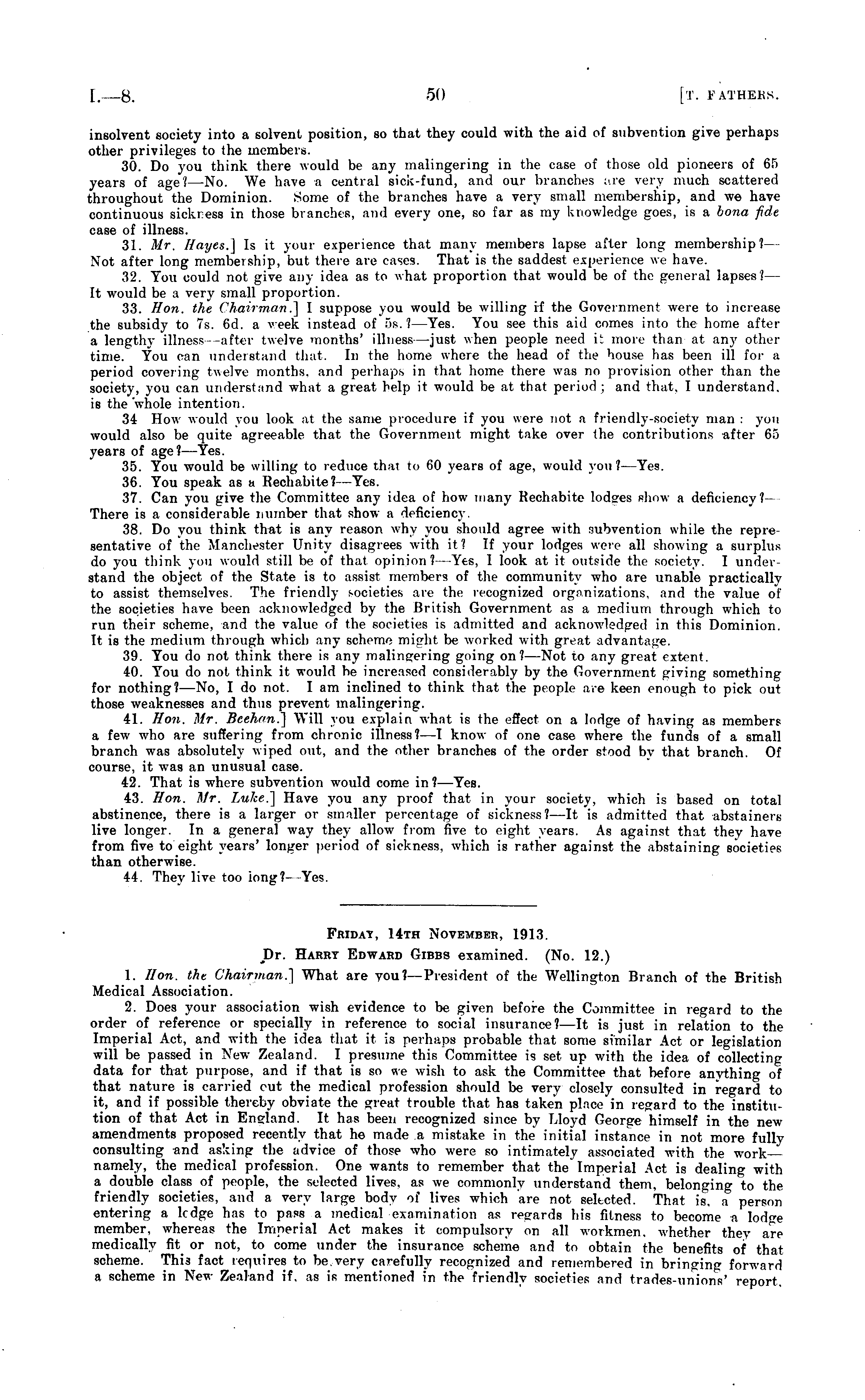 Friday, 14th November, 1913. Bγ. Harry Edward Gibbs examined. (No. 12.) 1. Hon. tht Chairman.] What are you?— President of the Wellington Branch of the British Medical Association. 2. Does your association wish evidence to be given before the Committee in regard to the order of reference or specially in reference to social insurance?—lt is just in relation to the Imperial Act, and with the idea that it is perhaps probable that some similar Act or legislation will be passed in New Zealand. I presume this Committee is set up with the idea of collecting data for that purpose, and if that is so we wish to ask the Committee that before anything of that nature is carried cut the medical profession should be very closely consulted in regard to it, and if possible thereby obviate the great trouble that has taken place in regard to the institution of that Act in Ensrland. It has been recognized since by Lloyd George himself in the new amendments proposed recently that he made a mistake in the initial instance in not more fully consulting and asking the advice of those who were so intimately associated with the work namely, the medical profession. One wants to remember that the Imperial Act is dealing with a double class of people, the selected lives, as we commonly understand them, belonging to the friendly societies, and a very large body of lives which are not seltcted. That is, a person entering a ledge has to pass a medical examination as regards his fitness to become a lodge member, whereas the Imperial Act makes it compulsory on all workmen, whether they are medically fit or not, to come under the insurance scheme and to obtain the benefits of that scheme. This fact ter|uires to be.very carefully recognized and remembered in bringing forward a scheme in New Zealand if, as is mentioned in the friendly societies and trades-unions' report