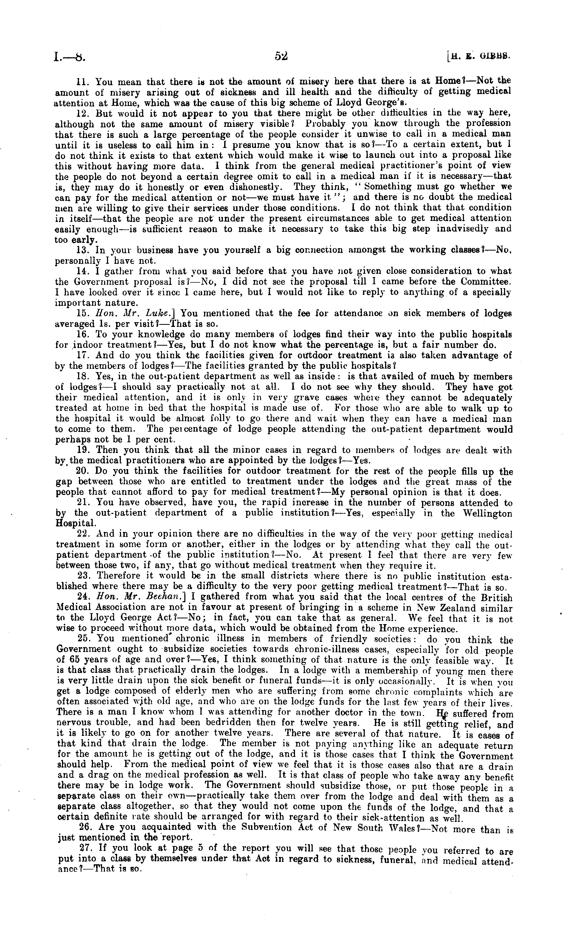 11. You mean that there is not the amount oi misery here that there is at Home? —Not the amount of misery arising out of sickness and ill health and the difficulty of getting medical attention at Home, which was the cause of this big scheme of Lloyd George's. 12. But would it not appear to you that there might be other difficulties in the way here, although not the same amount of misery visible? Probably you know through the profession that there is such a large percentage of the people consider it unwise to call in a medical man until it is useless to call him in: I presume you know that is so? —To a certain extent, but 1 do not think it exists to that extent which would make it wise to launch out into a proposal like this without having more data. I think from the general medical practitioner's point of view the people do not beyond a certain degree omit to call in a medical man if it is necessary —that is, they may do it honestly or even dishonestly. They think, " Something must go whether we can pay for the medical attention or not —we must have it, "; and there is no doubt the medical men are willing to give their services under those conditions. Ido not think that that condition in itself —that the people are not under the present circumstances able to get medical attention easily enough—is sufficient reason to make it necessary to take this big step inadvisedly and too early. 13. In your business have you yourself a big connection amongst the working classes? —No, personally I have not. 14. I gather from what you said before that you have not given close consideration to what the Government proposal is? —No, I did not see the proposal till I came before the Committee. I have looked over it since I came here, but I would not like to reply to anything of a specially important nature. 15. lion. Mr. Luhe.\ You mentioned that the fee for attendance on sick members of lodges averaged Is. per visit? —That is so. 16. To your knowledge do many members of lodges find their way into the public hospitals for indoor treatment ?—Yes, but I do not know what the percentage is, but a fair number do. 17. And do you think the facilities given for outdoor treatment is also taken advantage of by the members of lodges?— The facilities granted by the public hospitals'! 18. Yes, in the out-patient department as well as inside : is that availed of much by members of lodges? —I should say practically not at all. I do not see why they should. They have got their medical attention, and it is only in very grave cases where they cannot be adequately treated at home in bed that the hospital is made use of. For those who are able to walk up to the hospital it would be almost folly to go there and wait when they can have a medical man to come to them. The peicentage of lodge people attending the out-patient department would perhaps not be 1 per cent. 19. Then you think that all the minor cases in regard to members of lodges are dealt with bythe medical practitioners who are appointed by the lodges?— Yes. 20. Do you think the facilities for outdoor treatment for the rest of the people fills up the gap between those who are entitled to treatment under the lodges and the great mass of the people that cannot afford to pay for medical treatment?—My personal opinion is that it does. 21. You have observed, have you, the rapid increase in the number of persons attended to by the out-patient department of a public institution? —Yes, especially in the Wellington Hospital. 22. And in your opinion there are no difficulties in the way of the very poor getting medical treatment in some form or another, either in the lodges or by attending what they call the outpatient department of the public institution? —No. At present I feel that there are very few between those two, if any, that go without medical treatment when they require it. 23. Therefore it would be in the small districts where there is no public institution established where there may be a difficulty to the very poor getting medical treatment?— That is so. 24. Hon. Mr. Beehaii.] I gathered from what you said that the local centres of the British Medical Association are not in favour at present of bringing in a scheme in New Zealand similar to the Lloyd George Act?—No; in fact, you can take that as general. We feel that it is not wise to proceed without more data, which would be obtained from the Home experience. 25. You mentioned* chronic illness in members of friendly societies: do you think the Government ought to subsidize societies towards chronic-illness cases, especially for old people of 65 years of age and over? —Yes, I think something of that nature is the only feasible way. It is that class that practically drain the lodges. In a lodge with a membership of young men there is very little drain upon the sick benefit or funeral funds—it is only occasionally. It is when yon get a lodge composed of elderly men who are suffering from some chronic complaints which arc often associated w;th old age, and who are on the lodge funds for the last few years of their lives. There is a man I know whom I was attending for another doctor in the town." He suffered from nervous trouble, and had been bedridden then for twelve years. He is still getting relief, and it is likely to go on for another twelve years. There are several of that nature. It is cases of that kind that drain the lodge. The member is not paying anything like an adequate return for the amount he is getting out of the lodge, and it is those cases that I think the Government should help. From the medical point of view we feel that it is those cases also that are a drain and a drag on the medical profession as well. It is that class of people who take away any benefit there may be in lodge work. The Government should subsidize those, or put those people in a separate class on their own —practically take them over from the lodge and deal with them as a separate class al