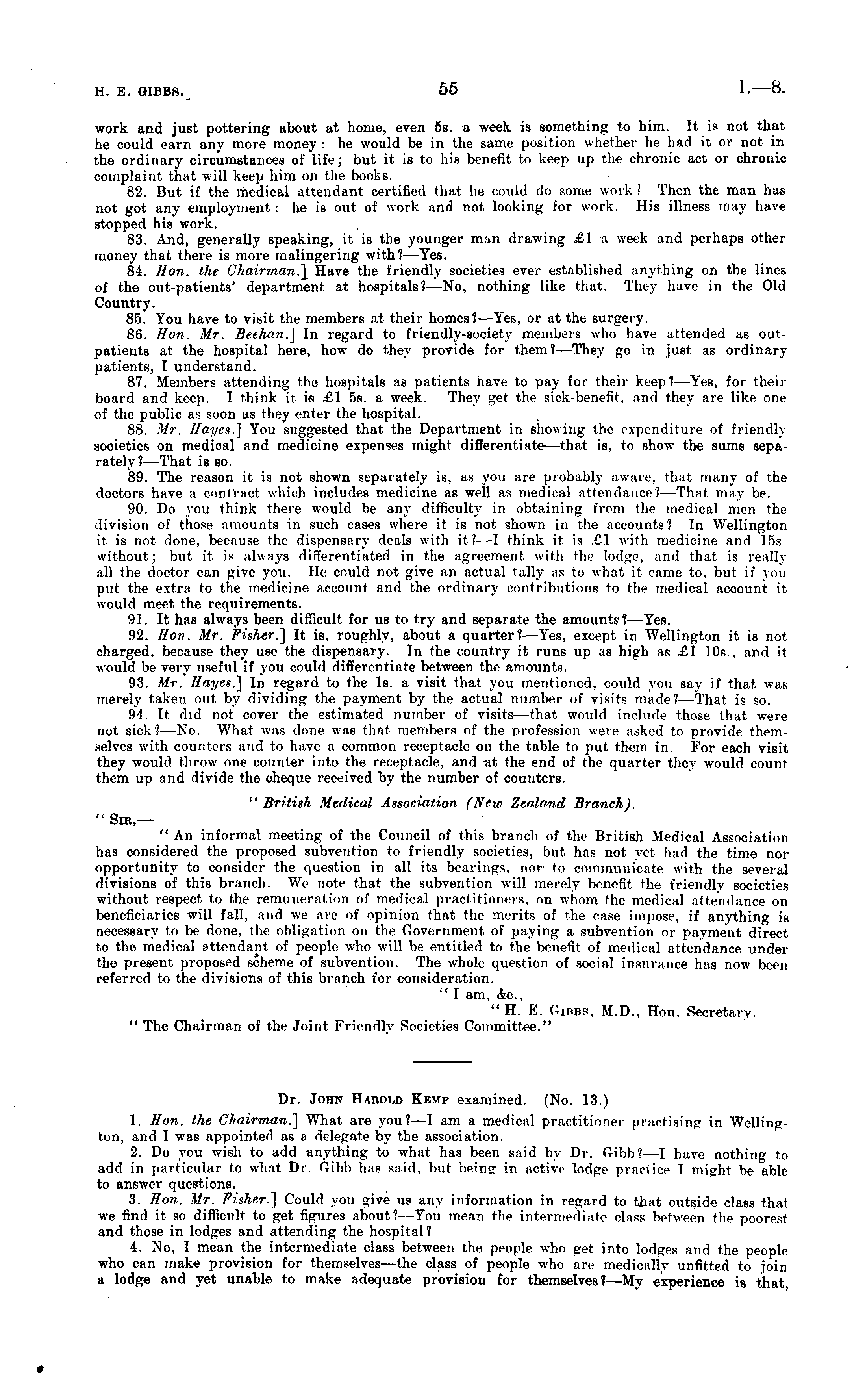 work and just pottering about at home, even ss. a week is something to him. It is not that he could earn any more money : he would be in the same position whether he had it or not in the ordinary circumstances of life; but it is to his benefit to keep up the chronic act or chronic complaint that will keep him on the books. 82. But if the medical attendant certified that he could do some work 1 -Then the man has not got any employment :he is out of work and not looking for work. His illness may have stopped his work. 83. And, generally speaking, it is the younger man drawing £1 a week and perhaps other money that there is more malingering with?— Yes. 84. Hon. the Chairman.\ Have the friendly societies ever established anything on the lines of the out-patients' department at hospitals?—No, nothing like that. They have in the Old Country. 85. You have to visit the members at their homes? —Yes, or at the surgery. 86. Hon. Mr. Beehan.] In regard to friendly-society members who have attended as outpatients at the hospital here, how do they provide for them? —They go in just as ordinary patients, I understand. 87. Members attending the hospitals as patients have to pay for their keep?— Yes, for their board and keep. I think it i« £1 ss. a week. They get thp sick-benefit, and they are like one of the public as soon as they enter the hospital. 88. Mr. Hayes] You suggested that the Department in snowing the expenditure of friendly societies on medical and medicine expenses might differentiate—that is, to show the sums separately?— That is so. 89. The reason it is not shown separately is, as you are probably aware, that many of the doctors have a oontraot which includes medicine as well as medical attendance? —That may be. 90. Do you think there would be any difficulty in obtaining from the medical men the division of those amounts in such cases where it is not shown in the accounts? In Wellington it is not done, because the dispensary deals with it?—l think it is £1 with medicine and 15s. without; but it is always differentiated in the agreement with the lodge, and that is really all the doctor can give you. He could not give an actual tally as to what it came to, but if yon put the extra to the medicine account and the ordinary contributions to the medical account it would meet the requirements. 91. It has always been difficult for us to try and separate the amounts? —Yes. 92. Hon. Mr. Fisher.] It is, roughly, about a quarter? —Yes, except in Wellington it is not charged, because they use the dispensary. In the country it runs up as high as £1 10s., and it would be very useful if you could differentiate between the amounts. 93. Mr. Hrtyes.] In regard to the Is. a visit that you mentioned, could you say if that was merely taken out by dividing the payment by the actual number of visits made? —That is so. 94. It did not cover the estimated number of visits—that would include those that were not sick? —No. What was done was that members of the profession wove asked to provide themselves with counters and to have a common receptacle on the table to put them in. For each visit they would throw one counter into the receptacle, and at the end of the quarter they would count them up and divide the cheque received by the number of counters. " British Medical Association (Nfw Zealand Branch). "Sir,— " An informal meeting of the Council of this branch of the British Medical Association has considered the proposed subvention to friendly societies, but has not yet had the time nor opportunity to consider the question in all its bearings, nor to communicate with the several divisions of this branch. We note that the subvention will merely benefit the friendly societies without respect to the remuneration of medical practitioners, on whom the medical attendance on beneficiaries will fall, and we are of opinion that the merits of the case impose, if anything is necessary to be done, the obligation on the Government of paying a subvention or payment direct to the medical attendant of people who will be entitled to the benefit of medical attendance under the present proposed scheme of subvention. The whole question of social insurance has now been referred to the divisions of this branch for consideration. " I am, &c., " H. E. OinßS. M.D., Hon. Secretary. " The Chairman of the Joint Friendly Societies Committee."