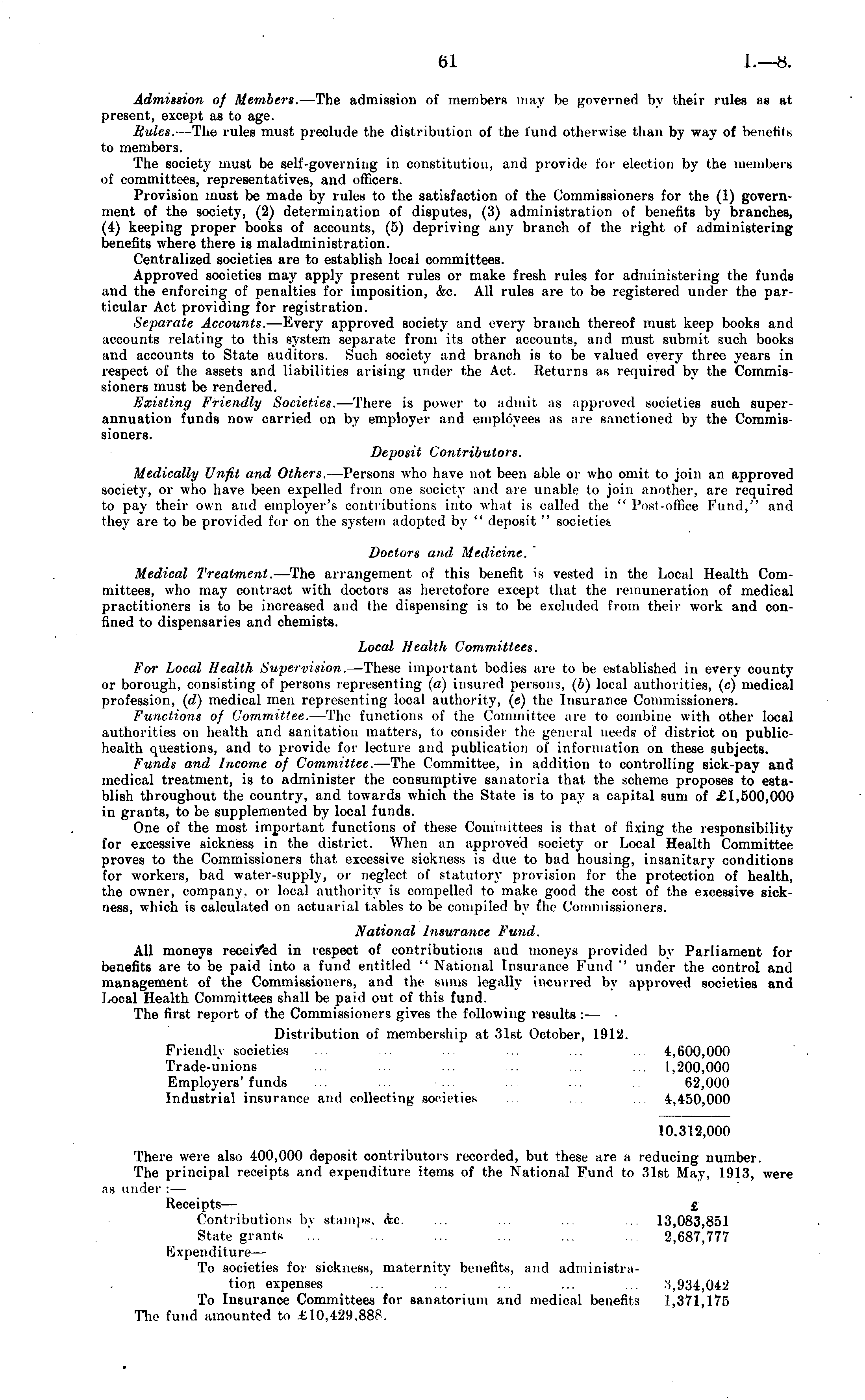 Admission of Members. —The admission of members may be governed by their rules ac at present, except as to age. Rulet.—The rules must preclude the distribution of the fund otherwise than by way of benefits to members. The society must be self-governing in constitution, und provide for election by the members of committees, representatives, and officers. Provision must be made by rules to the satisfaction of the Commissioners for the (1) government of the society, (2) determination of disputes, (3) administration of benefits by branches, (4) keeping proper books of accounts, (5) depriving any branch of the right of administering benefits where there is maladministration. Centralized societies are to establish local committees. Approved societies may apply present rules or make fresh rules for administering the funds and the enforcing of penalties for imposition, &c. All rules are to be registered under the particular Act providing for registration. Separate Accounts. —Every approved society and every branch thereof must keep books and accounts relating to this system separate from its other accounts, and must submit such books and accounts to State auditors. Such society and branch is to be valued every three years in respect of the assets and liabilities arising under the Act. Returns as required by the Commissioners must be rendered. Existing Friendly Societies. —There is power to admit as approved societies such superannuation funds now carried on by employer and employees as are sanctioned by the Commissioners. Deposit Contributors. Medically Unfit und Others. —Persons who have not been able or who omit to join an approved society, or who have been expelled from one society and are unable to join another, are required to pay their own and employer's contributions into what is called the " Post-office Fund," and they are to be provided for on the system adopted by " deposit " societies Doctors and Medicine. ' Medical Treatment. —The arrangement of this benefit is vested in the Local Health Committees, who may contract with doctors as heretofore except that the remuneration of medical practitioners is to be increased and the dispensing is to be excluded Prom their work and confined to dispensaries and chemists. Local Health Committees. For Local Health Supervision. —These important bodies are to be established in every county or borough, consisting of persons representing (a) insured persons, (b) local authorities, (c) medical profession, (d) medical men representing local authority, (c) the Insurance Commissioners. Functions of Committee. —The functions of the Committee are to combine with other local authorities on health and sanitation matters, to consider the general ueods of district on publichealth questions, and to provide for lecture and publication of information on these subjects. Funds and Income of Committee. —The Committee, in addition to controlling sick-pay and medical treatment, is to administer the consumptive sanatoria that the scheme proposes to establish throughout the country, and towards which the State is to pay a capital sum of £1,500,000 in grants, to be supplemented by local funds. One of the most important functions of these Committees is that of Using the responsibility for excessive sickness in the district. When an approved society or Local Health Committee proves to the Commissioners that excessive sickness is due to bad housing, insanitary conditions for workers, bad water-supply, or neglect of statutory provision for the protection of health, the owner, company, or local authority is compelled to make good the cost of the excessive sickness, which is calculated on actuarial tables to be compiled by fhe Commissioners. National Insurance Fund. All moneys received in respect of contributions and moneys provided by Parliament for benefits are to be paid into a fund entitled " National Insurance Fund " under the control and management of the Commissioners, and the sums legally incurred by approved societies and Local Health Committees shall be paid out of this fund. The first report of the Commissioners gives the following results : — ■ Distribution of membership at 31st October, 1912. Friendly societies ... ... ... .., ... 4,600,000 Trade-unions ... ... ... ... ... ... 1,200,000 Employers'funds ... ... ... .. 62,000 Industrial insurance and collecting societies ... ... 4.450,000 10.312,000 There were also 400,000 deposit contributors recorded, but these are a reducing number. The principal receipts and expenditure items of the National Fund to 31st May, 1913, were as under :— Receipts — £ Contributions by stamps. &c. ... ... ... ... 13,083,851 State grants ... ... ... ... ... ... 2,687,777 Expenditure — To societies for sickness, maternity benefits, and administration expenses ... .. ... ... ... -1,934,042 To Insurance Committees for sanatorium and medical benefits 1,371,175 The fund amounted to £10,429,888.