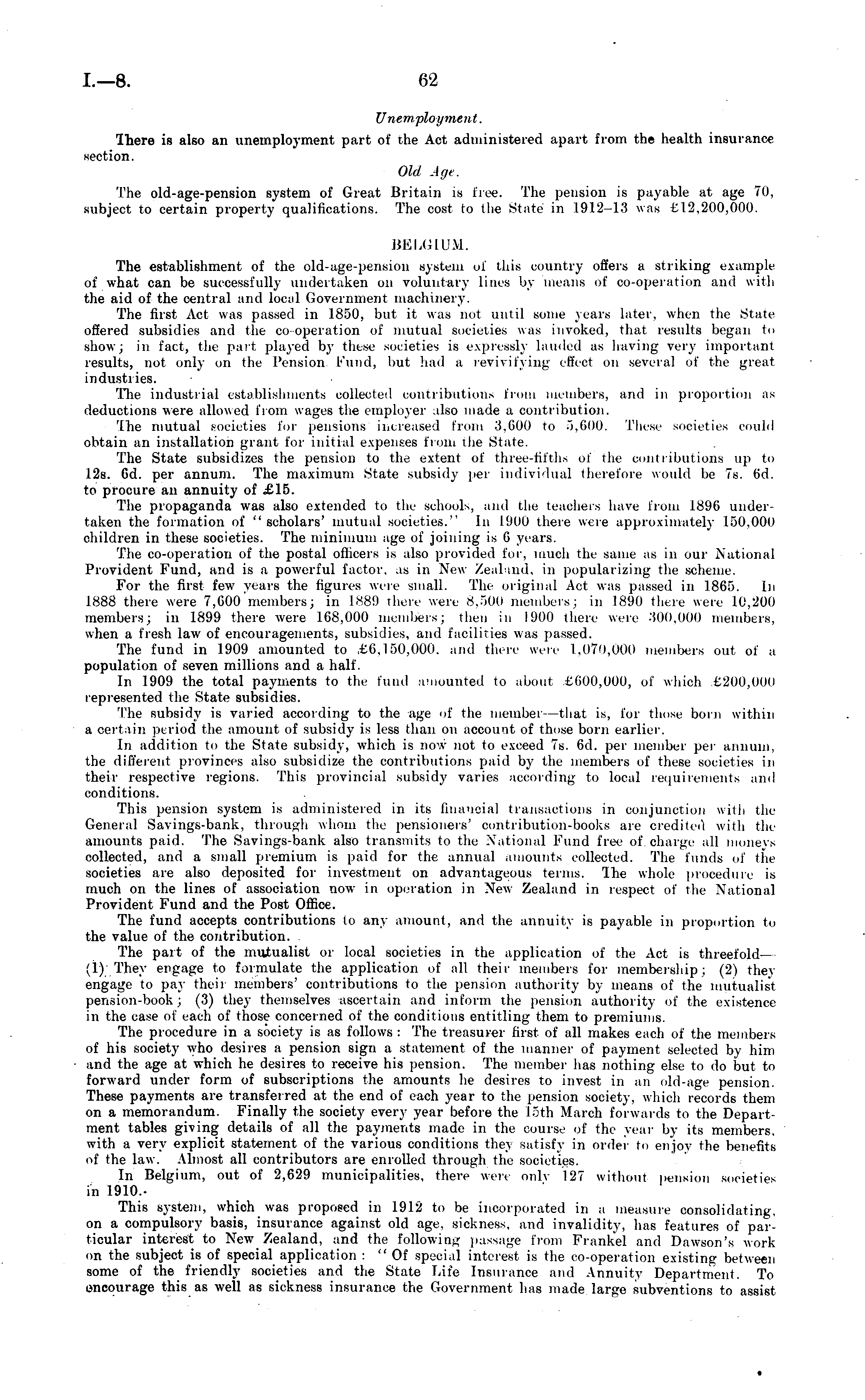 Unemployment. There is also an unemployment part of the Act administered apart from the health insurance section. Old Age, The old-age-pension system of Great Britain is free. The pension is payable at age 70, subject to certain property qualifications. The cost to the State in 1912-13 was £12,200,000. BELGIUM. The establishment of the old-age-pension system of this country offers a striking example of what can be successfully undertaken on voluntary lines by means of co-operation and with the aid of the central and local Government machinery. The first Act was passed in 1850, but it was not until some years later, when the State offered subsidies and the co operation of mutual societies was invoked, that results began to show; in fact, the part played by these societies is expressly lauded as having very important results, not only on the Pension fund, but had a revivifying effect mi several of the great industries. The industrial establishments collected contributions from members, ami in proportion as i led notions were allowed from wages the employer also made a contribution. The mutual societies for pensions increased from 3,G00 to 5,600. These societies could obtain an installation grant for initial expenses from the State. The State subsidizes the pension to the extent of three-filths of the contributions up to 12s. Gd. per annum. The maximum State subsidy per individual therefore would be 7s. 6d. to procure an annuity of £15. The propaganda was also extended to the school., and the teachers have Mum 1896 undertaken the formation of "scholars' mutual societies." In 1900 there were approximately 150,000 children in these societies. The minimum age of joining is G years. The co-operation of the postal officers is also provided Eor, much the same as in our National Provident Fund, and is a powerful factor, as in New Zealand, in popularizing the scheme. For the first few years the figures were small. The original Aci was passed in 1865. In 1888 there were 7,6oo'members; in 1889 there were 8,500 members; in 1890 there were 10,200 members; in 1899 there were 168,000 members; then in 1000 there were 300,000 members, when a fresh law of encouragements, subsidies, and facilities was passed. The fund in 1909 amounted to £6,150,000, and there were 1,070,000 members out of a population of seven millions and a half. In 1909 the total payments to the fund amounted to about £000,000, of which £200,000 represented the State subsidies. The subsidy is varied according to the age of the member that is, for those born within a oeri lin period the amount of subsidy is less than on account of those born earlier. In addition to the State subsidy, which is now not to exceed 7s. 6d. per member per annum. the different provinces also subsidize the contributions paid by the members of these societies in their respective regions. This provincial subsidy varies according to local requirements and conditions. This pension system is administered in its financial transactions in conjunction with the General Savings-bank, through whom the pensioners' contribution-books are credited with the amounts paid. The Savings-bank also transmits to the National Fund free of . charge all moneys collected, and a small premium is paid for the annual amounts collected. The funds of the societies are also deposited for investment on advantageous terms. The whole procedure is much on the lines of association now in operation in New Zealand in respect of the National Provident Fund and the Post Office. The fund accepts contributions to any amount, and the annuity is payable in proportion to the value of the contribution. The part of the muiualist or local societies in the application of the Act is threefold— (1) They engage to formulate the application of all their members for membership; (2) they engage to pay their members' contributions to the pension authority by means of the mutualis'i pension-book; (3) they themselves ascertain and inform the pension authority of the existence in the case of each of those concerned of the conditions entitling them to premiums. The procedure in a society is as follows : The treasurer first of all makes each of the members of his society who desires a pension sign a statement of the manner of payment selected by him and the age at which he desires to receive his pension. The member has nothing else to do but to forward under form of subscriptions the amounts he desires to invest in an old-age pension. These payments are transferred at the end of each year to the pension society, which records them on a memorandum. Finally the society every year before the 15th March forwards to the Department tables giving details of all the payments made in the course of the year by its members, with a very explicit statement of the various conditions they satisfy in order i>> enjoy the benefits of the law. Almost all contributors are enrolled through the societies. In Belgium, out of 2,629 municipalities, there were only 127 without pension societies in 1910.This system, which was proposed in 1912 to be incorporated in a measure consolidating, on a compulsory basis, insurance against old age, sickness, and invalidity, has features of particular interest to New Zealand, and the following passage from Frankel and Dawson's work on the subject is of special application : "Of special interest is the co-operation existing between some of the friendly societies and the State Life Insurance and Annuity Department. To encourage this as well as sickness insurance the Government has made large subventions to assist