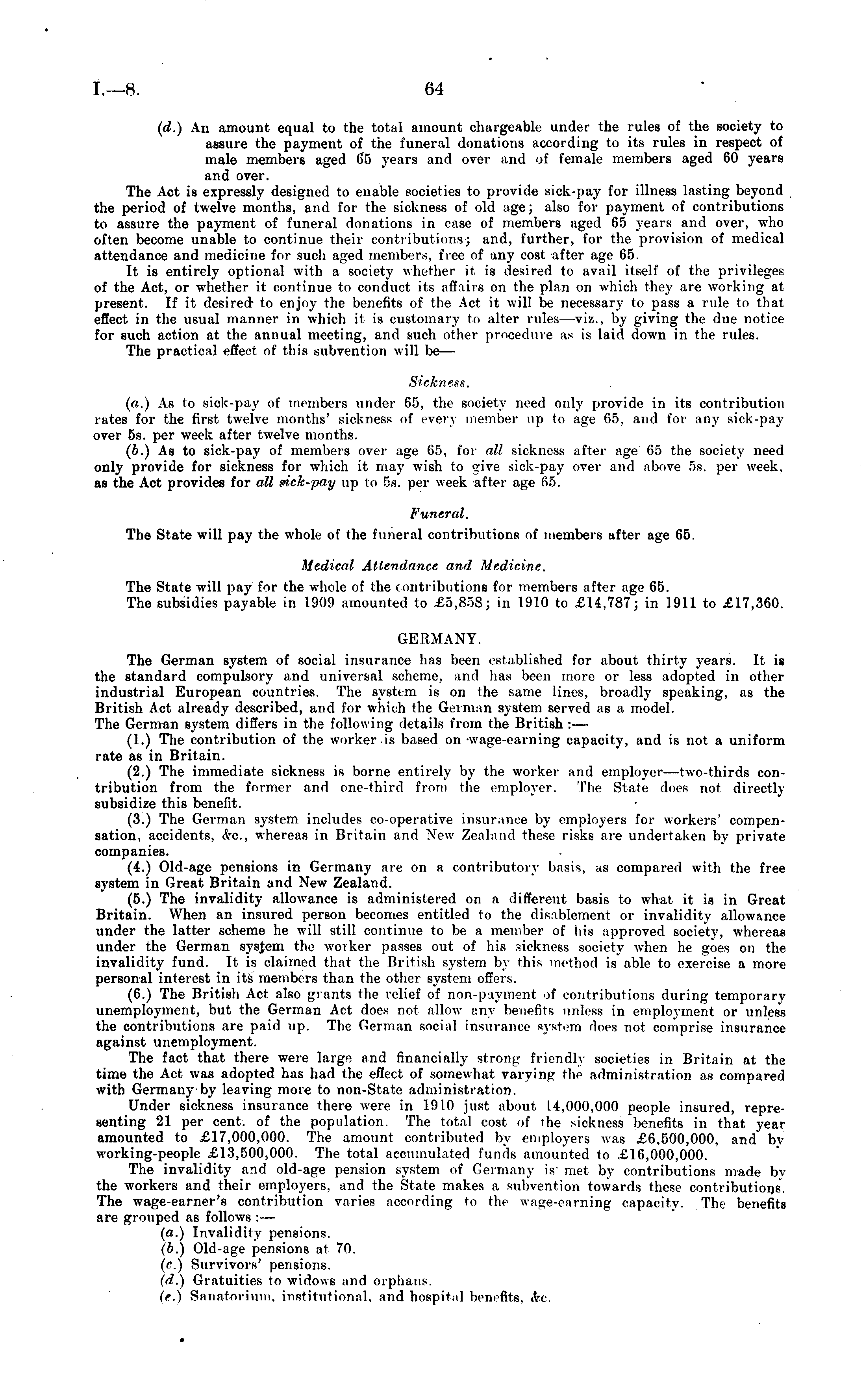 (d.) An amount equal to the total amount chargeable under the rules of the society to assure the payment of the funeral donations according to its rules in respect of male members aged 65 years and over and of female members aged 60 years and over. The Act is expressly designed to enable societies to provide sick-pay for illness lasting beyond the period of twelve months, and for the sickness of old age; also for payment of contributions to assure the payment of funeral donations in case of members aged 65 years and over, who often become unable to continue their contributions; and, further, for the provision of medical attendance and medicine for such aged members, free of any cost after age 65. It is entirely optional with a society whether it is desired to avail itself of the privileges of the Act, or whether it continue to conduct its affairs on the plan on which they are working at present. If it desired - to enjoy the benefits of the Act it will be necessary to pass a rule to that effect in the usual manner in which it is customary to alter rules—viz., by giving the due notice for such action at the annual meeting, and such other procedure as is laid down in the rules. The practical effect of this subvention will be — Sickness. (a.) As to sick-pay of members under 65, the society need only provide in its contribution rates for the first twelve months' sickness of every member up to age 65, and for any sick-pay over ss. per week after twelve months. (b.) As to sick-pay of members over age 65, for all sickness after age 65 the society need only provide for sickness for which it may wish to give sick-pay over and above ss. per week, as the Act provides for all stick-pay up to ss. per week after age 65. Funeral. The State will pay the whole of the funeral contributions of members after age 65. Medical Attendance and Medicine. The State will pay for the whole of the contributions for members after age 65. The subsidies payable in 1909 amounted to £5,858; in 1910 to £14,787; in 1911 to £17,360. GERMANY. The German system of social insurance has been established for about thirty years. It is the standard compulsory and universal scheme, and has been more or less adopted in other industrial European countries. The system is on the same lines, broadly speaking, as the British Act already described, and for which the German system served as a model. The German system differs in the following details from the British : — (1.) The contribution of the worker-is based on -wage-earning capacity, and is not a uniform rate as in Britain. (2.) The immediate sickness is borne entirely by the worker and employer —two-thirds contribution from the former and one-third from the employer. The State does not directly subsidize this benefit. (3.) The German system includes co-operative insurance by employers for workers' compensation, accidents, See, whereas in Britain and New Zealand these risks are undertaken by private companies. (4.) Old-age pensions in Germany are on a contributory basis, as compared with the free system in Great Britain and New Zealand. (5.) The invalidity allowance is administered on a different basis to what it is in Great Britain. When an insured person becomes entitled to the disablement or invalidity allowance under the latter scheme he will still continue to be a member of his approved society, whereas under the German system the worker passes out of his sickness society when he goes on the invalidity fund. It is claimed that the British system by this method is able to exercise a more personal interest in its members than the other system offers. (6.) The British Act also grants the relief of non-payment of contributions during temporary unemployment, but the German Act does not allow any benefits unless in emplo\ment or unless the contributions are paid up. The German social insurance system does not comprise insurance against unemployment. The fact that there were large and financially strong friendly societies in Britain at the time the Act was adopted has had the effect of somewhat varying the administration as compared with Germany by leaving more to non-State administration. Under sickness insurance there were in 1910 just about 14,000,000 people insured, representing 21 per cent, of the population. The total cost of the sickness benefits in that year amounted to £17,000,000. The amount contributed by employers was £6,500,000, and' by working-people £13,500,000. The total accumulated funds amounted to £16,000,000. The invalidity and old-age pension system of Germany is met by contributions made by the workers and their employers, and the State makes a subvention towards these contributions. The wage-earner's contribution varies according to the wage-earning capacity. The benefits are grouped as follows : — (a.) Invalidity pensions. (b.) Old-age pensions at 70. (c.) Survivors' pensions. (d.) Gratuities to widows and orphans. (c.) Sanatorium, institutional, and hospital benefits. &o.