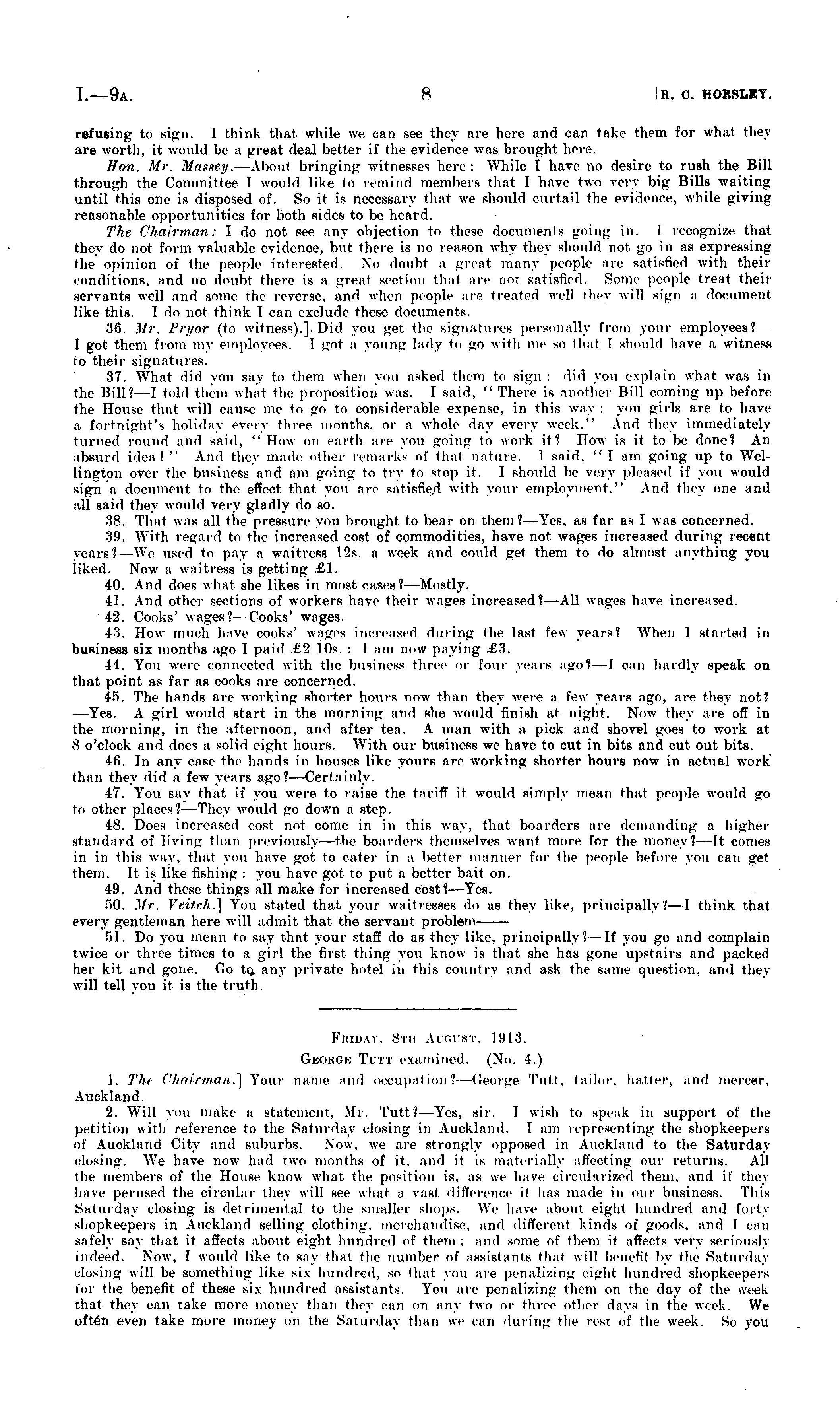 Friday. Bth AUGUST, 1913. Geokgk Tutt examined. (No. 4.) 1. Tin Chairman.] Your name and occupation ?—George Tutt. tailor, hatter, and mercer, Auckland. 2. Will vim make a statement, Mr. Tutt?—Yes, sir. I wish to speak in support of the petition with referenoe to the Saturday elnsing in Auckland. I am representing the shopkeepers of Auckland City and suburbs. Now, we are strongly opposed in Auckland to the Saturday closing. We have now hail two months of it. and it is materially affecting our returns. All the members of the House know what the position is. as we have circularized them, and if they have perused the circular they will see what a vast difference it has made in our business. This Saturday closing is detrimental to the smaller shops. We have about eight hundred and forty shopkeepers in Auckland selling clothing, merchandise, and different kinds of goods, and 1 can safely say that it affects about eight hundred of them ; and some of them it affects very serioush indeed. Now, I would like to say that the number of assistants that will benefit by the Saturday closing «ill be something like six hundred, so that you are penalizing eight hundred shopkeepers for the benefit of these six hundred assistants. You are penalizing them on the day of the \\e<-k thai they can take more money than they can on any two or 1 hi< ther days in the week. We often even take more money on the Saturday than we can during the rest of the week. So you