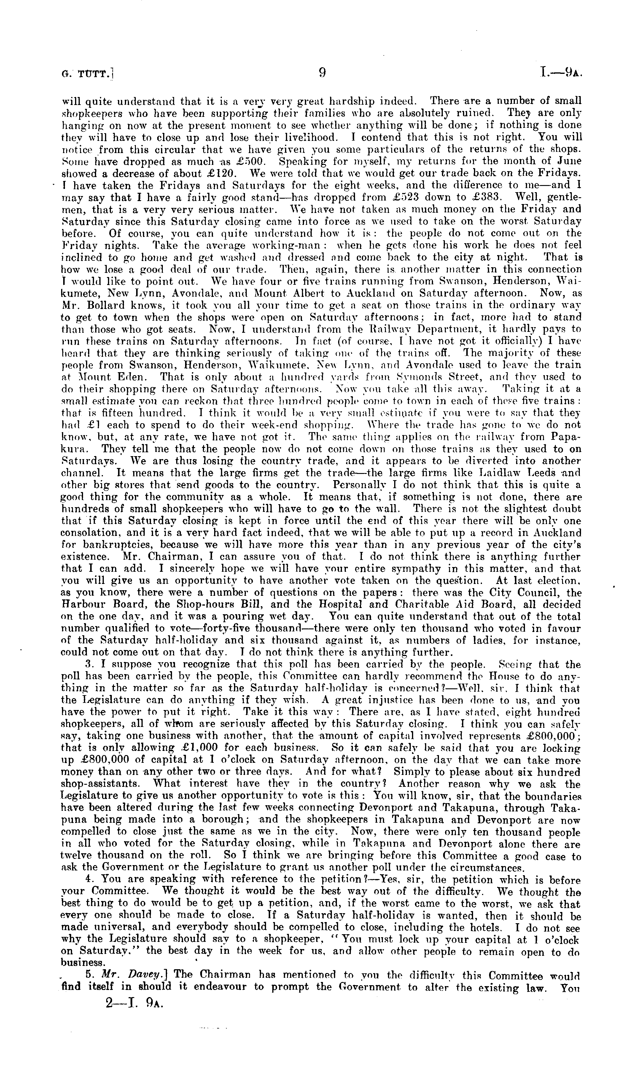 will quite understand thai it is a \rery v< ry greal hardship indeed. There are a number of small shopkeepers who have been supporting their families who are absolutely ruined. They are only hanging on now at the preseni monieni to see whether anything will be done; if nothing is done they will have to close up and lose their livelihood. I contend that this is not right. You will notice from this circular that we have given yon some particulars of the returns of the shops. Some have dropped as much as £500. Speaking for myself, my returns for the month of June showed a decrease of about £120. We were told thai we would gel our trade back on the Fridays. I have taken the Fridays and Saturdays for the eight weeks, and the difference to me — and 1 may say that I have a fairly good stand —has dropped from £523 down to £383. Well, gentlerum, that is a very very serious matter. We have not taken as much money on the Friday and Saturday since this Saturday closing came into force as we used to take on the worst- Saturday before. Of course, you can quite understand how it is: the people do not come out on the Friday nights. Take the average working-man : when lie gets done his work he does not feel inclined to go home and gel washed and dressed and come hack to the city at night. That is how we lose a good deal of our trade. Then, again, there is another matter in this connection 1 would like to point out. We have Four or five trains running from Swaneon, Henderson, Waikumete, New Lynn, Avondale, and Mount Albert to Auckland on Saturday afternoon. Now, as Mr. Bollard knows, it took yon all your time to gel trains in the ordinary waxto get to town when the shops were open on Saturday afternoons; in fact, more had to stand than those who got seats. Now. I understand from the Railway Department, it hardly paj to run these trains on Saturday afternoons. In fad (of course, I have not got it officially) 7 have ■ ! that they are thinking seriously of taking one of the trains off. The majority of these people from Swanson, Henderson, Waikumete, New Lynn, and .Avondale used to leave the ti at Mount Eden. That is only about a hundred yards from Symonds Street, and they used to do their shopping there on Saturday afternoons. Now \<>u take all this away. Taking it at a i! estimate you can reckon that three hundred people a own in each of these live trains: that is fifteen hundred. I think it would be a very t< if you were to say that they had £1 each to spend to do their week-end shopping. Where the trade has gone to we do not know, but, at any rate, we have nol got it. Thi applies on the railway from Papakura. They tell me that the people now do not come down on those trains as they used to on Saturdays. We are thus losing the country trade, and it appears to be diverted into another channel. It means that the large firms get the trade—the large firms like Laidlaw Leeds and other big stores that send goods to the country. Personally I do not think that this is quite a good thing for the community as a whole. It means that, if something is not done, there are hundreds of small shopkeepers who will have to <>r> to the wall. There is not the slightest doubt that if this Saturday closing is kept in force until the end of this year there will be only one consolation, and it is a very hard fact indeed, that we will be able to put up a record in Auckland for bankruptcies, because we will have more this year than in any previous year of the city's existence. Mr. Chairman, I can assure you of that. I do not think there is an3'thing further that I can add. I sincerely hope we will have your entire sympathy in this matter, and that you will give us an opportunity to have another vote taken on the question. At last election, as you know, there were a number of questions on the papers : there was the City Council, the Harbour Board, the Shop-hours Bill, and the Hospital and Charitable Aid Board, all decided on the one day. and it was a pouring wet day. You can quite understand that out of the total number qualified to vote—forty-five thousand—there were only ten thousand who voted in favour of the Saturday half-holiday and six thousand against it, as numbers of ladies, for instance, could not come out on that day. Ido not think there is anything further. 3. I suppose you recognize that this poll has been carried by the people. Seeing that the poll has been carried by the people, this Committee can hardly recommend the House to do anything in the matter so far as the Saturday half-holiday is concerned?— Well, sir, I think that the Legislature can do anything if they wish. A great injustice has been done to us. and you have the power to put it right. Take it this way: There are. as I have slated, eighi hundred shopkeepers, all of wlrom are seriously affected by this Saturday closing. I think you can safely say, taking one business with another, that the amount of capital involved represents £800,000; that is only allowing £1,000 for each business. So it can safely be said that you are locking up £800.000 of capital at 1 o'clock on Saturday afternoon, on the day that we can take mine money than on any other two or three days. And for what? Simply to please about six hundred shop-assistants. What interest have they in the country? Another reason why we ask the Legislature to give us another opportunity to vote is this : Yon will know, sir. that the boundaries have been altered during the last few weeks connecting Devonpori and Takapuna, through Takapuna being made into a borough ; and the shopkeepers in Takapuna and Devonport are now compelled to close just the same as we in the city. Now, there were only ten thousand people in all who voted for the Saturday closing, while in Tnknpuna and Devonport alone there are twelve thousand on the roll. So I think we are bringing before this Committee a good case to ask the Government or the Legislature to grant us another poll under the circumstances. 4. You ar