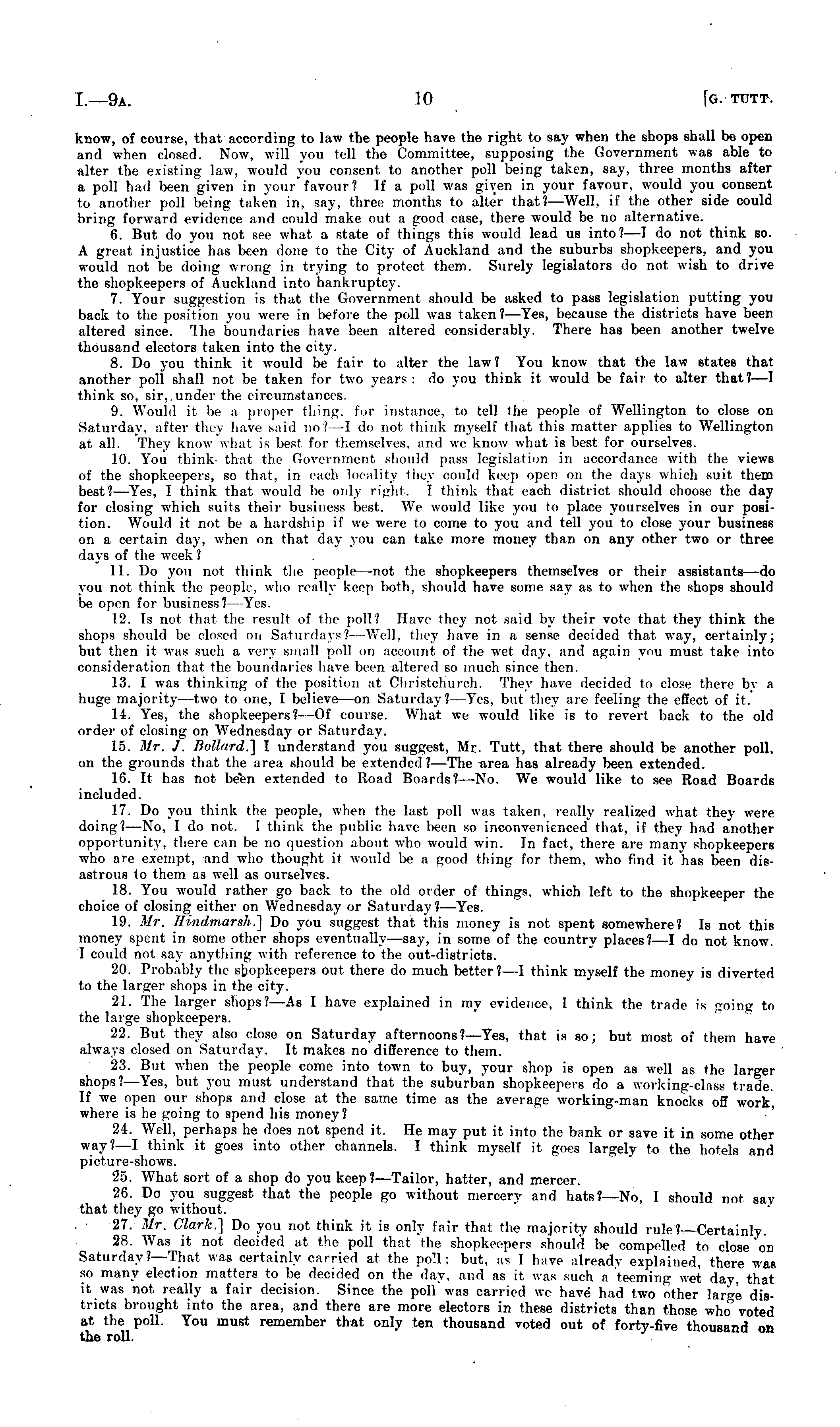 know, of course, that according to law the people have the right to say when the shops shall be open and when closed. Now, will you tell the Committee, supposing the Government was able to alter the existing law, would you consent to another poll being taken, say, three months after a poll had been given in your favour? If a poll was given in your favour, would you consent to another poll being taken in, say. three months to alter that? —Well, if the other side could bring forward evidence and oould make out a good case, there would be no alternative. 6. But do you not see what a state of things this would lead us into? —I do not think so. A great injustice has been done to the City of Auckland and the suburbs shopkeepers, and you would not be doing wrong in trying to protect them. Surely legislators do not wish to drive the shopkeepers of Auckland into bankruptcy. 7. Your suggestion is that the Government should be asked to pass legislation putting you back to the position you were in before the poll was taken? —Yes, because the districts have been altered since, '[he boundaries have been altered considerably. There has been another twelve thousand electors taken into the city. 8. Do you think it would be fair to alter the law? You know that the law states that another poll shall not be taken for two years: do you think it would be fair to alter that? —1 think so, sir,.under the circumstances. 9. Would it be a proper thing, for instance, to tell the people of Wellington to close on Saturday, after they h l noi— l do not think myself that this matter applies to Wellington at all. They know what is beet for themselves, and we know what is best for ourselves. 10. You think' that the Government should pass legislation in accordance with the views of the shopkeepers, so that, in each Ideality they could keep open on the days which suit them best?— Yes, I think that would be only right. 1 think that each district should choose the day for closing which suits their business best. We would like you to place yourselves in our position. Would it not be a hardship if we were to come to you and tell you to close your business on a certain day, when on that day you can take more money than on any other two or three days of the week ? 11. Do you not think the people —not the shopkeepers themselves or their assistants—do you not think the people, who really keep both, should have some say as to when the shops should be open for business? —Yes. 12. Is not that the result of the poll? Have they not said by their vote that they think the shops should be closed on Saturdays'--Well, they have in a sense decided that way, certainly; but then it was such a very small poll on account of the wet day. and again you must take into consideration that the boundaries have been altered bo much since then. 13. I was thinking of the position at Christchurch. They have decided to close there by a huge majority— two to ore. I believe —on Saturday?— Yes, but they are feeling the effect of it. 14. Yes, the shopkeepers?—Of course. What we would like is to revert back to the old order of closing on Wednesday or Saturday. 15. Mr. J. Bollard.] I understand you suggest, Mr. Tutt, that there should be another poll, on the grounds that the area should be extended?— The area has already been extended. 16. It has not be'en extended to Road Boards?— No. W T e would like to see Road Boards included. 17. Do you think the people, when the last poll was taken, really realized what they were doing?—No, Ido not. I think the public have been so inconvenienced that, if they had another opportunity, there can be no question about who would win. In fact, there are many shopkeepers who are exempt, and who thought it would be a good thing for them, who find it has been disastrous to them as well as ourselves. 18. You would rather go back to the old order of things, which left to the shopkeeper the choice of closing either on Wednesday or Saturday?— Yes. 19. Mr. Ifindmarsh.] Do you suggest that this money is not spent somewhere? Is not this money spent in some other shops eventually—say, in some of the country places?—l do not know. I could not say anything with reference to the out-districts. 20. Probably the shopkeepers out there do much better ?—I think myself the money is diverted to the larger shops in the city. 21. The larger shops?—As I have explained in my evidence, I think the trade is going to the large shopkeepers. 22. But they also close on Saturday afternoons?— Yes, that is so; but most of them have always closed on Saturday. It makes no difference to them. 23. But when the people come into town to buy, your shop is open as well as the larger shops?— Yes, but you must understand that the suburban shopkeepers do a working-class trade. If we open our shops and close at the same time as the average working-man knocks off work, where is he going to spend his money? 24. Well, perhaps he does not spend it. He may put it into the bank or save it in some other way?—l think it goes into other channels. I think myself it goes largely to the hotels and picture-shows. 25. What sort of a shop do you keep?— Tailor, hatter, and mercer. 26. Do you suggest that the people go without mercery and hats?—No, I should not Bay that they go without. 27. Mr. Clark.] Do you not. think it is only fair that the majority should rule? Certainly. 28. Was it not decided at the poll that the shopkeepers should be compelled to close "on Saturday? —That was certainly carried at the poll; but. as 1 have already explained, there was so many election matters to be decided on the day. and as it was such a teeming wet day, that it was not really a fair decision. Since the poll was carried we have had two other large districts brought into the area, and there are more electors in these districts than those who" voted at the poll. You must remember that only ten thousand voted out of forty-five thousand on the roll.
