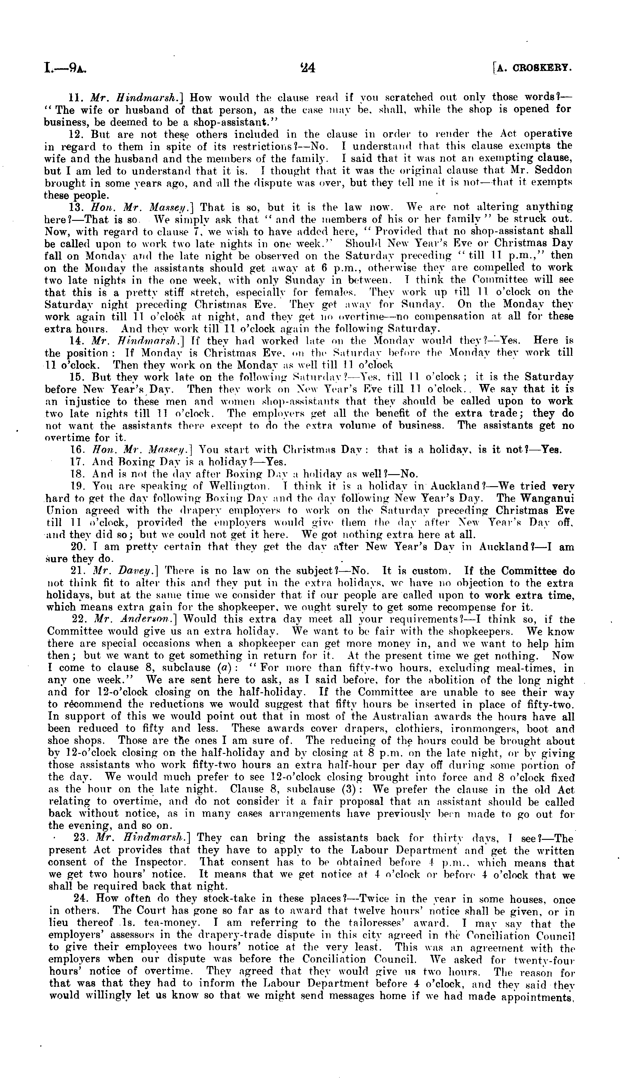 11. Mr. Hindmarsh.\ How would the clause read if you scratched out only those words? — " The wife or husband of that person, as the case may be. shall, while the shop is opened for business, be deemed to be a shop-assistant." 12. But are not these others included in the clause in order to render the Act operative in regard to them in spite of its restrictions) — No. I understand that this clause exempts the wife and the husband and the members of the family. I said that it was not an exempting clause, but I am led to understand that it is. I thought thai it was the original clause that Mr. Seddon brought in some years ago, and all the dispute was over, but they tell me it is not — thai it exempts these people. 13. Hon. Mr. Massei/.] That is so, but it is the law now. We are not altering anything here?— That is so We simply ask thai " and the members of his or her family "be struck out. Now, with regard to clause 7. we wish to have added here, " Provided that no shop-assistant shall be called upon to work two late nights in one week. , ' Should New Year's Eve or Christmas Day fall on Mohdaj arid the late night be observed on the Saturday preceding "till 11 p.m.," then on the Monday the assistants should get away at 6 p.m., other-wise they are compelled to work two late nights in the one week, with only Sunday in between. I think the Committee will see that this is a pretty stiff stretch, especially for females. They work up till II o'clock on the Saturday nighl preceding Christmas Eve. They get away for Sunday. On the Monday they work again till 1 1 o'clock at night, and they get no overtime—no compensation at all for these extra hours. And they work till 11 o'clock again the following Saturday. 14. Mr. Hin<l nxirxli.\ If they had worked late on the Monday would they?--Yes. Here is the position : If Monday is Christmas Eve. on the Saturday before the Monday they work till 11 o'clock. Then they work on the Monday as well till 11 o'clock 15. But they work late on the following Saturday? Yes, till II o'clock; it is the Saturday before New Year's Day. Then they work on New Sear's Eve till II o'clock. We say that it is .m injustice to these men and women shop-assistants that they should be called upon to work two late nights till II o'clock. The employers get all the benefit of the extra trade; they do not want the assistants there except to do the extra volume of business. The assistants get no overtime for it. 16. Hon. Mr. Mousey.] You start with Christmas Day: that is a holiday, is it not?— Yes. 17. And Boxing Day is a holiday?— Yes. 18. And is not the day after Boxing Day a holiday as well? —No. 19. You are speaking of Wellington. 1 think it is a holiday in Auckland?—We tried very hard to get the day following Boxing Day and the day following New Year's Day. The Wanganui Union agreed with the drapery employers to work on the Saturday preceding Christmas Eve till II o'clock, provided the employers would give them the day alter New Year's Day off, and they did so; but we could not <jet it here. We got nothing extra here at all. 20. 1 am pretty certain that they gel the day after New Year's Day in Auckland? —I am sure they do. 21. Mr. Davey.] There is no law on the subject?— No. It is custom. If the Committee do not think fit to alter this and they put in the extra holidays, we have no objection to the extra holidays, but at the same time we consider that if our people are called upon to work extra time, which means extra gain for the shopkeeper, we ought surely to get some recompense for it. 22. Mr. Anderxan.] Would this extra day meet all your requirements?—l think so, if the Committee would give us an extra holiday. We want to be fair with the shopkeepers. We know there are special occasions when a shopkeeper can get more money in, and we want to help him then; but we want to get something in return for it. At the present time we get nothing. Now I come to clause 8, subclause (a) : " For more than fifty-two hours, excluding meal-times, in any one week." We are sent here to ask, as I said before, for the abolition of the long night and for 12-o'clock closing on the half-holida) - . If the Committee are unable to see their way to recommend the reductions we would suggest that fifty hours be inserted in place of fifty-two. In support of this we would point out that in most of the Australian awards the hours have all been reduced to fifty and less. These awards cover drapers, clothiers, ironmongers, boot and shoe shops. Those are the ones lam sure of. The reducing of the hours could be brought about by 12-o'clock closing on the half-holiday and by closing at 8 p.m. on the late night, or by giving those assistants who work fifty-two hours an extra half-hour per day off during some portion of the day. We would much prefer to see 12-o'clock closing brought into force and 8 o'clock fixed as the hour on the late night. Clause 8, subclause (3) : We prefer the clause in the old Act relating to overtime, and do not consider it a fair proposal that an assistant should be called back without notice, as in many cases arrangements have previously been made to go out for the evening, and so on. 23. Mr. fitndmarsh.] They can bring the assistants back for thirty days. I see?— The present Act provides that they have to apply to the Labour Department and get the written consent of the Inspector. That consent has to be obtained before ■! p.m.. which means that we get two hours' notice. It means that we get notice at + o'clock or before 4 o'clock that we shall be required back that night. 24. How often do they stock-take in these places?— Twice in the year in some houses, once in others. The Court has gone so far as to award that twelve hours' notice shall be given, or in lieu thereof Is. tea-money. I am referring to the tailor esses' award. I may say that the employers' assessors in the drapery-trade dispute in this city agreed in the Conciliation Council to give their employees tw