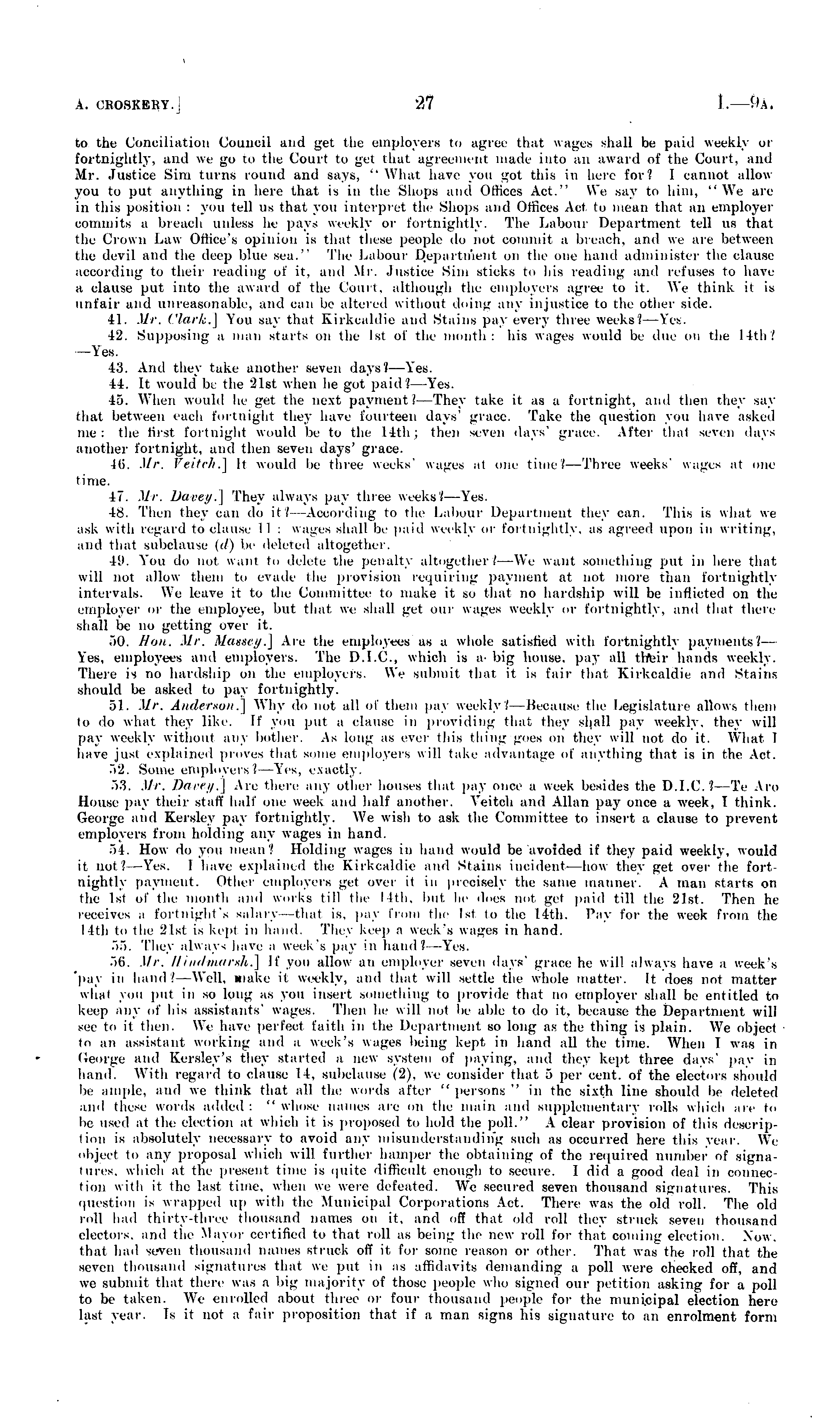 to the Conciliation Council and get the employers to agree that wages shall be paid weekly or fortnightly, and we go to the Court to get thai agreeineni made into an award of the Court, and Mr. Justice Sim turns round and says, " What have you got this in here for? 1 cannot allow you to put anything in here that is in the Shops ami Offices Act." We say to him, "We are in this position : you tell us that you interpret the Shops and Offices Act to mean that an employer commits a breach unless he pays weekly or fortnightly. The Labour Department tell us that the Crown Law Office's Opinion is thai these people do not eoinniit ;i breach, and we are between the devil and the deep blue sea." The Labour Departrneni on the one hand administer the clause according to their reading of it. and Mr. Justice Sim sticks to his reading and refuses to have a clause put into the award of the Court, although the employers agree to it. We think ii is unfair and unreasonable, and can be altered without doing any injustice to the other side. 4-1. Mr. Clark.] You say that Eirkcaldie and Stains pay every three weeks/ —Ye>. 42. Supposing a man stalls on the Isi of the month: his wage's would be due on the I Ith .' Yes. 43. And they take another seven days , / —Yes. 11. It would be the 21st when he got paid /— Yes. 45. When would he gel the next payment .'-- Thc\ take it as a fortnight, and then they say that between each fortnight they have fourteen days' grace. 'Take the question you have asked me: the first fortnight would be to tin , i-lth; then seven days' grace. After thai seven days another fortnight, and then seven days' grace. Ili. .1//-. Vritcli.\ It would be three weeks' wages at one time! —Three weeks' wages at one time. 47. Mr. Davey.] They always pay three weeks'/—Yes. 48. Then they can do it?— According to the Labour Department they can. This is what we ask with regard to clause I I : wages shall be paid weekly or fortnightly, as agreed upon in writing, and that subclause ('/) lie deleted altogether. ID. You do not want to delete tin , penalty altogether'! We want something put in here thai will not allow them to evade the provision requiring payment at nol more than fortnightly intervals. We leave n to the Committee to make it, so that no hardship will be inflicted on the employer or the employee, but that we shall get our wages weekly or fortnightly, and that there shall lie no getting over it. 50. //mi. Mr. Massey.] Are the employees as a whole satisfied with fortnightly payments! Yes. employees and employers. The D.1. (J., which is a big house, pay all their hands weekly. There is no hardship on the employers. We submit that it is fair that Kirkcaldie and Stains should be asked to pay fortnightly. Til. Mr. Anderson.] Why do not all of them pay weekly .' Because the Legislature allows them to do what they like. If you put a clause in providing thai; they shall pay weekly, they will pay weekly without any bother. As long as ever this thing goes on they will not do it. What I have jus! explained proves that some employers will take advantage of anything that is in the Act. 52. Some employers / -Yes. exactly. 53. Mr. Davey.] Are there any other houses that pay once a week besides the D.I.C. I — Te Aro Mouse pay their stall' half one week and half another. Veitoh and Allan pay once a week, I think. George and Kerslev pay fortnightly. We wish to ask the Committee to insert a clause to prevent employers from holding any wage- in hand. 54. How do you mean. Holding wages in hand would be avoided if they paid weekly, 'vould it mil.' Yes. I have explained the Cirkcaldie and Stains incident how they get over the fort nightly payment. Other employers gel over it in precisely the same manner. A man starts on the Ist of the month and works till the I Ith. but he does not get paid till the 21st. Then he receives a fortnight's salary—that is. pay from the Ist to the 14th. Pay for the week from the I Ith lo the I'lst is kept in hand. They keep a week's wages in hand. 55. They always have n week's pay in hand?— Yes. 56. Mr. II tml iiitirx/t .| If you allow an employer seven days' grace he will always have a week's 'pay in hand.' Well, make il weekly, and that will settle the whole matter. It does not matter what you put in so long as you insert something to provide that no employer shall be entitled to keep any of his assistants' wages. Then he will not In' able to do it. because the Department will see to il then. We have perfect faith in the Departluent so long as the thing is plain. We object to an assistant working and a week's wages being kepi in hand all the time. When I was in George and Kersley's they started a new system of paying, and they kept three days' pay in hand. With regard to clause 14, subelause (2). we consider that 5 per cent, of the electors should be ample, and we think that all the words after "persons" in the sixth line should be deleted and these words added: "whose names are on the main and supplementary rolls which are to be used at tin- election at which it is proposed to hold the poll." A clear provision of this description is absolutely necessary to avoid any misunderstanding such as occurred here this year. We object to any proposal which will further hamper the obtaining of the required number of signatures, which at the present time is quite difficult enough to secure. I did a good deal in connection with it the last lime, when we were defeated. We secured seven thousand signatures. This question is wrapped up with the Municipal Corporations Act. There was the old roll. The old roll had thirty-three thousand names on it. and off that old roll they struck seven thousand electors, and the Mayor certified to thai roll as being the new roll for that coming elect ion. Now, that had seven thousand names struck off il for BOine reason or other. That was the roll that the seven thousand signatures that we put in as affidavits demanding a poll were checked off, and we sub
