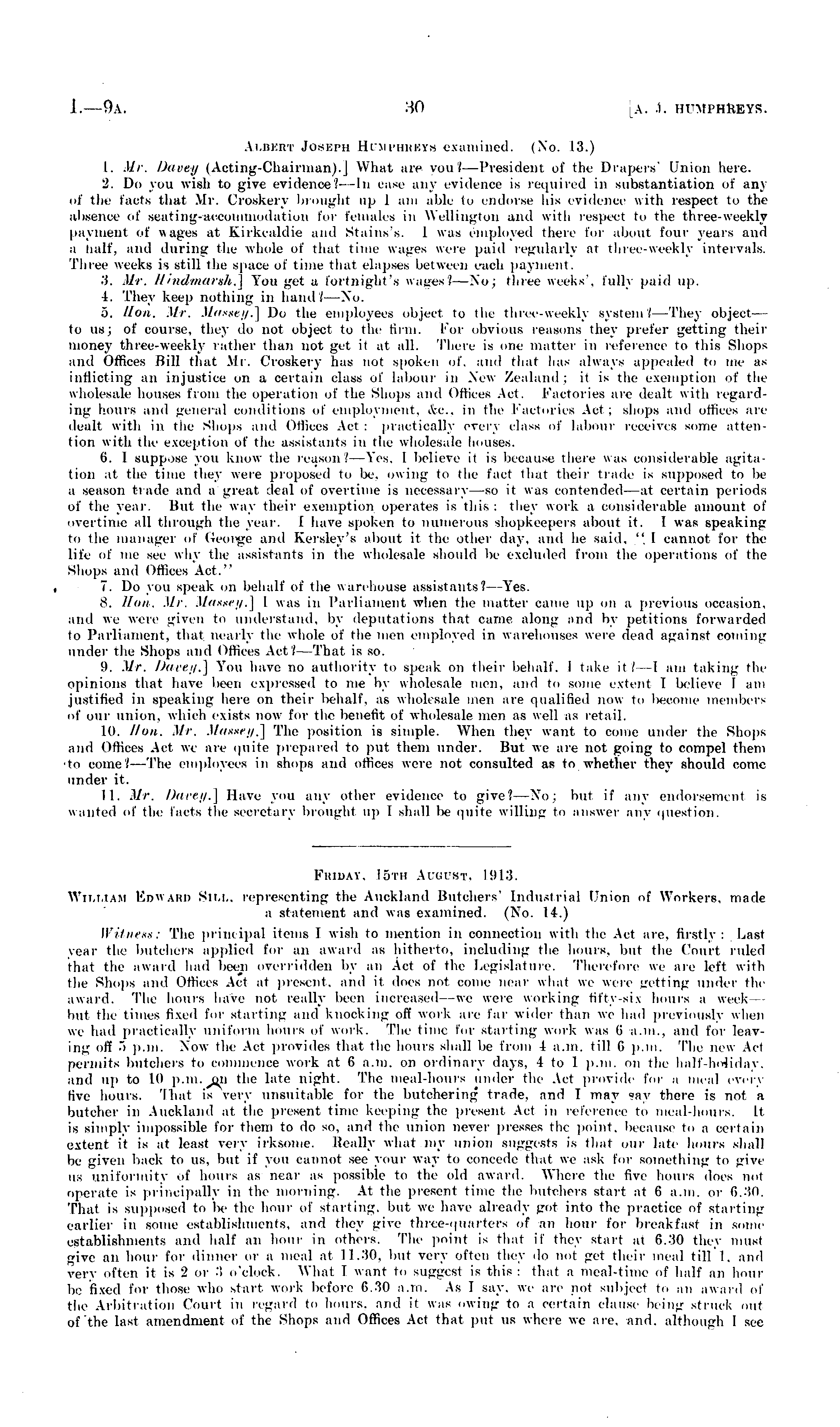 A i.isii: i Joseph Hujiphrkyh examined. (No. 13.) 1. Mr. Davey (Acting-Chairman).] What are you?-—Preaident of 'Ik , Drapers' Union here. 2. Do you wish to give evidence?- In rase any evidence is required in substantiation of any of the facts that Mr. Croskery brought up I tun able to endorse liis evidence with respect to the absence of seating-uccommodation for females in Wellington and with respeci to the three-weekly payment of wagea at Kirkcaldie ami Staine's. 1 was employed there for about four years and a iialf, and during the whole of that time wages were paid regularly at three-weekly intervals. Three weeks i- still the space of time that ellipses between each payment. •'i. Mr. II iml marsh .) You get a fortnight's wages'!—No; three weeks', fully paid up. I. They keep nothing in hand] — No. •j. Hon. Mr. Ma.*.*! i/. ]Do the employees object to the three-weekly system 1 —They object— to us; of course, they do not object to the firm. For obvious reasons they prefer getting their money three-weekly rather than not get it at all. There is one matter in reference to this Shops and Offices Bill that Mr. Croskery has not spoken of, and that has always appealed to me as inflicting an injustice on a certain class of labour in New Zealand : it is the exemption of the wholesale houses from the operation of the Shops and Offices Act. Factories are dealt with regarding hours and genera] conditions of employment, Arc, in the factories Act ; shops and offices are dealt with in the Shops and Offices Acl : practically ever\ class of labour receives some atteii tion with the exception of the assistants in the wholesale houses. G. I suppose you know the reason 'I— Yes, I believe it is because there was considerable agitu tion at the time (hey were proposed to lie. owing to the fact that their trade is supposed to he a season tiaile and a great deal of overtime is necessary -so it was contended-- at certain periods of the year. Hut the way their exemption operates is this: they work a considerable amount of overtime all through the year. I have spoken to numerous shopkeepers about it. I was speaking to the manager of Geoi<ge and Kersley's about it the other day, and lie said. ". I cannot for the life of me see why Ihe assistants in the wholesale should be excluded from the operations of the Shops and < Ifficea Act . " , 7. Do you speak on behalf of the warehouse assistants?-Yes. 8. linn. Mr. Massey.] I was in Parliament when the matter came up on a previous occasion, and we were given to understand, by deputations that came along and by petitions forwarded to Parliament, that nearly the whole of the men employed in warehouses were dead against coming under the Shops and Offices Act? —That is so. i). Mr. Dvn 1 ;;.] You have no authority to speak on their behalf. I take it?—] am taking the opinions that have been expressed to me l>\ wholesale men. and to some extent 1 believe I am justified in speaking here on their behalf, as wholesale men are qualified now to become members of our union, which exists now for the benefit of wholesale men as well as retail. 10. Hon. Mr. Maxsey.] The position is simple. When they want to come under the Shops and Offices Act we are quite prepared to put them under. Hut we art- not going to compel them in come? —The employees in shops and offices were not consulted as to whether they should come under it. 11. .1//". Davcy.] Have you any other evidence to give? — No; but if any endorsement is wanted of the facts the secretary brought up I shall !>e quite willing to answer any question.
