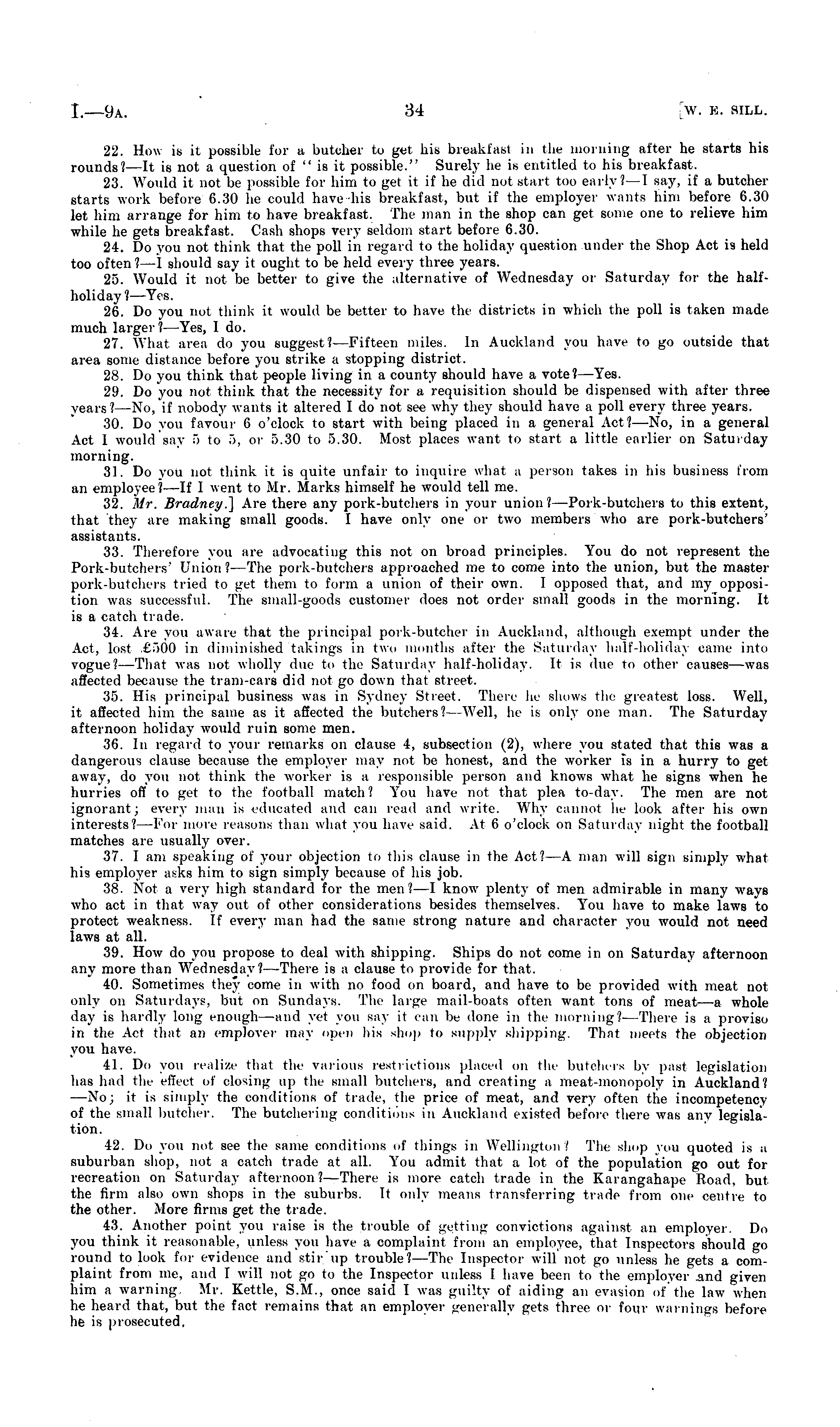 22. How is it possible- for a butcher to get his breakiasi in the morning after he starts his rounds? —It is not a question of "is it possible." Surely he is entitled to his breakfast. 23. Would it not be possible Eor him to get it if he did not start too early?—] say, if a butcher starts work before 6.30 he could have his breakfast, but if the employer wants him before 6.30 let him arrange for him to have breakfast. The man in the shop can get some one to relieve him while he gets breakfast. Cash shops very seldom start before 6.30. 24. Do you not think that the poll in regard to the holiday question under the Shop Act is held too often ? —1 should say it ought to be held every three years. 25. Would it not be better to give the alternative of Wednesday or Saturday for the halfholiday J— Yes. 26. Do you not think it would be better to have the districts in which the poll is taken made much larger? —Yes, I do. 27. What area do you suggest I—Fifteen1 —Fifteen miles. In Auckland you have to go outside that area some distance before you strike a stopping district. 28. Do you think that people living in a county should have a vote?— Yes. 29. Do you not think that the necessity for a requisition should be dispensed with after three years ? —No, if nobody wants it altered I do not see why they should have a poll every three years. 30. Do you favour 6 o'clock to start with being placed in a general Act?—No, in a general Act 1 would say sto 5, or 5.30 to 5.30. Most places want to start a little earlier on Saturday morning. 31. Do you not think it is quite unfair to inquire what a person takes in his business from an employee?—lf I went to Mr. Marks himself he would tell me. 32. Mr. Bradney.] Are there any pork-butchers in your union? —Pork-butchers to this extent, that they are making small goods. I have only one or two members who are pork-butchers' assistants. 33. Therefore you are advocating this not on broad principles. You do not represent the Pork-butchers' Union? —The pork-butchers approached me to come into the union, but the master pork-butchers tried to get them to form a union of their own. I opposed that, and my opposition was successful. The small-goods customer does not order small goods in the morning. It is a catch trade. 34. Are you aware that the principal pork-butcher in Auckland, although exempt under the Act, lost £500 in diminished takings in two months after the Saturday half-holiday came into vogue? —That was not wholly due to the Saturday half-holiday. It is due to other causes—was affected because the tram-cars did not go down that street. :i."j. His principal business was in Sydney Street. There he shows the greatest loss. Well, it affected him the same as it affected the butchers? Well, he is only one man. The Saturday afternoon holiday would ruin some men. 36. In regard to your remarks on clause 4, subsection (2), where you stated that this was a dangerous clause because the employer may not be honest, and the worker is in a hurry to get away, do you not think the worker is a responsible person and knows what he signs when he hurries off to get to the football match? You have not that plea to-day. The men are not ignorant; every man is educated and can read and write. Why cannot he look after his own interests? — For more reasons than what you have said. At 6 o'clock on Saturday night the football matches are usually over. 37. I am speaking of your objection to this clause in the Act?—A man will sign simply what his employer asks him to sign simply because of his job. 38. Not a very high standard for the men?—l know plenty of men admirable in many ways who act in that way out of other considerations besides themselves. You have to make laws to protect weakness. If every man had the same strong nature and character you would not need laws at all. 39. How do you propose to deal with shipping. Ships do not come in on Saturday afternoon any more than Wednesday?— There is a clause to provide for that. 40. Sometimes they come in with no food on board, and have to be provided with meat not only on Saturdays, but on Sundays. The large mail-boats often want tons of meat —a whole day is hardly long enough—and yet you say it can be done in the morning? — There is a proviso in the Act that an employer may open his shop to supply shipping. That meets the objection you have. 41. Do you realize that the various restrictions placed on the butoherH by past legislation has had the effect of closing up the small butchers, and creating a meat-monopoly in Auckland? —No; it is simply the conditions of trade, ilie price of meat, and very often the incompetency of the small butcher. The butchering conditions in Auckland existed before there was any legislation . 42. Do you not see the same conditions of things in Wellington I The shop you quoted is a suburban shop, not a catch trade at all. You admit that a lot of the population go out for recreation on Saturday afternoon?— There is more catch trade in the Karangahape Road, but the firm also own shops in the suburbs. It only means transferring trade from one centre to the other. More firms get the trade. 43. Another point you raise is the trouble of getting convictions against an employer. Do you think it reasonable, unless you have a complaint from an employee, that Inspectors should go round to look for evidence and stir up trouble? —The Inspector will not go unless he gets a complaint from me, and I will not go to the Inspector unless I have been to the employer and given him a warning Mr. Kettle, S.M., once said I was guilty of aiding an evasion of the law when he heard that, but the fact remains that an emplowi- generally gets three or four warnings before he is prosecuted,
