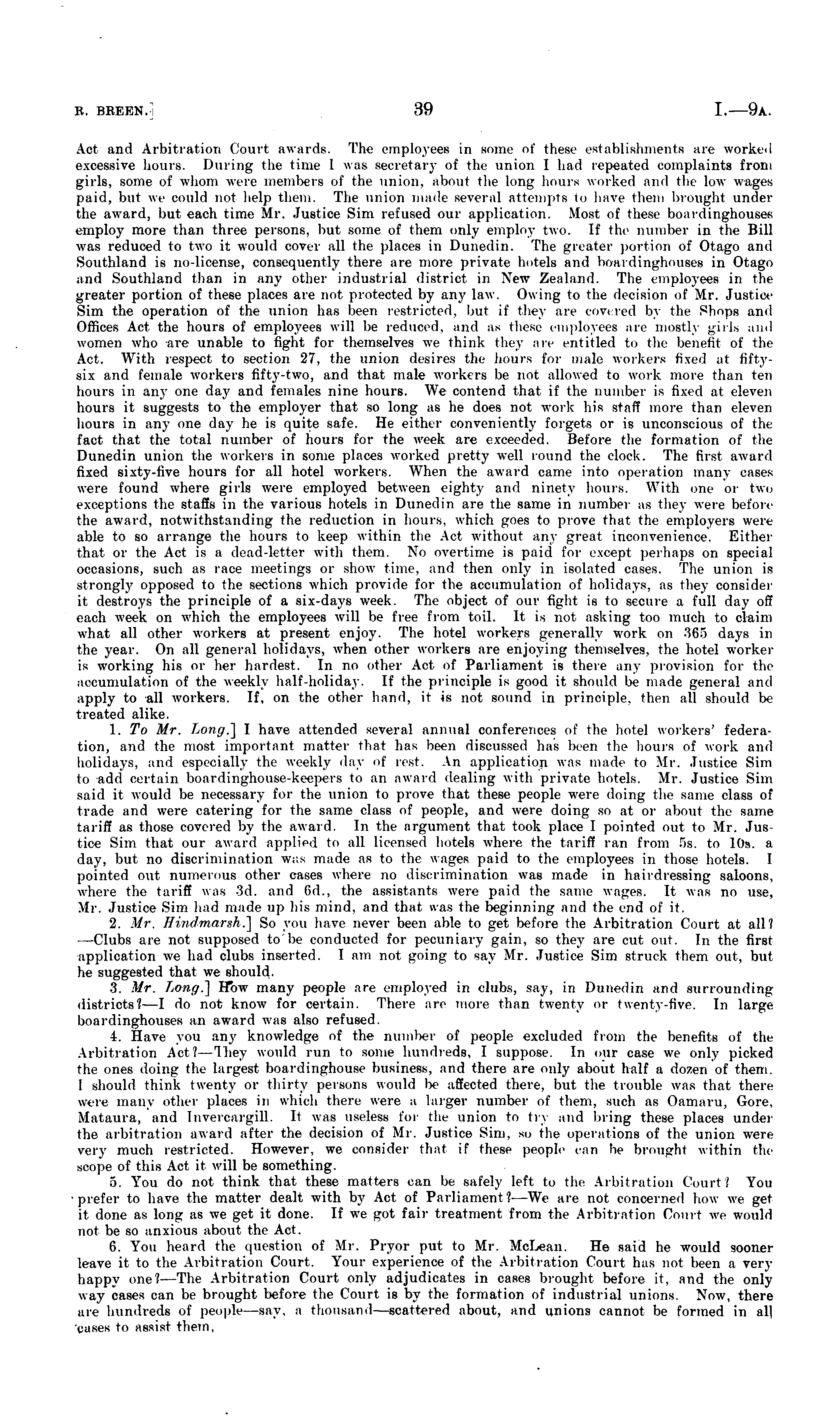 Act and Arbitration Court awards. The employees in some of these establishments arc worked excessive hours. During the time I was secretary of the union I had repeated complaints from girls, some of whom were members of the union, about the long hours winked and the low wages paid, but we could not help them. The union made several attempts i<> have them brought under the award, but each time Mr. Justice Sim refused our application. Most of these boardinghouses employ more than three persons, but some of them only employ two. Ef the number in the Bill was reduced to two it would cover all the places in Dunedin. The greater portion of Otago and Southland is no-license, consequently there are more private hotels and boardinghouses in Otago and Southland than in any other industrial district in New Zealand. The employees in the greater portion of these places are not protected by any law. Owing to the decision of Mr. Justice Sim the operation of the union lias been restricted, but if they are covered by the Shops and Offices Act the hours of employees will be reduced, and as these employees are mostly girls and women who are unable to fight for themselves we think they are entitled to the benefit of the Act. With respect to section 27, the union desires the hours for male workers fixed at fiftysix and female workers fifty-two, and that male workers be not allowed to work more than ten hours in any one day and females nine hours. We contend that if the number is fixed at eleven hours it suggests to the employer that so long as he does not work his staff more than eleven hours in an} , one day he is quite safe. He either conveniently forgets or is unconscious of the fact that the total number of hours for the week are exceeded. Before the formation of the Dunedin union the workers in some places worked pretty well round the clock. The first award fixed sixty-five hours for all hotel workers. When the award came into operation many eases were found where girls were employed between eighty and ninety hours. With one or two exceptions the staffs in the various hotels in Dunedin are the same in number as they were before the award, notwithstanding the reduction in hours, which goes to prove that the employers were able to so arrange the hours to keep within the Act without any great inconvenience. Either that or the Act is a dead-letter with them. No overtime is paid for except perhaps on special occasions, such as race meetings or show time, and then only in isolated cases. The union is strongly opposed to the sections which provide for the accumulation of holidays, as they consider it destroys the principle of a six-days week. The object of our fight is to secure a full day off each week on which the employees will be free from toil. It is not asking too much to claim what all other workers at present enjoy. The hotel workers generally work mi ■'!()."> days in the year. On all general holidays, when other workers are enjoying themselves, the hotel worker is working his or her hardest. In no other Act of Parliament is there any provision for the accumulation of the weekly half-holiday. If the principle is good it should be made general and apply to all workers. If, on the other hand, it is not sound in principle, then all should be treated alike. 1. To Mr. Lour/.] I have attended several annual conferences of the hotel workers' federation, and the most important matter that has been discussed has been the hours of work and holidays, and especially the weekly day of rest. An application was made to Mr. Justice Sim to add certain hoardinghouse-keepers to an award dealing with private hotels. Mr. Justice Sim said it would be necessary for the union to prove that these people were doing the same class of trade and were catering for the same class of people, and were doing so at or about the same tariff as those covered by the award. In the argument that took place I pointed out to Mr. Justice Sim that our award applied to all licensed hotels where the tariff ran from ."is. to 10s. a day, but no discrimination was made as to the wages paid to the employees in those hotels. 1 pointed out numerous other cases where no discrimination was made in hairdressing saloons, where the tariff was 3d. and 6d., the assistants were paid the same wages. It was no use, Mr. Justice Sim had made up his mind, and that was the beginning and the end of it. 2. Mr. lli'mimarxh .] So you have never been able to get before the Arbitration Court at all? —Clubs are not supposed to be conducted for pecuniary gain, so they are cut out. In the first application we had clubs inserted. lam not going to say Mr. Justice Sim struck them out, but he suggested that we should. 3. Mr. Long.] ETow many people are employed in clubs, say, in Dunedin and surrounding districts? —I do not know for certain. There are more than twenty or twenty-five. In large boardinghouses an award was also refused. 4. Have you any knowledge of the number of people excluded from the benefits of the Arbitration Act?—lliey would run to some hundreds, I suppose. In our case we only picked the ones doing the largest boardinghousc business, and there are only about half a dozen of them. I should think twenty or thirty persons would be affected there, but the trouble was that there \wif many other places in which there were a larger number of them, such as Oamaru, Gore, Mataura, and Invercargill. It was useless for the union to try and bring these places under the arbitration award after the decision of Mr. Justice Sim, so the operations of the union were very much restricted. However, we consider that if these people can be brought within tinscope of this Act it will be something. 5. You do not think that these matters can be safely left to the Arbitration Court.' You prefer to have the matter dealt with by Act of Parliament?—We are not concerned how we get it done as long as we get it done. If we got fair treatment from the Arbitration Court we would not be