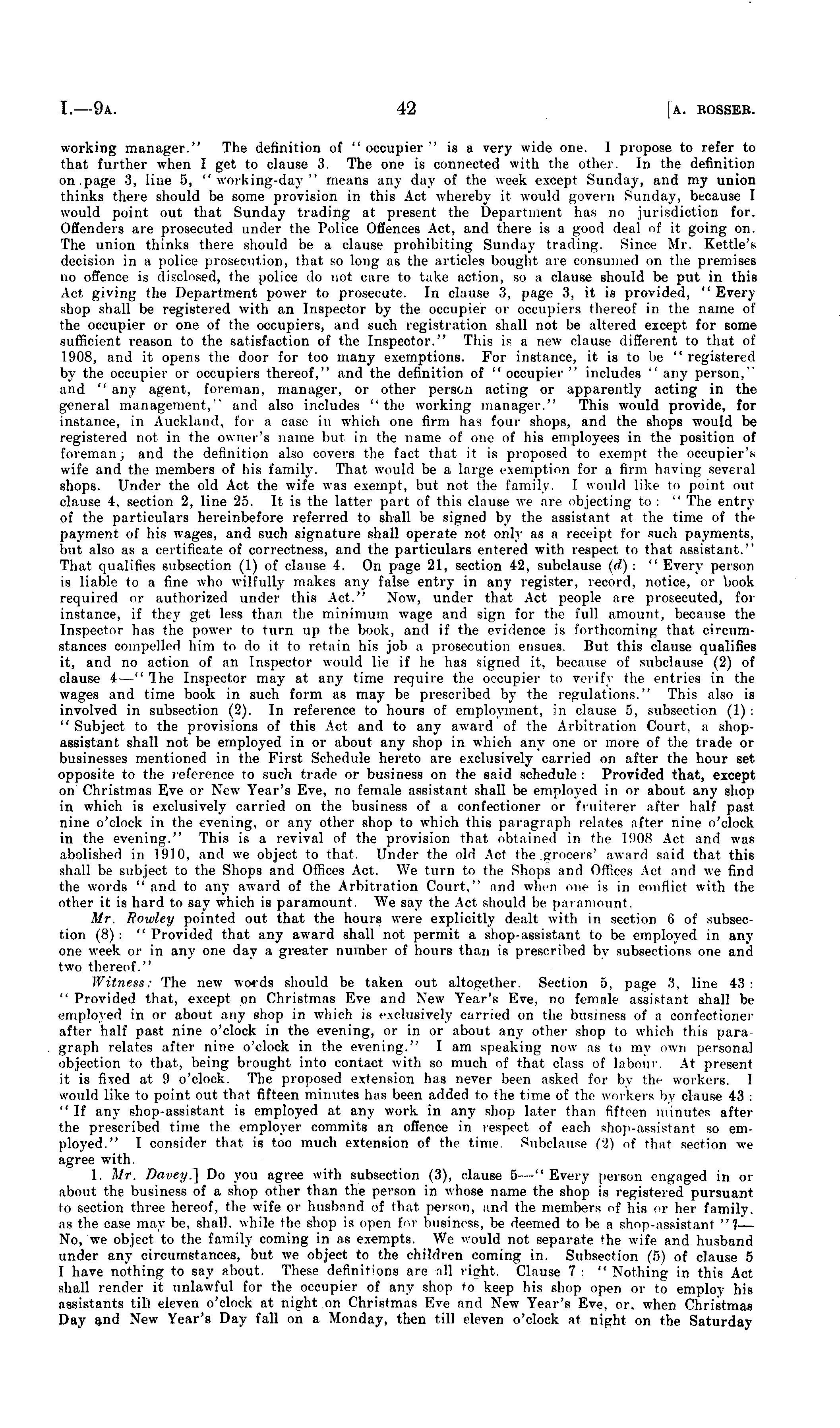 working manager." The definition of " occupier " is a very wide one. I propose to refer to that further when I get to clause 3. The one is connected with the other. In the definition on.page 3, line 5, "working-day" means any day of the week except Sunday, and my union thinks there should be some provision in this Act whereby it would govern Sunday, because I would point out that Sunday trading at present the Department has no jurisdiction for. Offenders are prosecuted under the Police Offences Act, and there is a good deal of it going on. The union thinks there should be a clause prohibiting Sunday trading. Since Mr. Kettle's decision in a police prosecution, that so long as the articles bought are consumed on the premises no offence is disclosed, the police do not care to take action, so a clause should be put in this Act giving the Department power to prosecute. In clause 3, page 3, it is provided, " Every shop shall be registered with an Inspector by the occupier or occupiers thereof in the name of the occupier or one of the occupiers, and such registration shall not be altered except for some sufficient reason to the satisfaction of the Inspector." This is a new clause different to that of 1908, and it opens the door for too many exemptions. For instance, it is to be " registered by the occupier or occupiers thereof," and the definition of " occupier " includes " any person," and " any agent, foreman, manager, or other person acting or apparently acting in the general management," and also includes "the working manager." This would provide, for instance, in Auckland, for a case in which one firm has four shops, and the shops would be registered not in the owner's name but in (he name of one of his employees in the position of foreman; and the definition also covers the fact that it is proposed to exempt the occupier's wife and the members of his family. That would be a large exemption for a firm having sev< ral shops. Under the old Act the wife was exempt, but not the family. I would like to point out clause 4. section 2, line 25. It is the latter part of this clause we are objecting to : " The entry of the particulars hereinbefore referred to shall be signed by the assistant at the time of the payment of his wages, and such signature shall operate not only as a receipt for such payments, but also as a certificate of correctness, and the particulars entered with respect n> that assistant." That qualifies subsection (1) of clause i. On page 21, section 42, subclause (d) : " Every person is liable to a fine who wilfully makes any false entry in any register, record, notice, or book required or authorized under this Act." Now, under that Act people are prosecuted, for instance, if they get less than the minimum wage and sign for the full amount, because the Inspector has the power to turn up the book, and if the evidence is forthcoming- that circumstances oompelled him to do it to retain his job a prosecution ensues. But this clause qualifies it, and no action of an Inspector would lie if he has signed it, because of subclause (2) of clause 4 —" The Inspector may at any time require the occupier to verify the entries in the wages and time book in such form as may be prescribed by the regulations." This also is involved in subsection (2). In reference to hours of employment, in clause 5, subsection (1) : " Subject to the provisions of this Act and to any award of the Arbitration Court, a shopassistant shall not be employed in or about any shop in which any one or more of the trade or businesses mentioned in the First Schedule hereto are exclusively carried on after the hour set opposite to the reference to such trade or business on the said schedule : Provided that, except on Christmas Eve or New Year's Eve, no female assistant shall be employed in or about any shop in which is exclusively carried on the business of a confectioner or fruiterer after half past nine o'clock in the evening, or any other shop to which this paragraph relates after nine o'clock in the evening." This is a revival of the provision that obtained in the 1908 Act and was abolished in 1910, and we object to that. Under the old Act the .grocers' award said that this shall be subject to the Shops and Offices Act. We turn to the Shops and Offices Act and we find the words "and to any award of the Arbitration Court." and when one is in conflict with the other it is hard to say which is paramount. We say the Act should be paramount. Mr. Rowley pointed out that the hours were explicitly dealt with in section 6 of subsection (8) : " Provided that any award shall not permit a shop-assistant to be employed in any one week or in any one day a greater number of hours than is prescribed by subsections one and two thereof." Witness: The new words should be taken out altogether. Section 5, page 3. line 43: " Provided that, except on Christmas Eve and New Year's Eve, no female assistant shall be employed in or about any shop in which is exclusively carried on the business of a confectioner after half past nine o'clock in the evening, or in or about any other shop to which this paragraph relates after nine o'clock in the evening." I am speaking now as to my own personal objection to that, being brought into contact with so much of that class of labour. At present it is fixed at 9 o'clock. The proposed extension has never been asked for by the workers. 1 would like to point, out that fifteen minutes has been added to the time of the workers by clause 43 : " If any shop-assistant is employed at any work in any shop later than fifteen minutes after the prescribed time the employer commits an offence in respect of each shop-assistant so employed." I consider that is too much extension of the time. Subclause (•}) of that section we agree with. 1. Mr. Davey.~\ Do you agree with subsection (3), clause s—"5 —" Every person engaged in or about the business of a shop other than the person in whose name the shop is registered pursuan