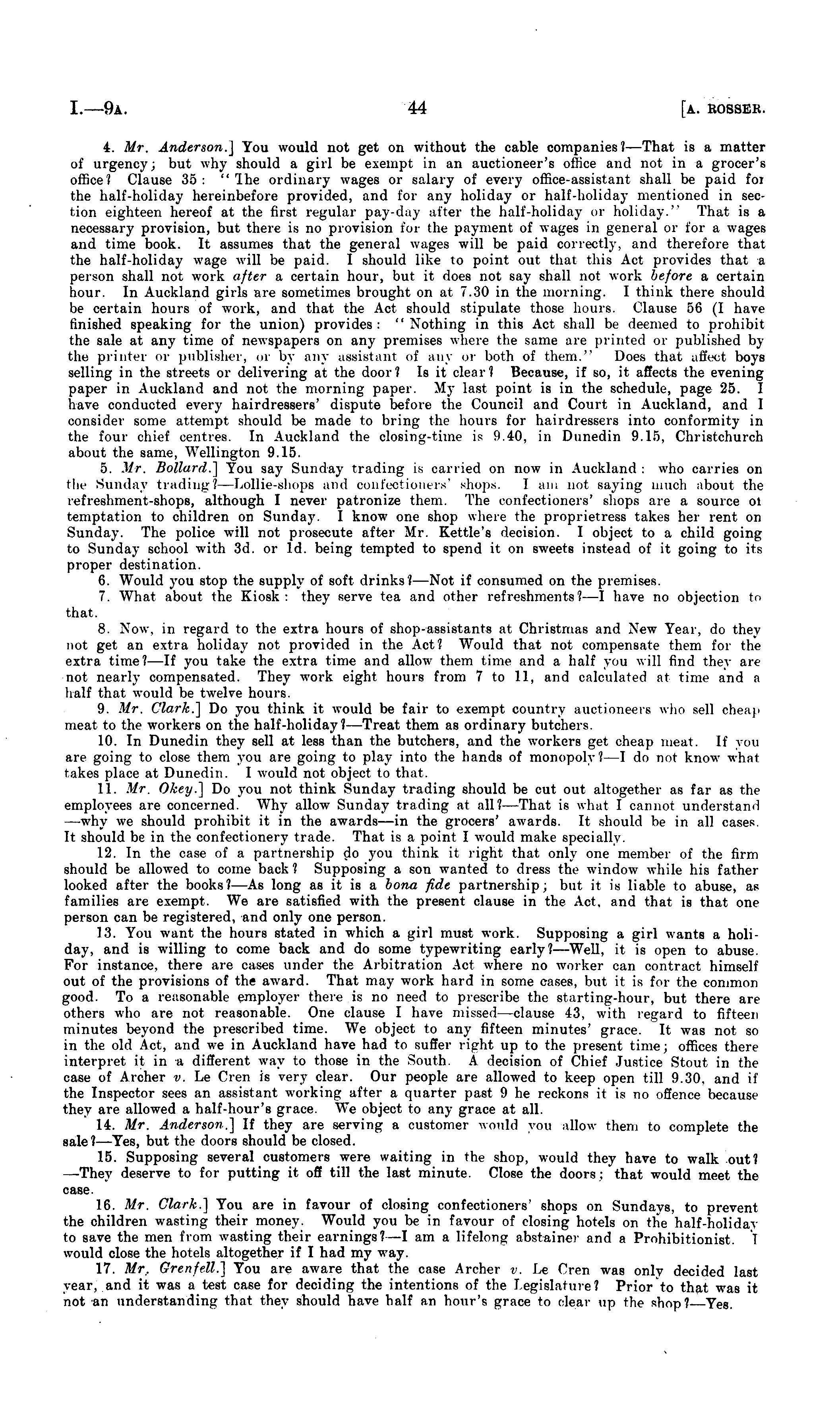 4. Mr. Anderson.] You would not get on without the cable companies?— That is a matter of urgency; but why should a girl be exempt in an auctioneer's office and not in a grocer's office? Clause 35 : " The ordinary wages or salary of every office-assistant shall be paid for the half-holiday hereinbefore provided, and for any holiday or half-holiday mentioned in section eighteen hereof at the first regular pay-day after the half-holiday or holiday." That is a necessary provision, but there is no provision for the payment of wages in general or for a wages and time book. It assumes that the general wages will be paid correctly, and therefore that the half-holiday wage will be paid. I should like to point out that this Act provides that a person shall not work after a certain hour, but it does not say shall not work before a certain hour. In Auckland girls are sometimes brought on at 7.30 in the morning. I think there should be certain hours of work, and that the Act should stipulate those hours. Clause 56 (I have finished speaking for the union) provides : " Nothing in this Act shall be deemed to prohibit the sale at any time of newspapers on any premises where the same are printed or published by the printer or publisher, or by any assistant of any or both of them." Does that affect boys selling in the streets or delivering at the door? Is it clear? Because, if so, it affects the evening paper in Auckland and not the morning paper. My last point is in the schedule, page 25. I have conducted every hairdressers' dispute before the Council and Court in Auckland, and I consider some attempt should be made to bring the hours for hairdressers into conformity in the four chief centres. In Auckland the closing-time is 9.40, in Dunedin 9.15, Christchurch about the same, Wellington 9.15. 5. Mr. Bollard.'] You say Sunday trading is carried on now in Auckland : who carries on flic Sunday trading? —Lollie-shops and confectioners' shops. I an: not saying much about the refreshment-shops, although I never patronize them. The confectioners' shops are a source oi temptation to children on Sunday. I know one shop where the proprietress takes her rent on Sunday. The police will not prosecute after Mr. Kettle's decision. I object to a child going to Sunday school with 3d. or Id. being tempted to spend it on sweets instead of it going to its proper destination. 6. Would you stop the supply of soft drinks? —Not if consumed on the premises. 7. What about the Kiosk: they serve tea and other refreshments? —I have no objection to that. 8. Now, in regard to the extra hours of shop-assistants at Christmas and New Year, do they not get an extra holiday not provided in the Act? Would that not compensate them for the extra time? —If you take the extra time and allow them time and a half you will find they are not nearly compensated. They work eight hours from 7 to 11, and calculated at time and a half that would be twelve hours. 9. Mr. Clark.] Do you think it would be fair to exempt country auctioneers who sell cheap meat to the workers on the half-holiday?— Treat them as ordinary butchers. 10. In Dunedin they sell at less than the butchers, and the workers get cheap meat. If you are going to close them you are going to play into the hands of monopoly?—I do not know what takes place at Dunedin. I would not object to that. 11. Mr. Okey.] Do you not think Sunday trading should be cut out altogether as far as the employees are concerned. Why allow Sunday trading at all?— That is what I cannot understand —why we should prohibit it in the awards —in the grocers' awards. It should be in all cases. It should be in the confectionery trade. That is a point I would make specially. 12. In the case of a partnership do you think it right that only one member of the firm should be allowed to come back? Supposing a son wanted to dress the window while his father looked after the books? —As long as it is a bona fide partnership; but it is liable to abuse, as families are exempt. We are satisfied with the present clause in the Act, and that is that one person can be registered, and only one person. 13. You want the hours stated in which a girl must work. Supposing a girl wants a holi day, and is willing to come back and do some typewriting early?-—Well, it is open to abuse. For instance, there are cases under the Arbitration Act where no worker can contract himself out of the provisions of the award. That may work hard in some cases, but it is for the common good. To a reasonable employer there is no need to prescribe the starting-hour, but there are others who are not reasonable. One clause I have missed —clause 43, with regard to fifteen minutes beyond the prescribed time. We object to any fifteen minutes' grace. It was not so in the old Act, and we in Auckland have had to suffer right up to the present time; offices there interpret it in a different way to those in the South. A decision of Chief Justice Stout in the case of Archer v. Le Cren is very clear. Our people are allowed to keep open till 9.30, and if the Inspector sees an assistant working after a quarter past 9 he reckons it is no offence because they are allowed a half-hour's grace. We object to any grace at all. 14. Mr. Anderson.'] If they are serving a customer would you allow them to complete the sale ?—Yes, but the doors should be closed. 15. Supposing several customers were waiting in the shop, would they have to walk out? —They deserve to for putting it off till the last minute. Close the doors ; that would meet the case. 16. Mr. Clark.] You are in favour of closing confectioners' shops on Sundays, to prevent the children wasting their money. Would you be in favour of closing hotels on the half-holiday to save the men from wasting their earnings?—l am a lifelong abstainer and a Prohibitionist. T would close the hotels altogether if I had my way. 17. Mr, Grenfdl.] You are aware that the case Archer v. Le Cren was only decided last year, 