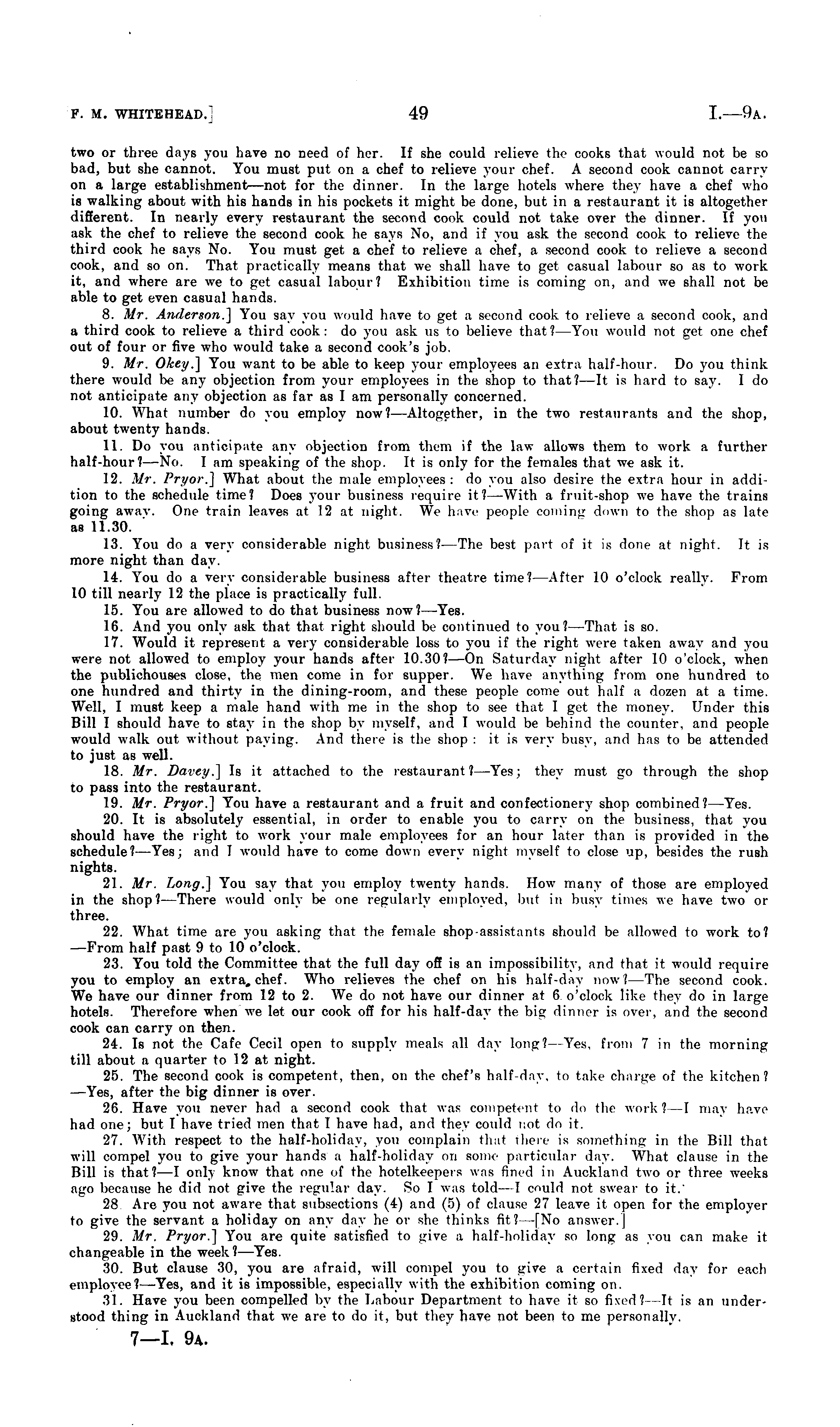 two or three days you have no need of her. If she could relieve the cooks that would not be so bad, but she cannot. You must put on a chef to relieve your chef. A second cook cannot carry on a large establishment—not for the dinner. In the large hotels where they have a chef who is walking about with his hands in his pockets it might be done, but in a restaurant it is altogether different. In nearly every restaurant the second conk could not take over the dinner. If you ask the chef to relieve the second cook he says No, and if you ask the second cook to relieve the third cook he says No. You must get a chef to relieve a chef, a second cook to relieve a second cook, and so on. That practically means that we shall have to get casual labour so as to work it, and where are we to get casual labour? Exhibition time is coming on, and we shall not be able to get even casual hands. 8. Mr. Anderson .] You say you would have to get a second cook to relieve a second cook, and a third cook to relieve a third cook: do you ask us to believe that? —You would not get one chef out of four or five who would take a second cook's job. 9. Mr. Okey.] You want to be able to keep your employees an extra half-hour. Do you think there would be any objection from your employees in the shop to that? —It is hard to say. Ido not anticipate any objection as far as I am personally concerned. 10. What number do you employ now?— Altogether, in the two restaurants and the shop, about twenty hands. 11. Do you anticipate any objection from them if the law allows them to work a further half-hour? —No. lam speaking of the shop. It is only for the females that we ask it. 12. Mr. Pryor.] What about the male employees : do you also desire the extra hour in addition to the schedule time? Does your business require it?— With a fruit-shop we have the trains going away. One train leaves at 12 at night. We have people coining down to the shop as late as 11.30. 13. You do a very considerable night business?— The best part of it is done at night. It is more night than day. 14. You do a very considerable business after theatre time? —After 10 o'clock really. From 10 till nearly 12 the place is practically full. 15. You are allowed to do that business now? —Yes. 16. And you only ask that that right should be continued to you?— That is so. 17. Would it represent a very considerable loss to you if the right were taken away and you were not allowed to employ your hands after 10.30?— On Saturday night after 10 o'clock, when the publichouses close, the men come in for supper. We have anything from one hundred to one hundred and thirty in the dining-room, and these people come out half a dozen at a time. Well, I must keep a male hand with me in the shop to see that I get the money. Under this Bill I should have to stay in the shop by myself, and I would be behind the counter, and people would walk out without paying. And there is the shop :it is very busy, and has to be attended to just as well. 18. Mr. Davey.] Is it attached to the restaurant?— Yes; they must go through the shop to pass into the restaurant. 19. Mr. Pryor.] You have a restaurant and a fruit and confectionery shop combined?— Yes. 20. It is absolutely essential, in order to enable you to carry on the business, that you should have the right to work your male employees for an hour later than is provided in the schedule? —Yes; and I would have to come down every night myself to close up, besides the rush nights. 21. Mr. Long.] You say that you employ twenty hands. How many of those are employed in the shop?— There would only be one regularly employed, but in busy times we have two or three. 22. What time are you asking that the female shop-assistants should be allowed to work to? —From half past 9 to 10 o'clock. 23. You told the Committee that the full day off is an impossibility, and that it would require you to employ an extra, chef. Who relieves the chef on his half-day now?— The second cook. We have our dinner from 12 to 2. We do not have our dinner at 6 o'clock like they do in large hotels. Therefore when we let our cook off for his half-day the big dinner is fiver, and the second cook can carry on then. 24. Is not the Cafe Cecil open to supply meals all day long?— Yes, from 7 in the morning till about a quarter to 12 at night. 25. The second cook is competent, then, on the chef's half-day, to take charge of the kitchen ? —Yes, after the big dinner is over. 26. Have you never had a second cook that was competent to do the work ? — I may have had one; but I have tried men that I have had, and they could not do it. 27. With respect to the half-holiday, you complain that there is something in the Bill that will compel you to give your hands a half-holiday on soinv particular day. What clause in the Bill is that? —I only know that one of the hotelkeepevs was fined in Auckland two or three weeks ago because he did not give the regular day. So I was told —I could not swear to it.' 28 Are you not aware that subsections (4) and (5) of clause 27 leave it open for the employer to give the servant a holiday on any day he or she thinks fit?—[No answer. | 29. Mr. Pryor.] You are quite satisfied to give a half-holiday so long as you can make it changeable in the week? —-Yes. 30. But clause 30, you are afraid, will compel you to give a certain fixed day for each employee? —Yes, and it is impossible, especially with the exhibition coming on. 31. Have you been compelled by the Labour Department to have it so fixed? —It is an understood thing in Auckland that we are to do it, but they have not been to me personally.