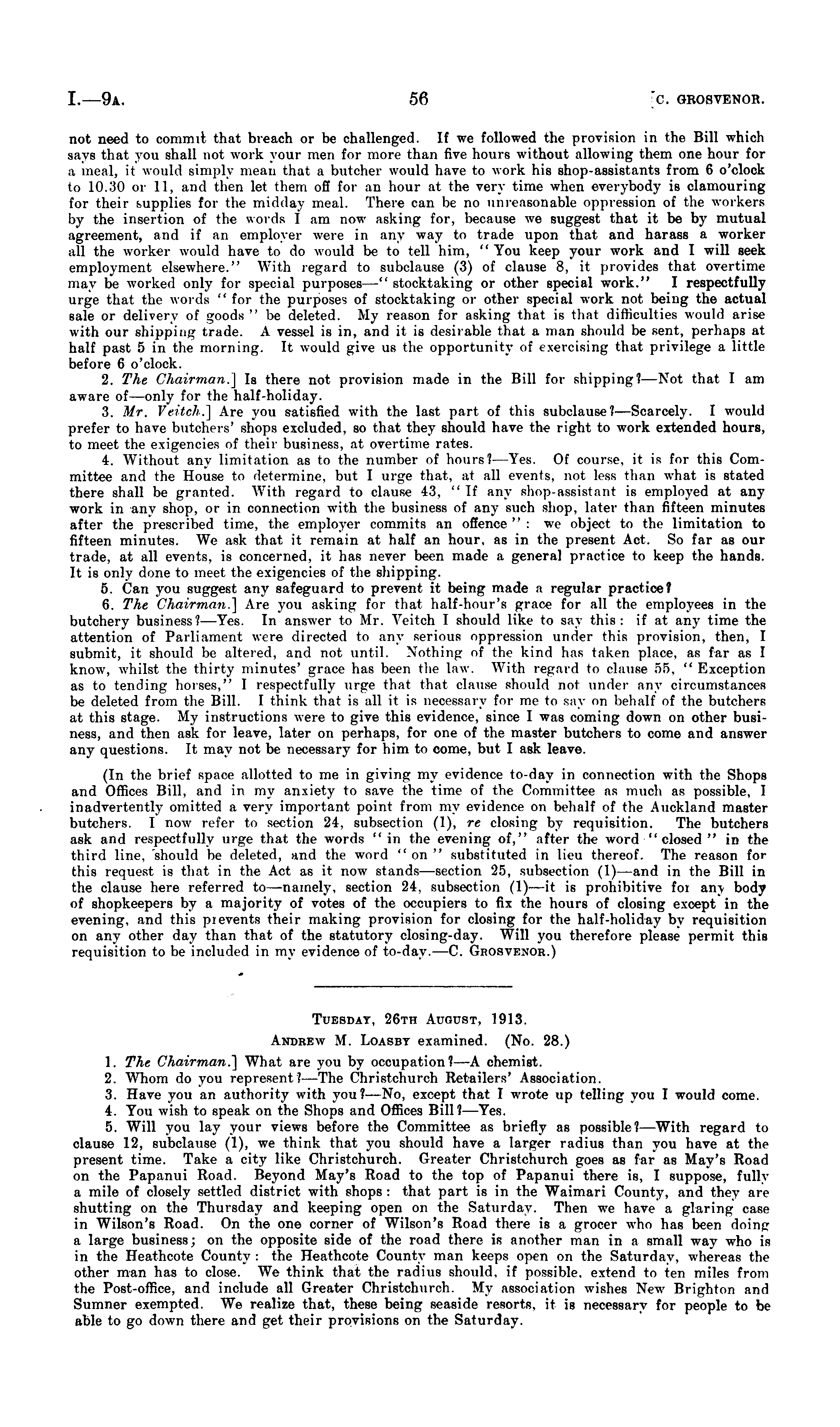 Tuesday, 26th August, 1913. Andrew M. Loasby examined. (No. 28.) 1. The Chairman.] What are you by occupation?—A chemist. 2. Whom do you represent?— The Christchurch Retailers' Association. 3. Have you an authority with you?—No, except that I wrote up telling you I would come. 4. You wish to speak on the Shops and Offices Bill? —Yes. 5. Will you lay your views before the Committee as briefly as possible?— With regard to clause 12, subclause (1), we think that you should have a larger radius than you have at the present time. Take a city like Christchurch. Greater Christchurch goes as far as May's Road on the Papanui Road. Beyond May's Road to the top of Papanui there is, I suppose, fully a mile of closely settled district with shops : that part is in the Waimari County, and they are shutting on the Thursday and keeping open on the Saturday. Then we have a glaring case in Wilson's Road. On the one corner of Wilson's Road there is a grocer who has been doin<: a large business; on the opposite side of the road there is another man in a small way who is in the Heathcote County : the Heathcote County man keeps open on the Saturday, whereas the other man has to close. We think that the radius should, if possible, extend to ten miles from the Post-office, and include all Greater Christchurch. My association wishes New Brighton and Sumner exempted. We realize that, these being seaside resorts, it is necessary for people to be able to go down there and get their provisions on the Saturday.