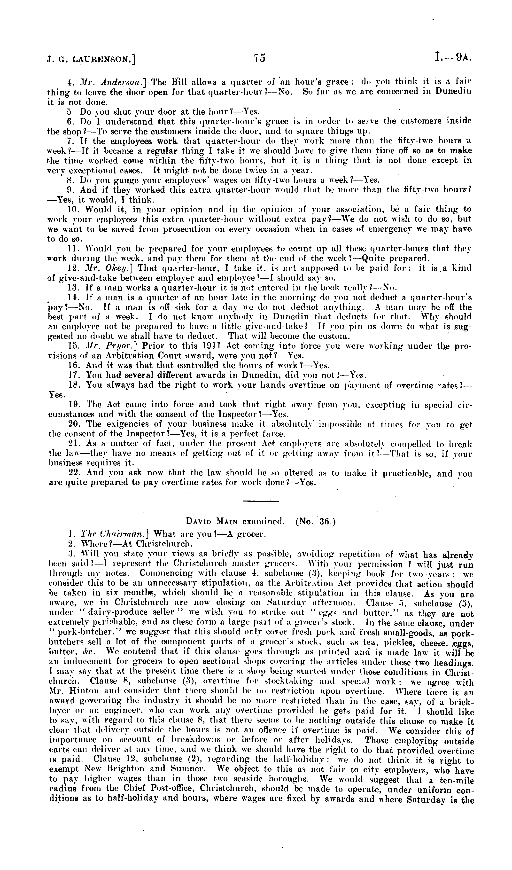 David Main examined. (Xo. 36.) 1. The Clittii man.} What are you? —A grocer. 2. Where?—At Christchurch. " .S. Will you state your views as briefly a< possible, avoiding repetition of what has already been said?— l represent the Christchurch master grocers. With your permission I will just run through my notes. Commencing with clause t, subclause (•!), keeping book for two rears :we consider this to be an unnecessary stipulation, as the Arbitration Act provides that action should be taken in six months, which should be a reasonable stipulation in this clause. As you are aware, we in Christehurch are now closing on Saturday afternoon. Clause ."i, subelause (.">), under " dairy-produce seller" we wish you to strike out "eggs and butter," as tliev are not extremely perishable, and as these form a large part of a grocer's siock. Iv t|, L . same clause, under " pork-butcher." we suggest that this should only cover fresh | k and fresh small-goods, as porkbutchers sell a lot of the component parts of a grocer's stock, such as tea, pickles, cheese, eggs, butter, &C. We contend that if this clause goes through as printed and is made law it will be an inducement for grocers to open sectional shops covering the articles under these two headings. I may say that at the present time there is a shop being started under (hose conditions in Christchurch. Clause i"\ subclause (3), overtime for stocktaking anil special work: we agree with Mr. Hinton and consider that there should be no restriction upon overtime. Where there is an award governing the industry it should lie no more restricted than in the case, say, of a bricklayer or an engineer, who can work any overtime provided lie gets paid for it. I should like to say, with regard to this clause 8, that there seems to be nothing outside this clause to make it clear that delivery outside the hours is not an offence i! overtime is paid. We consider this of importance on account of breakdowns or before or after holidays. Those employing outside carts can deliver at any time, and we think we should have the right to do that provided overtime is paid. Clause 12, subclause (2), regarding the half-holiday: we do not think it is right to exempt New Brighton and Stunner. We object to this as not fair to city employers, who have to pay higher wages than in those two seaside boroughs. We would suggest that a ten-mile radius from the Chief Post-ofh'ce, Christchurch, should be made to operate, under uniform conditions as to half-holiday and hours, where wages are fixed by awards and where Saturday is the