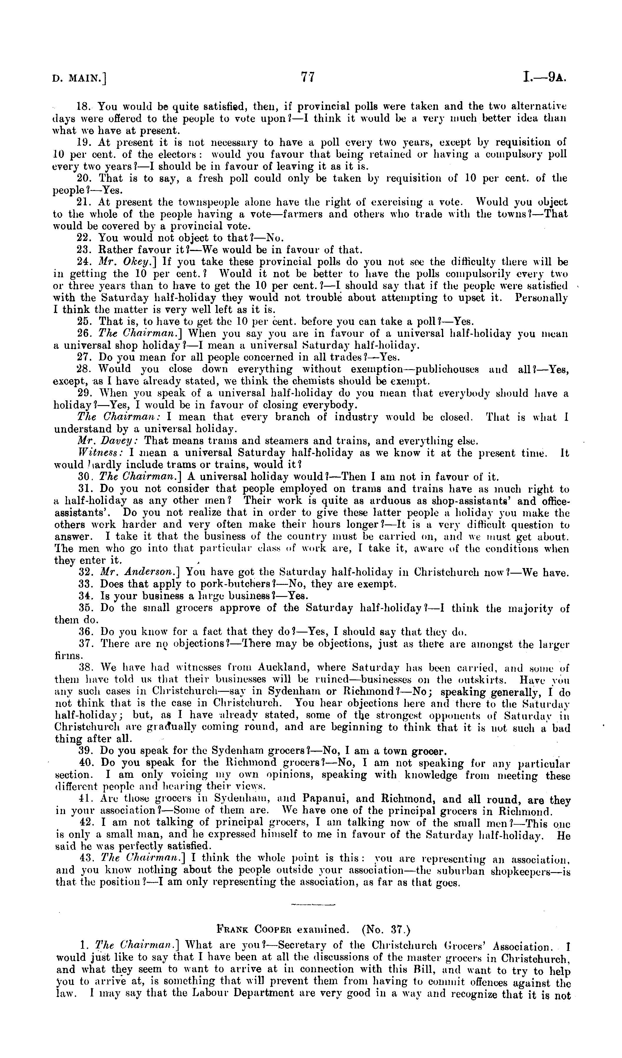 Prank Coopkji examined. (No. 37.) I. The Chairman .] What are you?— Secretary of the Christchurch Grocers' Association. I would just like to say that I have been at all the discussions of the master grocers in Christchurch. and what they seem to want to arrive at in connection with this Hill, and want to try to help you to arrive at, is something that will prevent them from having to commit offences against the law . 1 may say that the Labour Department are very good in a way and recognize that it is not