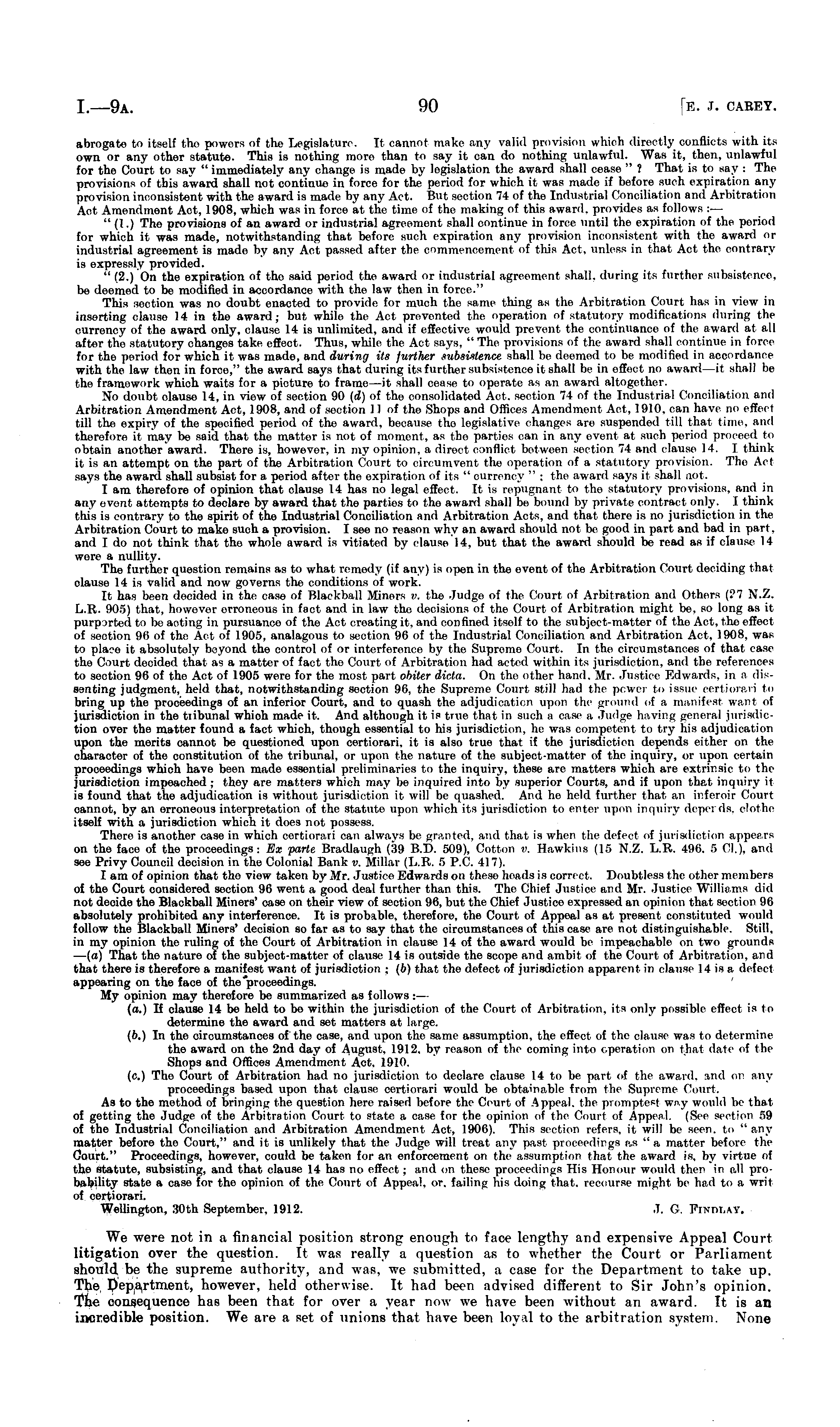abrogate to itself the powers of the Legislature. It cannot make any valid provision which directly conflicts with its own or any other statute. This is nothing more than to say it can do nothing unlawful. Was it, then, unlawful for the Court to say " immediately any change is made by legislation the award shall cease " ? That is t<> say : The provisions of this award shall not continue in force for the period for which it was made if before such expiration any provision inconsistent with the award is made by any Act. But section 74 of the Industrial Conciliation and Arbitration Act Amendment Act, 1908, which was in force at the time of the making of this award, provides as follows : — " (1.) The provisions of an award or industrial agreement shall continue in force until the expiration of the period for which it was made, notwithstanding that before such expiration any provision inconsistent with the award or industrial agreement is made by any Act passed after the commencement of this Act, unless in that Act the contrary is expressly provided. (2.) On the expiration of tho said period the award or industrial agreement shall, during its further subsistence, be deemed to be modified in accordance with the law then in force." This section was no doubt enacted to provide for much the same thing as the Arbitration Court has in view in inserting clause 14 in the award; but while the Act prevented the operation of statutory modifications during the currency of the award only, clause. 14 is unlimited, and if effective would prevent the continuance of the award at all after the statutory changes take effect. Thus, while the Act says, " The provisions of the award shall continue in force for the period for which it was made, and during its further subsistence shall be deemed d> lie modified in accordance with the law then in force," the award says that during its further subsistence it shall be in effect no award—it shall be the framowork which waits for a picture to frame—it shall (-case to operate as an award altogether. No doubt clause 14, in view of section 90 (d) of the consolidated Act. section 74 of the Industrial Conciliation and Arbitration Amendment Act, 1908, and of section 11 of the Shops and Offices Amendment Act, 1910. can have no effect till the expiry of the specified period of the award, because tho legislative changes aro suspended till that time, and therefore it may be said that the mattor is not of moment, as the partios can in any event at such period proceed to obtain another award. There is, however, in my opinion, a direct conflict between section 74 and clause 14. 1 think it is an attempt on the part of the Arbitration Court to circumvent the operation of a statutory provision. The Aol says the award shall subsist for a period after the expiration of its " currency " ; the award says it shall not. lam therefore of opinion that clause 14 has no legal effect. It is repugnant to tho statutory provisions, and in any event attempts to declare by award that tho parties to the award shall be bound by private contract only. I think this is contrary to the spirit of the Industrial Conciliation and Arbitration Acts, and thai there is no jurisdiction in the Arbitration Court to make such a provision. I see no reason why an award should not be good in part and bad in part, and I do not think that the whole award is vitiated by clause 14, but that the award should be read as if clause 14 wore a nullity. The further question remains as to what remedy (if any) is open in the event of tho Arbitration Court deciding that clause 14 is valid and now governs the conditions of work. It has been decided in the case of Blackball Miners v. the Judge of the Court of Arbitration and Others (?7 N.Z. L.R. 905) that, however erroneous in fact and in law tho decisions of the Court of Arbitration might be, so long as it purp irtod to be aoting in pursuance of tho Act creating it, and confined itself to the subject-matter of the Act, the effect of seotion 96 of the Act of 1905, analagous to section 96 of the Industrial Conciliation and Arbitration Act, 1908, was to place it absolutely boyond the control of or interforenco by tho Supreme Court. In the circumstances of that case the Court decided that as a matter of fact tho Court of Arbitration had acted within its jurisdiction, and the references to section 96 of the Act of 1905 were for the most part obiter dicta. On the other hand. Mr. Justice Edwards, in a dissenting judgment, held that, notwithstanding section 96, the Supreme Court still had the power to issue eertiorari to bring up the proceedings of an inferior Court, and to quash the adjudication upon the ground of a manifest want of jurisdiction in the tiibunal which made it. And although it is true that in such a case a Judge haying general jurisdiction over the matter found a fact which, though essential to his jurisdiction, lie was competent to try his adjudication upon the merits cannot be questioned upon certiorari, it is also true that if the jurisdiction depends either on the character of the constitution of the tribunal, or upon the nature of the subject-matter of the inquiry, or upon certain proceedings which have been made essential preliminaries to the inquiry, these are matters which are extrinsic to the jurisdiction impeached ; they are matters which ma,y be inquired into by superior Courts, and if upon that inquiry it is found that the adjudication is without jurisdiction it will be quashed. And he held further that an inferoir Court cannot, by an erroneous interpretation of the statute upon which its jurisdiction to enter upon inquiry depei ds, clothe itself with a jurisdiction which it does not possess. Thero is another case in which certiorari can always be granted, and that is when the defect of jurisdiction appears on the face of the proceedings: Ex parte Bradlaugh (39 B.D. 509), Cotton v. Hawkins (15 N.Z. L.R. 496. 5 CI.), and see Privy Council decision in the Colonia