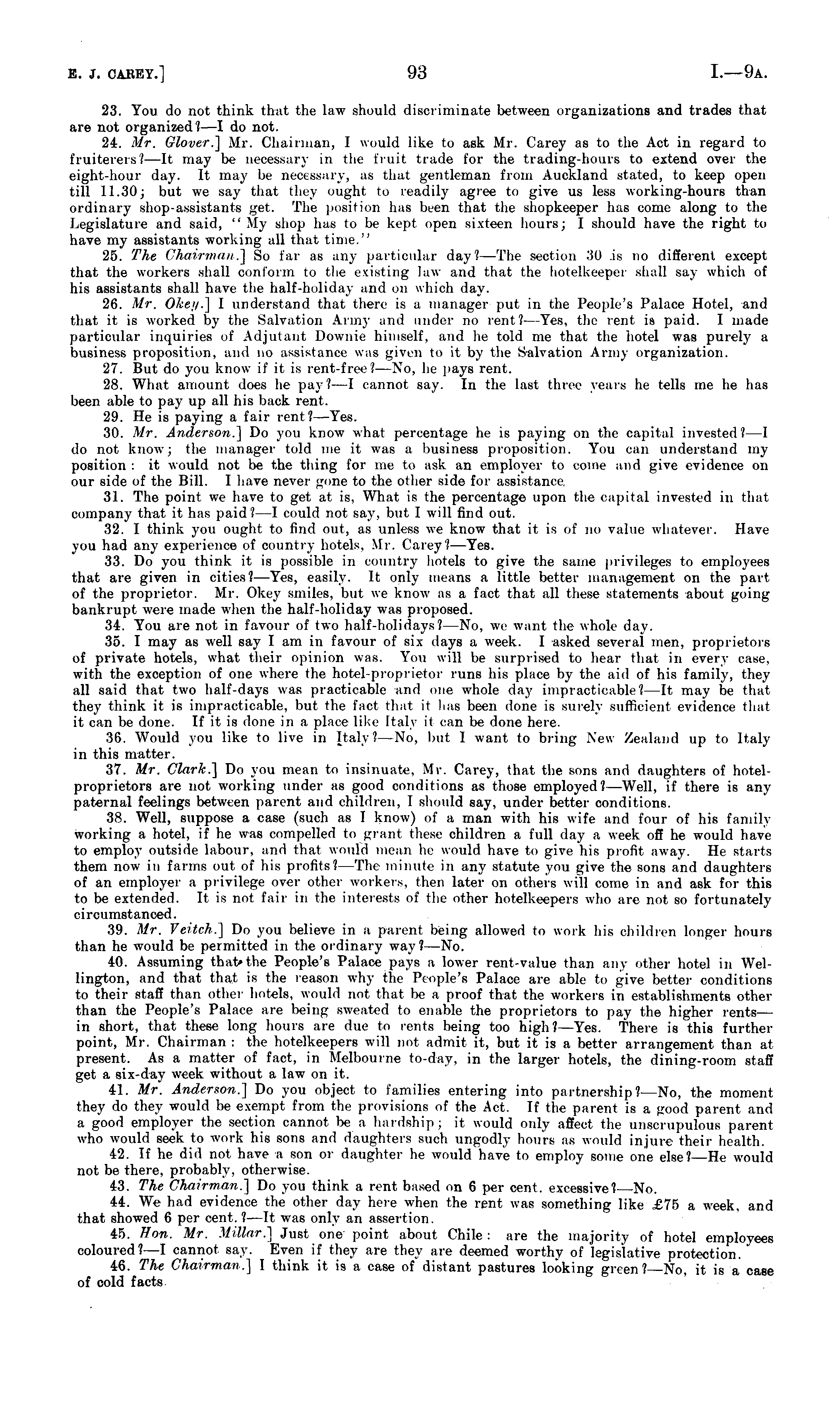23. You do not think that the law should discriminate between organizations and trades that are not organized?—l do not. 24. Mr. Glover.] Mr. Chairman, I would like to ask Mr. Carey as to the Act in regard to fruiterers?—lt may be necessary in the fruit trade for the trading-hours to extend over the eight-hour day. It may be necessary, as that gentleman from Auckland stated, to keep open till 11.30; but we say that they ought to readily agree to give us less working-hours than ordinary shop-assistants get. The position lias been that the shopkeeper has come along to the Legislature and said, " My shop has to be kept open sixteen hours; I should have the right hi have my assistants working all that time." 25. The Chairman.] So far as any particular day? —The section .'5O .is no different except that the workers shall conform to the existing law and that the hotelkeeper shall say which of his assistants shall have the half-holiday and on which day. 26. Mr. Oke;/.] I understand that there is a manager put in the People's Palace Hotel, and that it is worked by the Salvation Army and under no rent?— Yes, the rent is paid. I made particular inquiries of Adjutant Downie himself, and he told me that the hotel was purely a business proposition, and no assistance was given to it by tlic Salvation Army organization. 27. But do you know if it is rent-free? —No, lie pays rent. 28. What amount does he pay?—l cannot say. In the last three years he tells me he has been able to pay up all his back rent. 29. He is paying a fair rent? —Yes. 30. Mr. Anderson.] Do you know what percentage he is paying on the capital invested? —I do not know; the manager told me it was a business proposition. You can understand my position : it would not be the tiling for me to ask an employer to come and give evidence on our side of the Bill. I have never gone to the other side for assistance. 31. The point we have to get at is, What is the percentage upon the capital invested in that company that it has paid? —I could not say, but I will find out. 32. I think you ought to find out, as unless we know that it is of no value whatever. Have you had any experience of country hotels, Mr. Carey?—Yes. 33. Do you think it is possible in country hotels to give the same privileges to employees that are given in cities? —Yes, easily. It only means a little better management on the part of the proprietor. Mr. Okey smiles, but we know as a fact that all these statements about going bankrupt were made when the half-holiday was proposed. 34. You are not in favour of two half-holidays I—No,1 —No, we want the whole day. 35. I may as well say lam in favour of six days a week. I asked several men, proprietors of private hotels, what their opinion was. You will be surprised to hear that in every case. with the exception of one where the hotel-proprietor runs his place by the aid of his family, they all said that two half-days was practicable and one whole day impracticable?—lt may be that they think it is impracticable, but the fact that it lias been done is surely sufficient evidence that it can be done. If it is done in a place like Italy it can be done here. 36. Would you like to live in Italy?—No, but I want to bring New Zealand up to Italy in this matter. 37. Mr. Clark.] Do you mean to insinuate. Mr. Carey, that the sons and daughters of hotelproprietors are not working under as good conditions as those employed?— Well, if there is any paternal feelings between parent and children, I should say, under better conditions. 38. Well, suppose a case (such as I know) of a man with his wife and four of his family working a hotel, if he was compelled to grani these children a full day a week off he would have to employ outside labour, and that would mean he would have to give his profit away. He starts them now in farms out of his profits? —The minute in any statute you give the sons and daughters of an employer a privilege over other workers, then later on others will come in and ask for this to be extended. It is not fair in the interests of the other hotelkeepers who are not so fortunately circumstanced. 39. Mr. Veitch.] Do you believe in a parent being allowed to work his children longer hours than he would be permitted in the ordinary way ?—No. 40. Assuming that»the People's Palace pays a lower rent-value than any other hotel in Wellington, and that that is the reason why the People's Palace are able to give better conditions to their staff than other hotels, would not thai lie a proof that the workers in establishments other than the People's Palace arc being sweated to enable the proprietors to pay the higher rents — in short, that these long hours are due to rents being too high?— Yes. There is this further point, Mr. Chairman : the hotelkeepers will not admit it, but it is a better arrangement than at present. As a matter of fact, in Melbourne to-day, in the larger hotels, the dining-room staff get a six-day week without a law on it. 41. Mr. Anderson.] Do you object to families entering into partnership? —No, the moment they do they would be exempt from the provisions of the Act. If the parent is a good parent and a good employer the section cannot be a hardship; it would only affect the unscrupulous parent who would seek to work his sons and daughters such ungodly hours as would injure thoir health. 42. If he did not have a son or daughter he would have to employ some one else? —He would not be there, probably, otherwise. 43. The Chairman.] Do you think a rent based on 6 per cent, excessive? No. 44. We had evidence the other day here when the rent was something like £75 a week, and that showed 6 per cent. ?—lt was only an assertion. 45. Hon. Mr. Millar.} Just one point about Chile: are the majority of hotel employees coloured? —I cannot say. Even if they are they are deemed worthy of legislative protection. 46. The Chairman.] I think it is a case of distant pastures looking green?—No, i