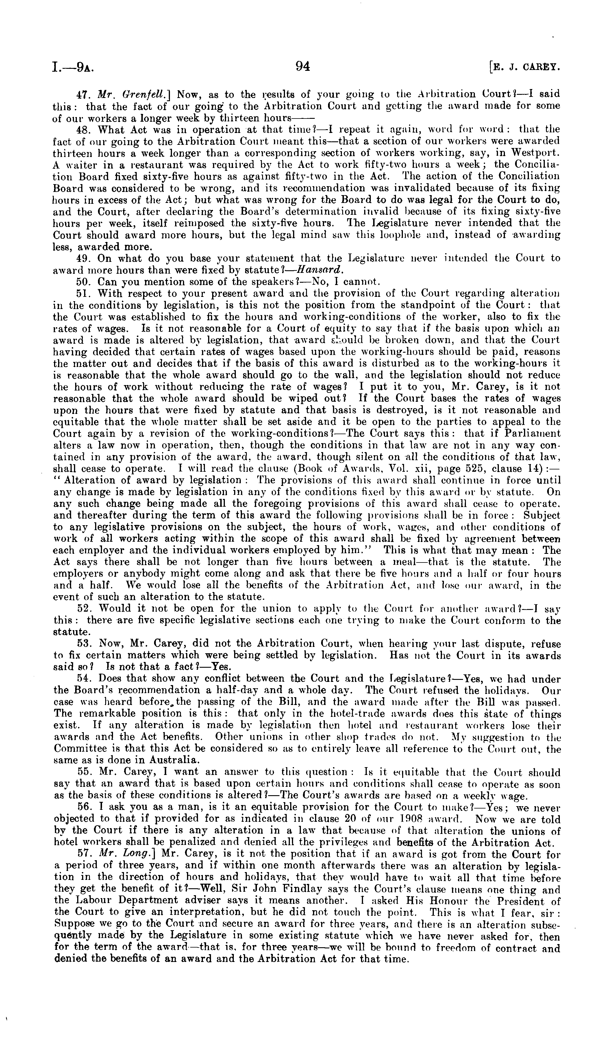 47. Mr. GrenfeH.] Now, as to the results of your going to the Arbitration Court?—l said this : that the fact of our going to the Arbitration Court and getting the award made for some of our workers a longer week by thirteen hours 48. What Act was in operation at that time?—l repeat it again, word for wind : that the fact of our going to the Arbitration Court meant this—that a section of our workers were awarded thirteen hours a week longer than a corresponding section of workers working, say, in Weetport. A waiter in a restaurant was required by the Act to work fifty-two hours a week; the Conciliation Board fixed sixty-five hours as against fifty-two in the Act. The action of the Conciliation Board was considered to be wrong, and its recommendation was invalidated because of its fixing hours in excess of the Act; but what was wrong for the Board to do was legal for the Court to do, and the Court, after declaring the Board's determination invalid because of its fixing sixty-five hours per week, itself reimposed the sixty-five hours. The Legislature never intended that the Court should award more hours, but the legal mind saw this loophole and, instead of awarding less, awarded more. 49. On what do you base your statement that the Legislature never intended the Court to award more hours than were fixed by statute? — Hansard. 50. Can you mention some of the speakers? —No, 1 cannot. 51. With respect to your present award and the provision of the Court regarding alteration in the conditions by legislation, is this not the position from the standpoint of the Court : that the Court was established to fix the hours and working-conditions of the worker, also to fix the rates of wages. Is it not reasonable for a Court of equity to say that if the basis upon which an award is made is altered by legislation, that award should be broken down, and that the Court having decided that certain rates of wages based upon the working-hours should be paid, reasons the matter out and decides that if the basis of this award is disturbed as to the working-hours it is reasonable that the whole award should go to the wall, and the legislation should not reduce the hours of work without reducing the rate of wages? I put it to you, Mr. Carey, is it not reasonable that the whole award should be wiped out? If the Court bases the rates of wages upon the hours that were fixed by statute and that basis is destroyed, is it not reasonable and equitable that the whole matter shall be set aside and it be open to the parties to appeal to the Court again by a revision of the working-conditions?— The Court says this: that if Parliament alters a law now in operation, then, though the conditions in that law are not in any way contained in any provision of the award, the award, though silent on all the conditions of that law. shall cease to operate. I will read the clause (Book of Awards. Vol. xii, page 525, clause 14) : — "Alteration of award by legislation: The provisions of this award shall continue in force until any change is made by legislation in any of the conditions fixed by this award or by statute. On any such change being made all the foregoing provisions of this award shall cease to operate, and thereafter during the term of this award the following provisions shall be in force: Subject to any legislative provisions on the subject, the hours of work, wages, and other conditions of work of all workers acting within the scope of this award shall lie fixed by agreement between each employer and the individual workers employed by him." This is what that may mean : The Act says there shall be not longer than five hours between a meal -that is the statute. The employers or anybody might come along and ask that there lie five hours and a half or four hours and a half. We would lose all the benefits of the Arbitration Act, and lose ..in- award, in the event of such an alteration to the statute. 52. Would it not be open for the union to apply to the Court for another award?—l say this : there are five specific legislative sections each one trying to make the Court conform to the statute. 53. Now, Mr. Carey, did not the Arbitration Court, when hearing your last dispute, refuse to fix certain matters which were being settled by legislation. Has not the Court in its awards said so ? Is not that a fact ?—Yes. 54. Does that show any conflict between the Court and the Legislature?— Yes, we had under the Board's recommendation a half-day and a whole day. The Court refused the holidays. Our case was heard before,the passing of the Bill, and the award made after the Bill was passed. The remarkable position is this: that only in the hotel-trade awards does this state of things exist. If any alteration is made by legislation then hotel and restaurant workers lose their awards and the Act benefits. Other unions in other shop trades do not. My suggestion to the Committee is that this Act be considered so as to entirely leave all reference to the Court out, the same as is done in Australia. 55. Mr. Carey, I want an answer to this question : Is it equitable that the Court should say that an award that is based upon certain hours and conditions shall cease.- to operate as soon as the basis of these conditions is altered?— The Court's awards are based on a weekly wage. 56. I ask you as a man, is it an equitable provision for the Court to make? —Yes; we never objected to that if provided for as indicated in clause 20 of our 1908 award. Now we are told by the Court if there is any alteration in a law that because of that alteration the unions of hotel workers shall be penalized and denied all the privileges and benefits of the Arbitration Act. 57. Mr. Long.] Mr. Carey, is it not the position that if an award is got from the Court for a period of three years, and if within one month afterwards there was an alteration by legislation in the direction of hours and holidays, that they would have to wait all that time before th