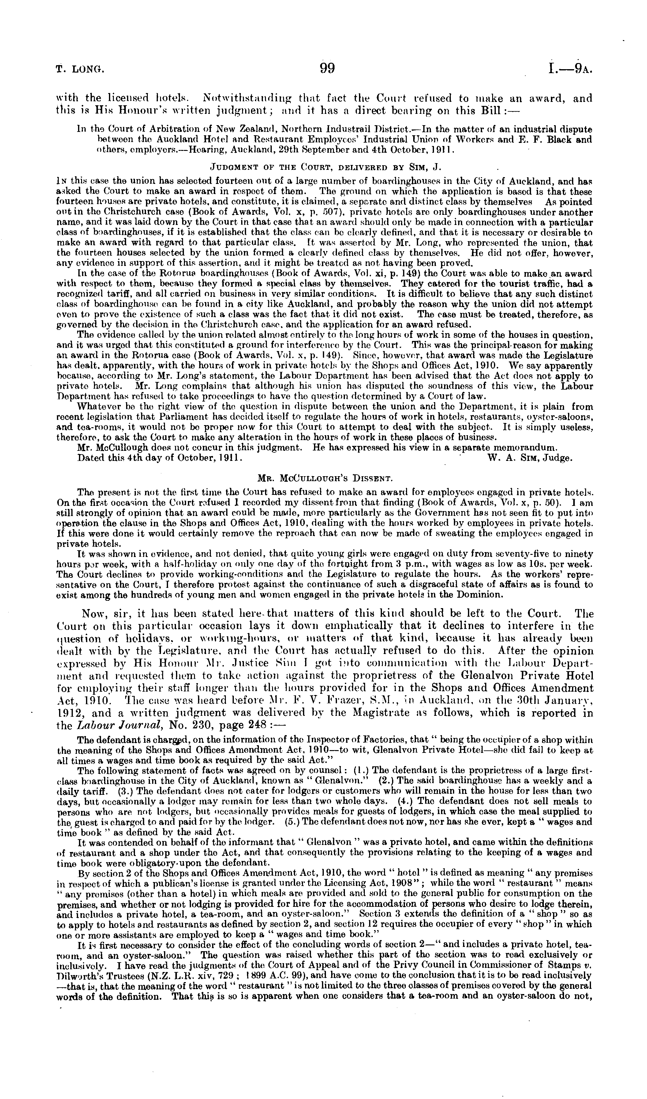 with the licensed hotels. Notwithstanding that fad the CouH refused to make an award, and this is His Honour's written judgment ; and it has a direct bearing on this Bill : — In the Court of Arbitration <>f New Zealand, Northern Industrnil District.—ln tho matter of an industrial dispute between the Auckland Hotel and Restaurant Employees' Industrial Union of Workers and K. F. Black and others, employers. — Hearing, Auckland, 2!) th September and 4th October, 191 1 . Judgment ok the Court, deltvbrbd by Sim, .). 1 n this case the union lias selected fourteen out of a large number of boardinghousea in the City of Auckland, and has a-ikod the Court to make an award in respect of them. The ground on which tho application is based is that these fourteen houses arc private hotels, and constitute, it is claimed, a separate and distinct class by themselves As pointed out in the Christchurch case (Book of Awards, Vol. x, p. 507). private hotels are only boardinghouses under another name, and it was laid down by the Court in that case that an award should only be made in connection with a particular class of boardinghousee, if it is established that tho class can be oli arly defined, and that it is necessary or desirable to make an award with regard to that particular class. Ft was asserted by Mr. Long, who represented the union, that the fourteen houses selected by the union formed a clearly defined class by themselves. He did not offer, however, any evidence in support of this assertion, and it might be treated as not having been proved. In the case of the Rotorua boardinghouses (Book of Awards. Vol. xi. p. 149) the Court was able to make .an award with respect to them, because they formed a special class by themselves. They catered for the tourist traffic, had a recognized tariff, and all carried on business in very similar conditions. It is difficult to believe that any such distinct class of boardinghouse can he found in a oity like Auckland, anil probably the reason why the union did not attempt even to prove the existence of such a class was the fact that it did not oxist. The case must be treated, therefore, as governed by the decision in the Christchurch case, and the application for an award refused. The evidence called by the union related almost entirely to the long hours of work in some of tile houses in question, and it was urged that this constituted a ground for interference by the Court. This was the principal-reason for making an award in the Rotorua case (Hook of Awards. Vol. x, p. 149). Since, however, that award was made the Legislature han dealt, apparently, with the hours of work in private hotels by the Shops and Offices Act, 1910. We say apparently bocause. according to Mr. Long's statement, the Labour Department has been advised that the Act does not apply to private hotels. Mr. Long complains that although his union has disputed the soundness of this view, the Labour Department has refused to take proceedings to have the question determined by a Court of law. Whatever bo the right view of the question in dispute between the union and the Department, it is plain from recent legislation that Parliament has decided itself to regulate the hours of work in hotels, restaurants, oyster-saloons, and tea-rooms, it would not be proper now for this Court to attempt to deal with the subject. It is simply useless, therefore, to ask the Court to make any alteration in tho hours of work in these places of business. Mr. McCullough does not concur in this judgment. He has expressed his view in a separato memorandum. Dated this 4th day of October. 1911. W. A. SIM, Judge. Mb. McCullough's Dissent. Tho present is not the first time the Court has refused to make an award for employees engaged in private hotels. On tho first occasion the Court refused 1 recorded my dissent from that finding (Book of Awards, Vol. x, p. 50). lam still strongly of opinion that an award could be made, more particularly as the Government has not seen fit to put into operation the clause in the Shops and Offioes Act, I'-HO. dealing with the hours worked by employees in private hotels. If this wore done it would certainly remove the reproach that can now be made of sweating the employees engaged in private hotels. It was shown in evidence, and not denied, that quite young girls were engaged on duty from seventy-five to ninety hours p.ir week, with a half-holiday on only one day of the fortnight from :i p.m., with wages as low as 10s. per week. The Court declines to provide working-conditions and the Legislature to regulate the hours. As the workers' representative on the Court. I therefore protest against the continuance of such a disgraceful state of affairs as is found to exist among the hundreds of young men and women engaged in the private hotels in the Dominion. Now, sir, it has been staled here that matters of this kind should be left to the Court. The Court on this particular occasion lavs it down emphatically that it declines to interfere in the question of holidays, or working-hours, or matters of that kind, because it has already been dealt with by the Legislature, and the Court has actually refused to do this. After the opinion expressed by His Honour Mr. Justice Sim I got into communication with the Labour Depart incut and requested them to take action against the proprietress of the Glenalvon Private Hotel for employing their staff longer than the hours provided for in the Shops and Offices Amendment Act, 1910. The case was heard before Mr. I , '. V. Frazer, S.M., in Auckland, on the 30th January, 1912, and a written judgment was delivered by the Magistrate as follows, which is reported in the /jibour Journal, No. 230, page 248: — Tile defendant is changed, on the information of the Inspector of Factories, that " being the occupier of a shop within the meaning of the Shops and Offices Amendment Act. 1910- bo wit. Glenalvon Private Hotel—she did fail to keep at all times a wages and time book a