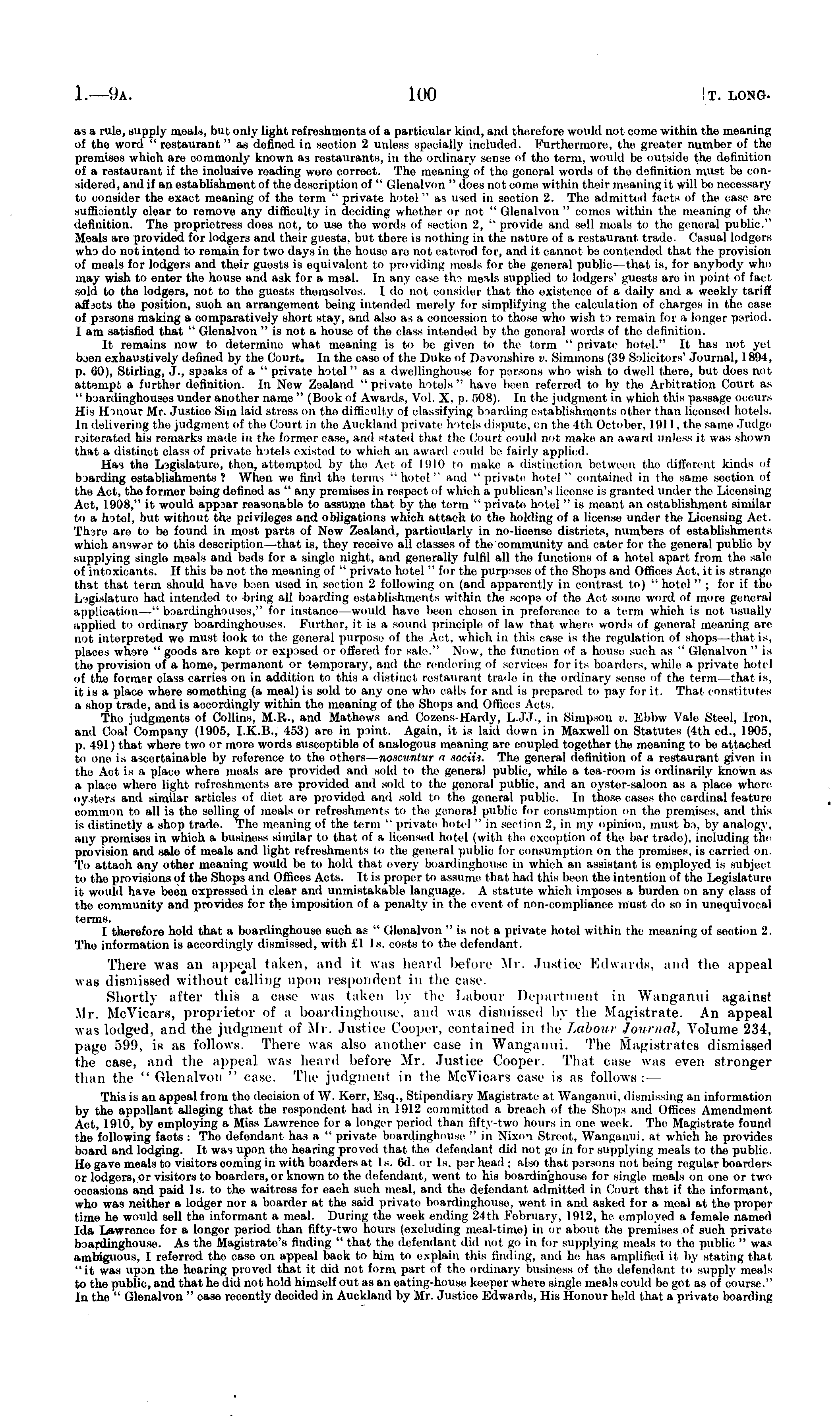as a rule, supply luoaU, but only light refreshments of a particular kind, and therefore would not oome within the meaning of the word "restaurant" as defined in section 2 unless specially included. Furthermore, the greater number of the premises which are commonly known as restaurants, in the ordinary sense of the term, would be outside the definition of a restaurant if tho inclusive reading wore correct. The meaning of the general words of the definition must be oon sidered, and if an establishment of the description of " Qlenalvon " does not come within their meaning it will Ik< necessary to consider the exact meaning of tho term " private hotel "us used in section 2. The admitted facts of the ease are sufficiently clear to romove any difficulty in deciding whether or not " Glenalvon " comes within the meaning of the definition. The proprietress does not, to use tho words of section 2, "provide and sell meals to the general public." Meals are provided for lodgers and their guests, but there is nothing in the nature of a restaurant trade. ( !asua) lodger who do not intend to remain for two days in the house are not catered tor, and it oannot be contended that the provision of meals for lodgers and their guests is equivalent to providing meals for the general public—that is, for anybody who may wish to enter tho house and ask for a maal. In any oase ill meals euppUecl to lodgers' guests are in point of fact sold to tho lodgers, not to tho guests themselves. I do not oonsider that the existence of a daily and a weekly tariff afE icts the position, suoh an arrangement being intended merely for simplifying the calculation of charges in the case of parsons making a comparatively short stay, and also in a concession to those who wish t > remain for a. longer period. 1 am satisfiod that " Glenalvon " is not a house of the class intended by the general words of the definition. It remains now to determine what meaning is to be given to the term " private hotel." It has not yet bjen exhaustively defined by the Court. In the oase of the Duke of Devonshire v. Simmons (39 Solicitors' Journal, 1594, p. 60), Stirling, J., speaks of a " private hotel " as a dwellinghouse for persons who wish to dwell there, but does not attempt a further definition. In New Zealand "private hotels" have been referred to by the Arbitration Court as " buardinghouses under another name " (Book of Awards, Vol. X. p. 508). In the judgment in which this passage occurs His Honour Mr. Justice Sim laid stress on the diffloulty of classifying l> larding establishments other than licensed hotels. In delivering the judgment of the Court in the Auckland private hotels dispute, en the 4th October. I 111 I. the same Judge reiterated his remarks made in the former case, and stated that the Court could not make an award unless it was shown that a distinct class of private hotels existed to which an award oould be fairly applied. Has the Legislature, tlvui, attemptod by the Act of 1910 to make a distinction between the different kinds of li lardjng establishments '! When wo find the terms " hotel " and " private hotel " contained in the same section of the Act, the former boing defined as " any premises in respect of which a publican's license is man ted under the Licensing Act, 1908," it would appjar reasonable to assume that by the term " private hotel " is meant an establishment similar to a hotel, but without tha privileges and obligations which attach to the holding of a license under the Licensing Act. Thsre are to be found in most parts of Now Zealand, particularly in no-license districts, numbers of establishments which answer to this description—that is, they receive all classes of the community and cater for the general public by supplying single meals and bods for a single night, and generally fulfil all the functions of a hotel apart from the sale of intoxicants. If this be not the meaning of " private hotel " for the purposes of tho Shops and Offices Act, it is .strange that that term should have been used in section 2 following on (and apparently in contrast to) " hotel " ; for if the Legislature had intended to bring all boarding establishments within the scope of the Act some word of more general application—" boardinghouses," for instance—would have been chosen in preference to a term which is not usually applied p> ordinary baardinghouses. Further, it is a sound principle of law that where words of general meaning are not interpreted we must look to the general purpose of the Act, which in this case is the regulation of shops—that is, plaoea where " goods are kept or exj) >sed or offered for Bale," Now. the function of a house such as " Glenalvon "is the provision of a home, permanent or temporary, and the rendering of services for its boarders, while a private hotel of the former class carries on in addition to this a distinct restaurant trade in the ordinary sense of the term —that is, it is a place where something (a meal) is sold to any one who calls for and is prepared to pay for it. That constitutes a shop trade, and is accordingly within the meaning of the Shops and Offices Acts. The judgments of Collins, M.K., and Mathews and Cozens Hardy, L.J J., in Simpson V. Ebbw Vale Steel, Iron, and Coal Company (1905, 1.X.8., 453) are in paint. Again, it is laid down in Maxwell on Statutes (4th cd., 1905, p, l!tl) that where two or more words susceptible of analogous meaning are coupled together the meaning to be attached to one is ascertainable by reference to tho others— noscuntur <i eoCxil. The general definition of a restaurant given in the Act is a place where meals are provided and sold to the general public, while a tea-room is ordinarily known as a place whero light refreshments are provided and sold to the general public, and an oyster-saloon as a place where oysters and similar articles of diet are provided and sold to the general public. In these cases the cardinal feature common to all is the sel