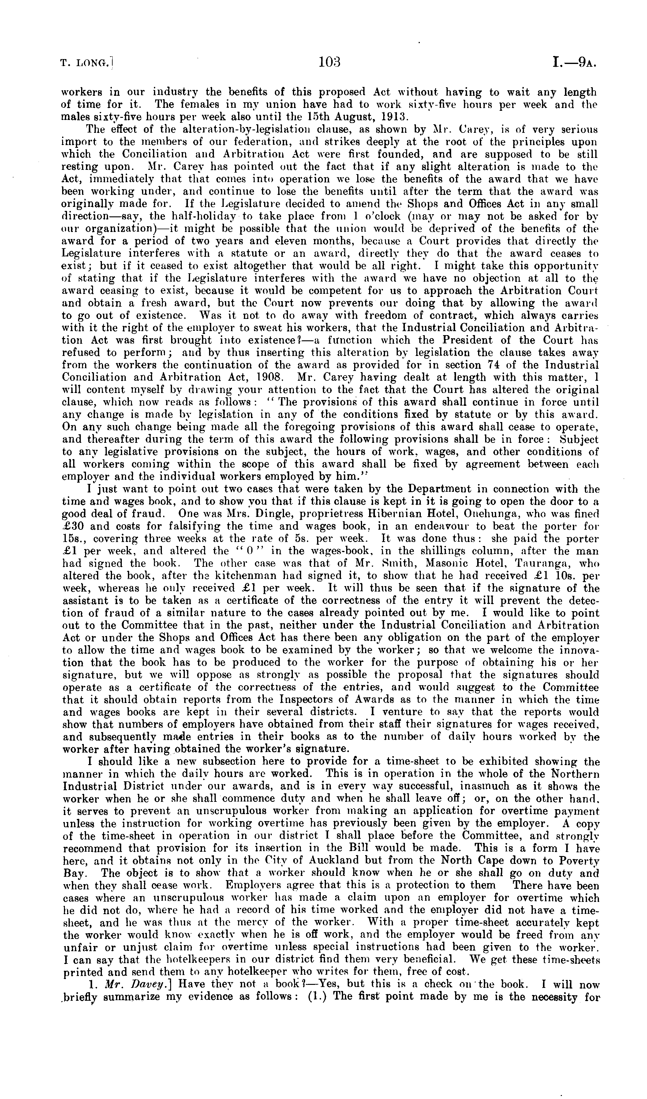 workers in our industry the benefits of this proposed Act without having to wait any length of time for it. The females in my union have had to work sixty-five hours per week and the males sixty-five hours per week also until the 15th August, 1913. The effect of the alteration-by-legislation clause, as shown by Mr. Carey, is of very serious import t<> the members of our federation, and strikes deeply at the root of the principles upon which the Conciliation and Arbitration Act were first founded, and are supposed to be still resting upon. Mr. Carey has pointed out the fact that if any slight alteration is made to the Act, immediately that that comes into operation we loee the benefits of the award thai we have been working under, and continue to lose the benefits until after the term that the award was originally made for. It' the Legislature decided to amend the Shops and Offices Act in any small direction —say, the half-holiday to take place from 1 o'clock (may or may not be asked for by our organization)—it might be possible that the union would be deprived of the benefits of the award for a period of two years and eleven months, because a Court provides that directly the Legislature interferes with a statute or an award, directly they do that the award ceases to exist; but if it ceased to exist altogether that would be all right. I might take this opportunity of stating that if the Legislature interferes with the award we have no objection at all to the award ceasing to exist, because it would be competent for us to approach the Arbitration Court and obtain a fresh award, but the Court now prevents our doing that by allowing the award to go out of existence. Was it not to do away with freedom of contract, which always carries with it the right of the employer to sweat his workers, that the Industrial Conciliation and Arbitration Act was first brought into existence?—a function which the President of the Court has refused to perform; and by thus inserting this alteration by legislation the clause takes away from the workers the continuation of the award as provided for in section 74 of the Industrial Conciliation and Arbitration Act, 1908. Mr. Carey having dealt at length with this matter, 1 will content myself by drawing your attention to the fact that the Court has altered the original clause, which now leads as follows: "The provisions of this award shall continue in force until any change is made by legislation in any of the conditions fixed by statute or by this award. On any such change l>eing made all the foregoing provisions of this award shall cease to operate, and thereafter during the term of this award the following provisions shall be in force: Subject to any legislative provisions on the subject, the hours of work, wages, and other conditions of all workers coming within the scope of this award shall be fixed by agreement between each employer and the individual workers employed by him. , '' I just want to point out two cases that were taken by the Department in connection with the time and wages book, and to show you that if this clause is kept in it is going to open the door to a good deal of fraud. One was Mrs. Dingle, proprietress Hibernian Hotel, Onehunga, who was fined £30 and costs for falsifying the time and wages book, in an endeavour to beat the porter for 155., covering three weeks at the rate of ss. per week. It was done thus : she paid the porter £1 per week, and altered the " 0 " in the wages-book, in the shillings column, after the man had signed the book. The other case was that of Mr. Smith, Masonic Hotel, Tauranga, who altered the book, after the kitchenman had signed it, to show that he had received £1 10s. per week, whereas he only received £1 per week. It will thus be seen that if the signature of the assistant is to be taken as a certificate of the correctness of the entry it will prevent the detection of fraud of a similar nature to the cases already pointed out by me. I would like to point out to the Committee that in the past, neither under the Industrial Conciliation and Arbitration Act or under the Shops and Offices Act has there been any obligation on the part of the employer to allow the time and wages book to be examined by the worker; so that we welcome the innovation that the book has to be produced to the worker for the purpose of obtaining his or her signature, but we will oppose as strongly as possible the proposal that the signatures should operate as a certificate of the correctness of the entries, and would suggest to the Committee that it should obtain reports from the Inspectors of Awards as to the manner in which the time and wages books are kept in their several districts. I venture to say that the reports would show that numbers of employers have obtained from their staff their signatures for wages received, and subsequently made entries in their books as to the number of daily hours worked by the worker after having obtained the worker's signature. I should like a new subsection here to provide for a time-sheet to be exhibited showing the manner in which the daily hours are worked. This is in operation in the whole of the Northern Industrial District under our awards, and is in every way successful, inasmuch as it shows the worker when he or she shall commence duty and when he shall leave off; or, on the other hand, it serves to prevent an unscrupulous worker from making an application for overtime payment unless the instruction for working overtime has previously been given by the employer. A copy of the time-sheet in operation in our district I shall place before the Committee, and strongly recommend that provision for its insertion in the Bill would be made. This is a form I have here, and it obtains not only in the City of Auckland but from the North Cape down to Poverty Bay. The object is to show that a worker should know when he or she shall go on duty and when they shall cease work. Employers agree that this is
