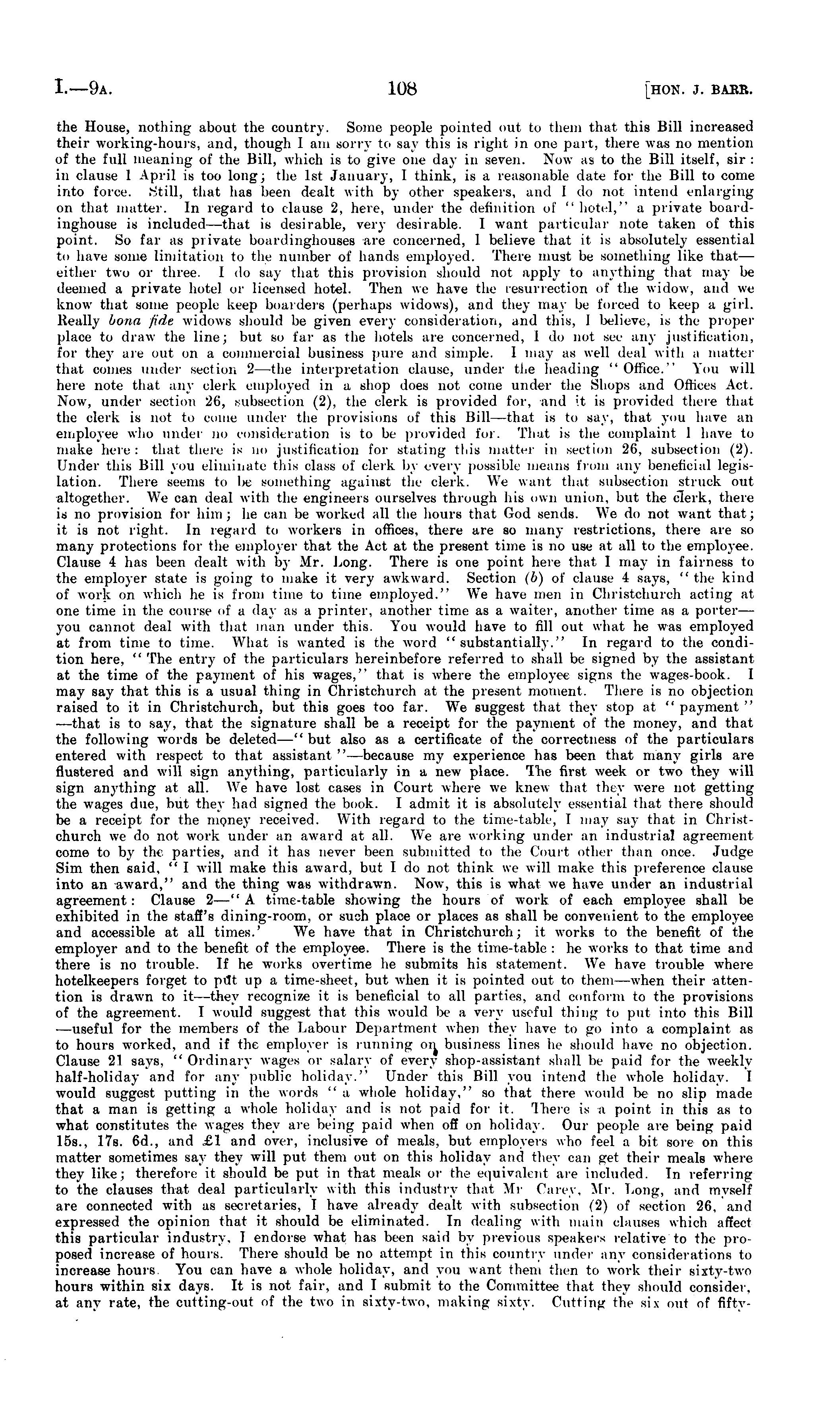 the House, nothing about the country. Some people pointed out to them that this Bill increased their working-hours, and, though I am sorry to say this is right in one part, there was no mention of the full meaning of the Bill, which is to give one day in seven. Now as to the Bill itself, sir: in clause 1 April is too long; the Ist January, I think, is a reasonable date for the Bill to come into force. Still, that has been dealt with by other speakers, and 1 do not intend enlarging on that matter. In regard to clause 2, here, under the definition of " hotel," a private boardinghouse is included —that is desirable, very desirable. I want particular note taken of this point. So far as private boardinghouses are concerned, I believe that it is absolutely essential to have some limitation to the number of bands employed. There must be something like that— either two or three. 1 do say that this provision should not apply to anything that may be deemed a private hotel or licensed hotel. Then we have the resurrection of the widow, and we know that some people keep boarders (perhaps widows), and they may be forced to keep a girl. Really bona fide widows should be given every consideration, and this, 1 believe, is tin , proper place to draw the lino; but so far as the hotels are concerned, 1 do not see any justification, for they are out on a commercial business pure and simple. 1 may as well deal with a matter that conies under section 2—the interpretation clause, under tl.e heading "Office." You will here note that any clerk employed in a shop does not come under the Simps and Offices Act. Now, under section 26, subsection (2), the clerk is provided for, and it is provided there that the clerk is not to Come under the provisions of this Bill—that is to say. that you have an employee wiio under no consideration is to be provided for. That is the complaint I have to make here: that there is no justification for stating this matter in section 2(i. subsection (2). Under this Bill you eliminate this class of clerk by every possible means from any beneficial legislation. There seems to be something against the clerk. We want that subsection struck out altogether. We can deal with the engineers ourselves through his own union, but the clerk, there is no provision for him ;he can be worked all the hours that God sends. We do not want that ; it is not right. In regard to workers in offices, there are so many restrictions, there are so many protections for the < mployer that the Act at the present time is no use at all to the employee. Clause 4 has been dealt with by Mr. Long. There is one point here that 1 may in fairness to the employer state is going to make it very awkward. Section (b) of clause i says. " the kind of work on which he is from time to time employed." We have men in Christchurch acting at one time in the course of a day as a printer, another time as a waiter, another time as a porter — you cannot deal with that man under this. You would have to fill out what he was employed at from time to time. What is wanted is the word " substantially." In regard to the condition here, " The entry of the particulars hereinbefore referred to shall be signed by the assistant at the time of the payment of his wages," that is where the employee signs the wages-book. I may say that this is a usual thing in Christchurch at the present moment. There is no objection raised to it in Christchurch, but this goes too far. We suggest that they stop at " payment " —that is to say, that the signature shall be a receipt for the payment of the money, and that the following words be deleted —" but also as a certificate of the correctness of the particulars entered with respect to that assistant " —because my experience has been that many girls are flustered and will sign anything, particularly in a new place. Ilie first week or two they will sign an3 - thing at all. We have lost cases in Court where we knew that they were not getting the wages due, but they had signed the book. I admit it is absolutely essential that there should be a receipt for the money received. With regard to the time-table, f may say that in Christchurch we do not work under an award at all. We are working under an industrial agreement come to by the parties, and it has never been submitted to the Court other than once. Judge Sim then said, " I will make this award, but I do not think we will make this preference clause into an award," and the thing was withdrawn. Now, this is what we have under an industrial agreement: Clause 2—"A time-table showing the hours of work of each employee shall be exhibited in the staff's dining-room, or such place or places as shall be convenient to the employee and accessible at all times.' We have that in Christchurch; it works to the benefit of the employer and to the benefit of the employee. There is the time-table :he works to that time and there is no trouble. If he works overtime he submits his statement. We have trouble where hotelkeepers forget to pilt up a time-sheet, but when it is pointed out to them —when their attention is drawn to it—they recognize it is beneficial to all parties, and conform to the provisions of the agreement. I would suggest that this would be a very useful thing to put into this Bill —useful for the members of the Labour Department when they have to go into a complaint as to hours worked, and if the employer is running on business lines he should have no objection. Clause 21 says, " Ordinary wages or salary of every shop-assistant shall be paid for the weekly half-holiday and for any public holiday." Under this Bill you intend the whole holiday. I would suggest putting in the words " a whole holiday," so that there would lie no slip made that a man is getting a whole holiday and is not paid for it. There is a point in this as to what constitutes the wages they are being paid when off on holiday. Our people are being paid 155., 17s. 6d., and .£1 and over, i