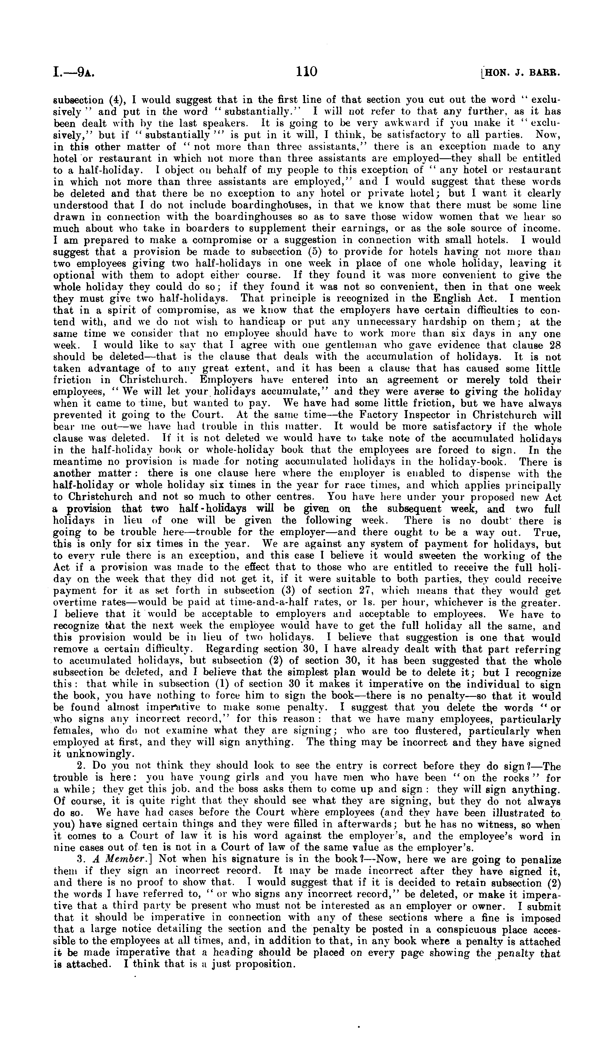 subsection (4), I would suggest that in the first line of that section you cut out the word " exclusively " and put in the word " substantially." I will not refer to that any further, as it has been dealt witli by tiie last speakers. It is going to be very awkward if you make it l< exclusively," but if " substantially '" is put in it will, I think, be satisfactory to all parties. Now, in this other matter of " not more than three assistants," there is an exception made to any hotel or restaurant in which not more than three assistants are employed —they shall be entitled to a half-holiday. I object on behalf of my people to this exception of " any hotel or restaurant in which not more than three assistants are employed," and I would suggest that these words be deleted and that there be no exception to any hotel or private hotel; but I want it clearly understood that I do not include boardinghoVises, in that we know that there must be some line drawn in connection with the boardinghouses so as to save those widow women that we hear so much about who take in boarders to supplement their earnings, or as the sole source of income. I am prepared to make a compromise or a suggestion in connection with small hotels. I would suggest that a provision be made to subsection (5) to provide for hotels having not more than two employees giving two half-holidays in one week in place of one whole holiday, leaving it optional with them to adopt either course. If they found it was more convenient to give the whole holiday they could do so; if they found it was not so convenient, then in that one week they must give two half-holidays. That principle is recognized in the English Act. I mention that in a spirit of compromise, as we know that the employers have certain difficulties to contend with, and we do not wish to handicap or put any unnecessary hardship on them; at the same time we consider that no employee should have to work more than six days in any one week. I would like to say that I agree with one gentleman who gave evidence that clause 28 should be deleted —that is the clause that deals with the accumulation of holidays. It is not taken advantage of to any great extent, and it has been a clause that has caused some little friction in Christchureh. Employers have entered into an agreement or merely told their employees, "We will let your holidays accumulate," and they were averse to giving the holiday when it came to time, but wanted to pay. We have had some little friction, but we have always prevented it going to the Court. At the same time —the Factory Inspector in Christchureh will bear me out —we have had trouble in this matter. It would be more satisfactory if the whole clause was deleted. If it is not deleted we would have to take note of the accumulated holidays in the half-holiday book or whole-holiday book that the employees are forced to sign. In the meantime no provision is made for noting accumulated holidays in the holiday-book. There is another matter : there is one clause here where the employer is enabled to dispense with the half-holiday or whole holiday six times in the year for race times, and which applies principally to Christchureh and not so much to other centres. You have here under your proposed new Act a provision that two half - holidays will be given on the subsequent week, and two full holidays in lieu of one will be given the following week. There is no doubt' there is going to be trouble here—trouble for the employer—and there ought to be a way out. True, this is only for six times in the year. We are against any system of payment for holidays, but to every rule there is an exception, and this ease I believe it would sweeten the working of the Act if a provision was made to the effect that to those who are entitled to receive the full holiday on the week that they did not get it, if it were suitable to both parties, they could receive payment for it as set forth in subsection (3) of section 27, which means that they would get overtime rates —would be paid at time-and-a-half rates, or Is. per hour, whichever is the greater. I believe that it would be acceptable to employers and acceptable to employees. We have to recognize that the next week the employee would have to get the full holiday all the same, and this provision would be in lieu of two holidays. I believe that suggestion is one that would remove a certain difficulty. Regarding section 30, I have already dealt with that part referring in accumulated holidays, but subsection (2) of section 30, it has been suggested that the whole subsection be deleted, and I believe that the simplest plan would be to delete it; but I recognize this : that while in subsection (1) of section 30 it makes it imperative on the individual to sign the book, you have nothing to force him to sign the book —there is no penalty—so that it would be found almost imperative to make some penalty. I suggest that you delete the words "or who signs any incorrect record," for this reason : that we have many employees, particularly females, who do not examine what they are signing; who are too flustered, particularly when employed at first, and they will sign anything. The thing may be incorrect and they have signed it unknowingly. 2. Do you not think they should look to see the entry is correct before they do sign?— The trouble is here : you have young girls and you have men who have been " on the rocks " for a while; they get this job. and the boss asks them to come up and sign : they will sign anything. Of course, it is quite right that they should see what they are signing, but they do not always do so. We have had cases before the Court where employees (and they have been illustrated to you) have signed certain things and they were filled in afterwards; but he has no witness, so when it comes to a Court of law it is his word against the employer's, and the employee's word in nine cases out of ten is not in a Court of law