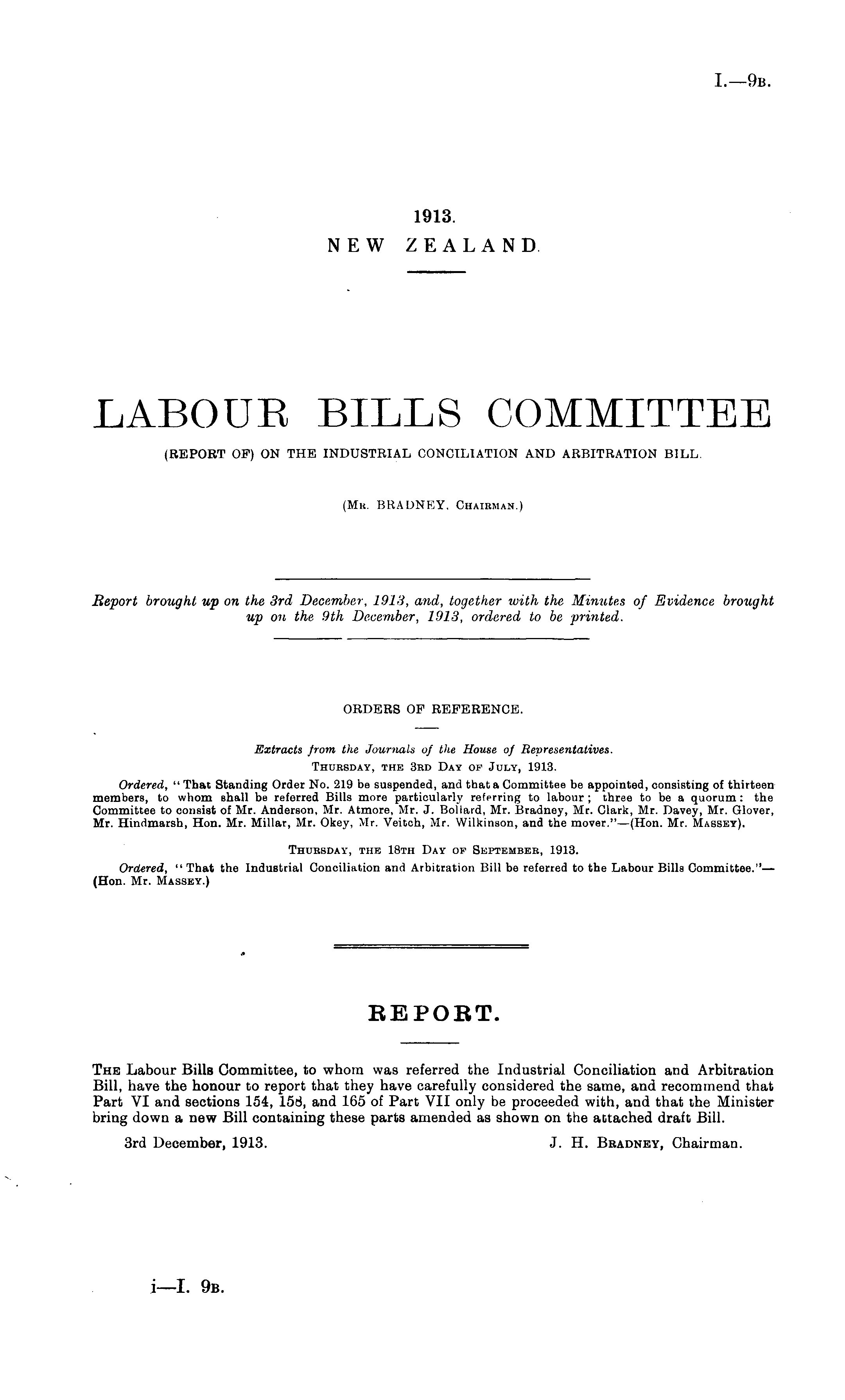 ORDERS OF REFERENCE. Extracts from the Journals of the House of Representatives. Thursday, the 3rd Day op July, 1913. Ordered, " That Standing Order No. 219 be suspended, and that a Committee be appointed, consisting of thirteen members, to whom shall be referred Bills more particularly referring to labour ; three to be a quorum : the Committee to consist of Mr. Anderson, Mr. Atmore, Mr. J. Bollard, Mr. Bradney, Mr. Clark, Mr. Davey, Mr. Glover, Mr. Hindmarsh, Hon. Mr. Millar, Mr. Okey, Mr. Veitch, Mr. Wilkinson, and the mover."—(Hon. Mr. Massey). Thursday, the 18th Day op September, 1913. Ordered, " That the Industrial Conciliation and Arbitration Bill be referred to the Labour Bills Committee."— (Hon. Mr. Massey.)