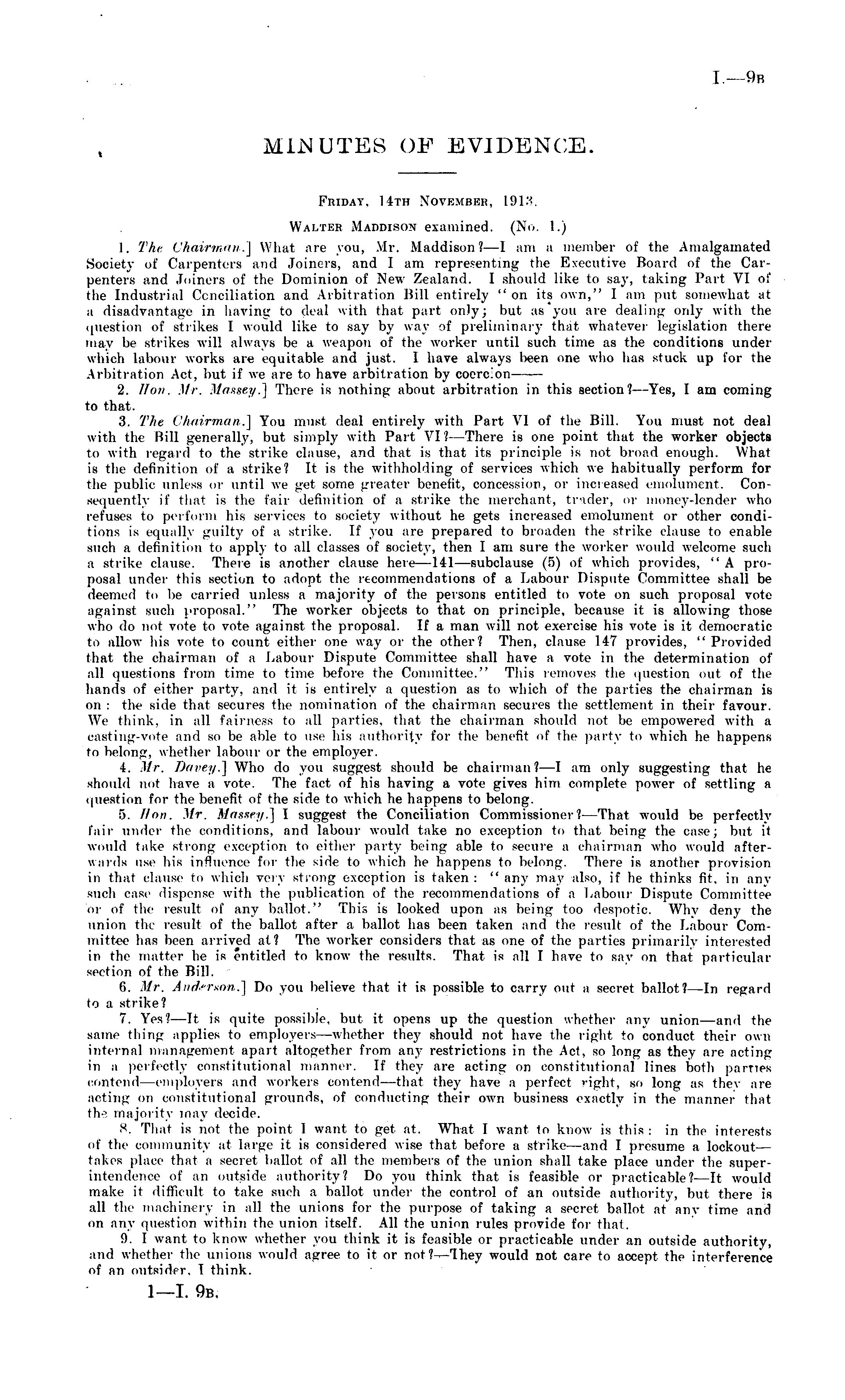 MINUTES OF EVIDENCE. Friday, 11th November, 1913, Walter Maddison examined. (No. I.) 1. Tin ( 'huirihuii . | What are you, Mr. Maddison? —I am a member of the Amalgamated Society of Carpenters and Joiners, and I am representing the Executive Board of the Carpenters and Joiners of the Dominion of New Zealand. I should like to say, taking Part VI of the Industrial Conciliation and Arbitration Hill entirely " on its own," I am put somewhat at a disadvantage in having to deal with that part only; but as you are dealing only with the question of strikes I would like to say by way of preliminary that whatever legislation there may he strikes will always he a weapon of the worker until such time as the conditions under which Labour works are equitable and just. I have always been one who has stuck up for the Arbitration Act, but if we are to have arbitration by coercion 2. Hon. Mr. Massey.] There is nothing about arbitration in this section? —Yes, I am coining to that. 3. The Chairman.] You must deal entirely with Part VI of the Bill. You must not deal with tin Bill generally, but simply with Part VI? —There is one point that the worker objects to with regard to the strike clause, and that is that its principle is not broad enough. What is the definition of a strike? It is the withholding of services which we habitually perform for the public unless or until we get some greater benefit, concession, or increased emolument. Consequently if that is the fair definition of a strike the merchant, trader, or money-lender who refuses to perform his services to society without he gets increased emolument or other conditions is equally guilty of a strike. If you are prepared to broaden the strike clause to enable such a definition to apply to all classes of society, then I am sure the worker would welcome such a strike clause. There is another clause here—l4l—subclause (5) of which provides, "A proposal under this section to adopt the recommendations of a Labour Dispute Committee shall be deemed to lie carried unless a majority of the persons entitled to vote on such proposal vote against such proposal." The worker objects to that on principle, because it is allowing those who do not vote to vote against the proposal. If a man will not exercise his vote is it democratic to allow Ins vote to count either one way or the other? Then, clause 147 provides, "Provided that the chairman of a Labour Dispute Committee shall have a vote in the determination of all questions from time to time before the Committee." This removes the question out of the hands of either party, and it is entirely a question as to which of the parties the chairman is on: the side that secures the nomination of the chairman secures the settlement in their favour. We think, in all fairness to all parties, that the chairman should not he empowered with a easting-vote and so be able to use his authority for the benefit of the party to which he happens to belong, whether labour or the employer. I. I/;-. Davey.] Who do you suggest should be chairman? —I am only suggesting that he should not have a vote. The I'aet of his having a vote gives him complete power of settling a question for the benefit of the side to which he happens to belong. 5. II mi. Mr. Massey.] I suggest the Conciliation Commissioner?— That would be perfectly fail- under the conditions, and labour would take no exception to that being the ease; but it would take strong exception to either party being able to secure a chairman who would afterwards use his influence for the side to which he happens to belong. There is another provision in that clause to which vri\ strong exception is taken : " any may also, if he thinks fit, in any such ease dispense with the publication of the recommendations of a Labour Dispute Committee or of the result of any ballot." This is looked upon as being too despotic. Why deny the union the result of the ballot after a ballot has been taken and the result of the Labour Committee has been arrived at? The worker considers that as one of the parties primarily interested in the matter lie is entitled to know the results. That is all I have to say on that particular section of the Bill. (i. Mr. Andrrxon.] Do you believe that it is possible to carry out a secret ballot?—ln regard to a strike? 7. Yes?—lt is quite possible, but it opens up the question whether any union—and the same thing applies to employers —whether they should not have the right to conduct their own internal management apart altogether from any restrictions in the Act, so long as they are acting in a perfectly constitutional manner. If they are acting on constitutional lines both parries contend—employers and workers contend—that they have a perfect right, B0 long as they are acting on constitutional grounds, of conducting their own business exactly in the manner that tie- majority may decide. 8. That is not the point 1 want to get at. What 1 want to know is this: in the interests of the community at large it is considered wise that before a strike—and I presume a lockout — takes place that a secret ballot of all I he members of the union shall take place under the superintendence of an outside authority? Do you think that is feasible or practicable)—lt would make it difficult to take such a ballot under the control of an outside authority, but there is all the machinery in all the unions for the purpose of taking a secret ballot at any time and on any question within the union itself. All the union rules provide for that. 0. I want to know whether you think it is feasible or practicable under an outside authority, ami whether the unions would agree to it or not? —They would not care to accept the interference of an outsider. I think.