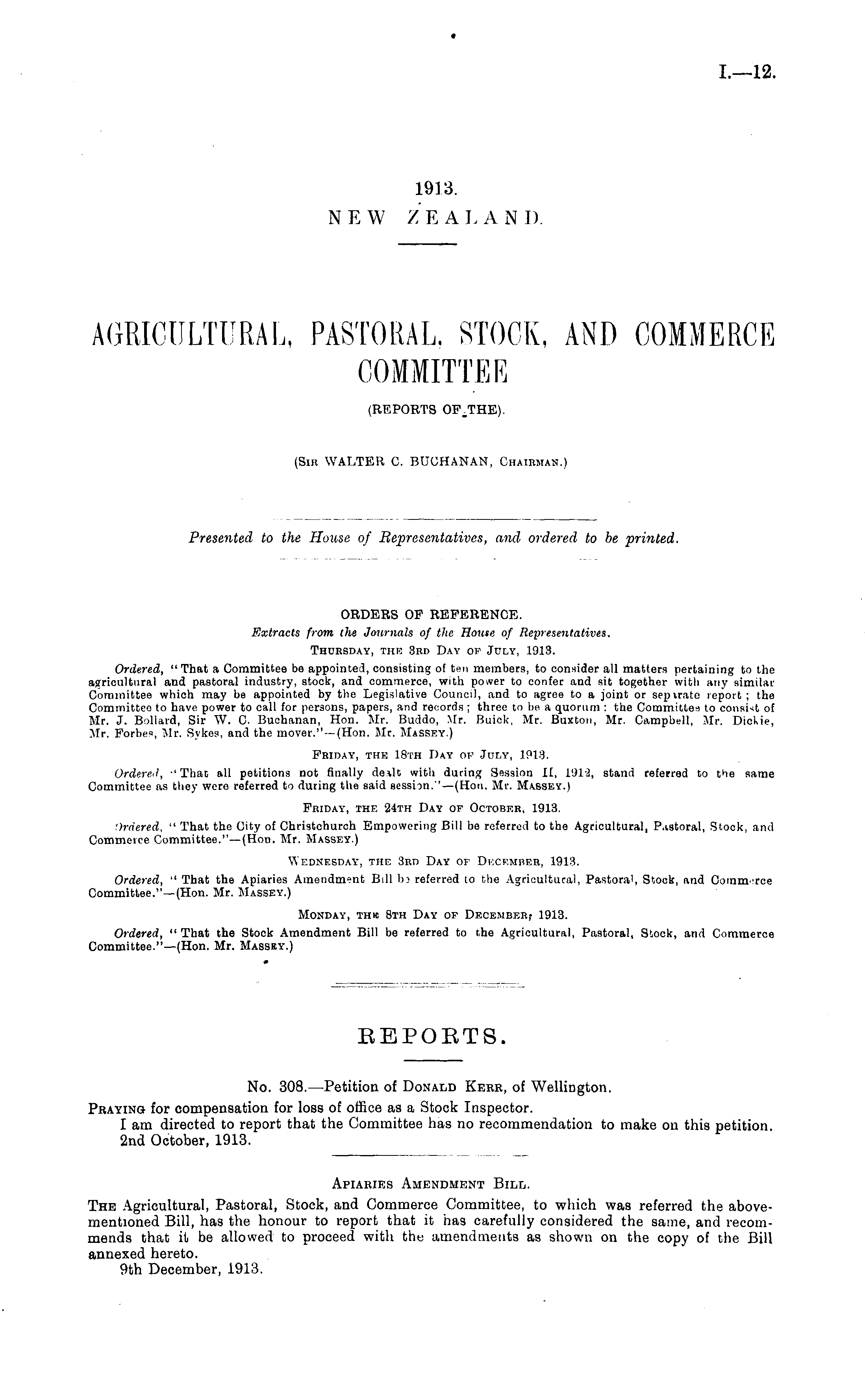 ORDERS OP REFERENCE. Extracts from the Journals of the House, of Representatives. Thursday, the 3rd Day op July, 1913. Ordered, "That a Committee be appointed, consisting of ten members, to consider all matters pertaining to the agricultural and pastoral industry, stock, and commerce, with power to confer and sit together with any similar Committee which may be appointed by the Legislative Council, and to agree to a joint or sepirate report ; tho Committee to have power to call for persons, papers, and records; three to be a quorum : the Commutes to consist of Mr. J. Bollard, Sir \V. C. Buchanan, Hon. Mr. Buddo, Mr. Buick, Mr. Buxton, Mr. Campbell, Mr. Dickie, Mr. Forbes, Mr. Sykes, and the mover."—(Hon. Mr. Massey.) Friday, the 18th Day op July, 1913. Ordered, -'That all petitions not finally dealt with during Session It, l'Jl-2, stand referred to the same Committee as they were referred to during the said session."—(Hon. Mr. Massey.) Friday, the 24th Day of October, 1913. Ordered, " That the City of Christchurch Empowering Bill be referred to the Agricultural, P.istoral, Stock, and Commerce Committee."—(Hon. Mr. Massey.) Wednesday, the 3rd Day of Dkcember, 1913. Ordered, " That the Apiaries Amendment Bill ba referred to the Agricultural, Pastoral, Stock, and Coinmirce Committee."—(Hon. Mr. Massey.) Monday, thk Bth Day of 1913. Ordered, " That the Stock Amendment Bill be referred to the Agricultural, Pastoral, Stock, and Commerce Committee."—(Hon. Mr. Massey.) ■