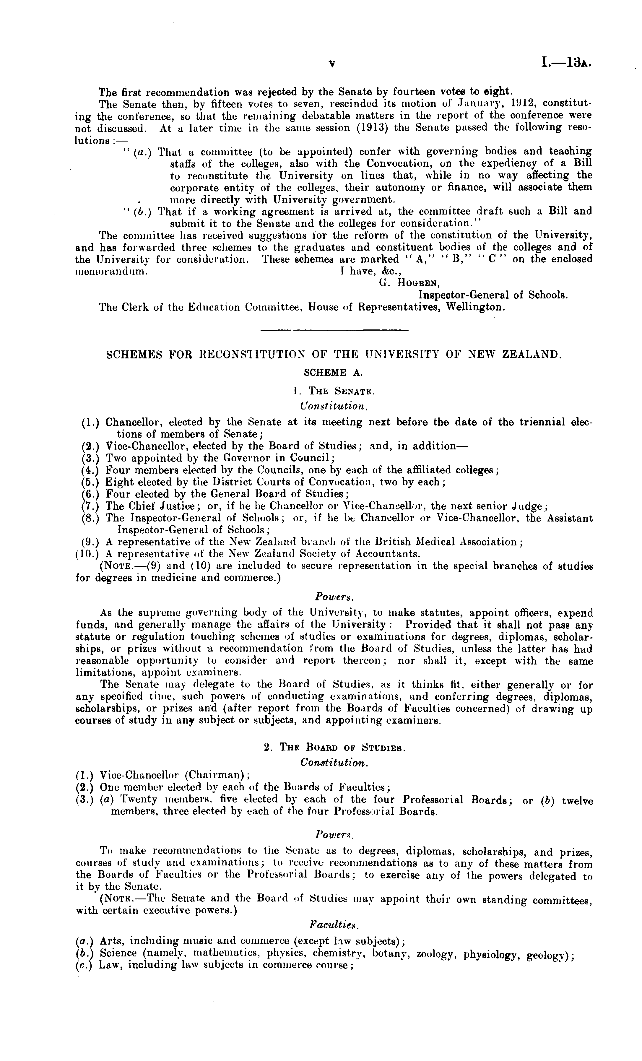 The first recommendation was rejected by the Senate by fourteen votes to eight. The Senate then, by fifteen votes to seven, rescinded its motion of January, 1912, constituting the conference, so that the remaining debatable matters in the report of the conference were not discussed. At a later time in the same session (1913) the Senate passed the following resolutions : — " (a.) That v committee (to be appointed) confer with governing bodies and teaching staffs of the colleges, also with the Convocation, on the expediency of a Bill to reconstitute the University on lines that, while in no way affecting the corporate entity of the colleges, their autonomy or finance, will associate them more directly with University government. " (b.) That if a working agreement is arrived at, the committee draft such a Bill and submit it to the Senate and the colleges for consideration. , ' The committee has received suggestions for the reform of the constitution of the University, and has forwarded three schemes to the graduates and constituent bodies of the colleges and of the University for consideration. These schemes are marked " A," " B," "C " on the enclosed memorandum. I have, &c, (i. HOOBEN, Inspector-General of Schools. The Clerk of the Education Committee, House of Representatives, Wellington.
