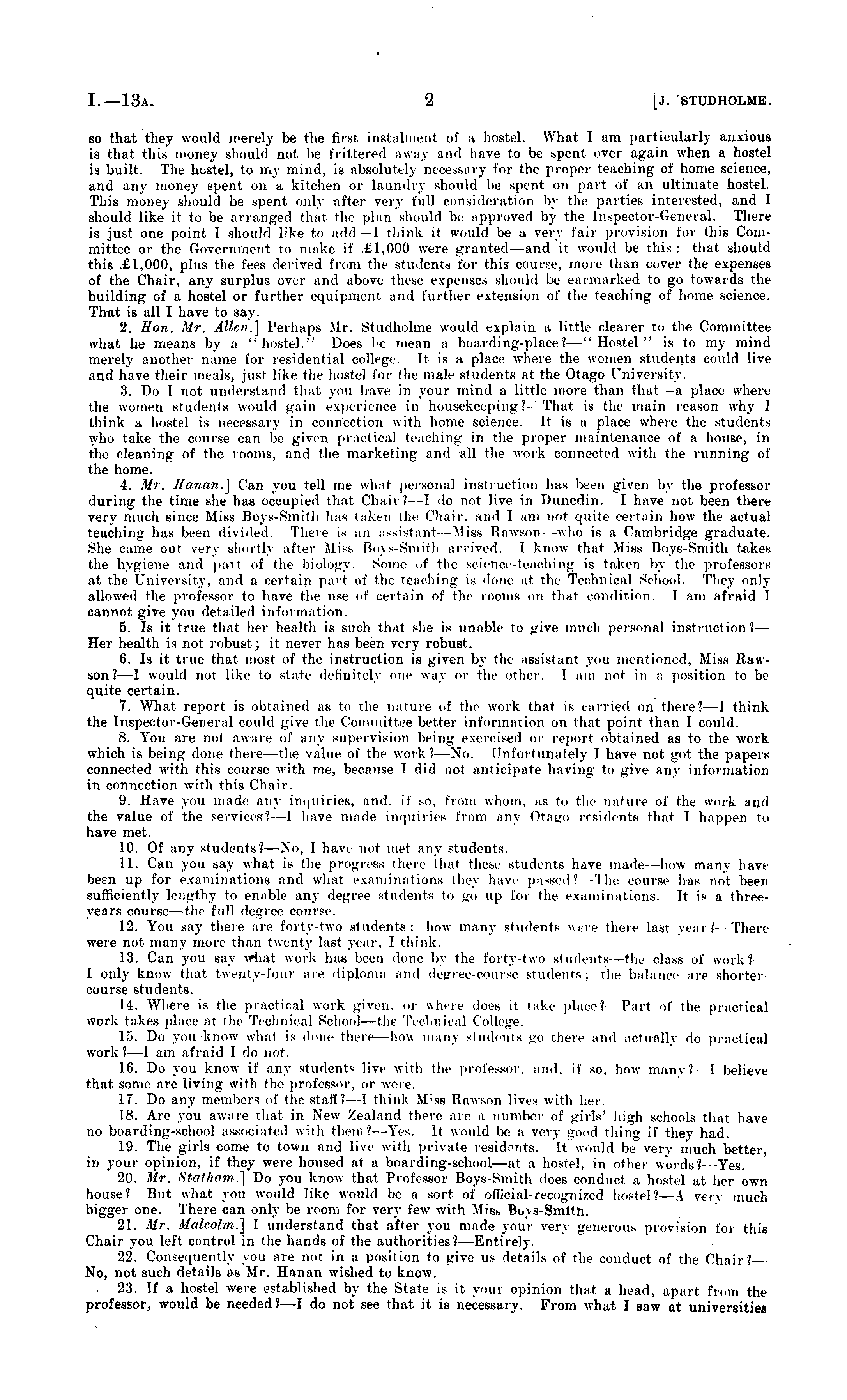 so that they would merely be the first instalment of a hostel. What 1 am particularly anxious is that this money should not be frittered away and have to be spent over again when a hostel is built. The hostel, to my mind, is absolutely necessary for the proper teaching of home science, and any money spent on a kitchen or laundry should be spent on part of an ultimate hostel. This money should be spent only after very full consideration by tin , parties interested, and 1 should like it to be arranged that the plan should be approved by the Inspector General. There is just one point I should like to add —1 think it would be a very lair provision for this Committee or the Government to make if £1,000 were granted—and it would be this: that should this £1,000, plus the fees derived from the students for this oourse, more than cover the expenses of the Chair. an\ surplus over ami above these expenses should Iμ , earmarked to go towards the building of v hostel or further equipment and further extension of the teaching of home science. That is all I have to say. 2. Hon. Mr. Allen.] Perhaps Mr. Studholme would explain a little clearer to the Committee what he means by a "hostel." Does Iμ mean a boarding-place I—"Hostel"1 —"Hostel" is to my mind merely another name for residential college. It is a place where the women students could live and have their meals, just like the hostel for the male students at the Otago University. 3. Do I not understand that you have in your mind a little move than thai a place where the women students would gain experience in housekeeping I—That1 —That is the main reason why I think a hostel is necessary in connection with home science. It is a place where the students who take the course can be given practical teaching in the proper maintenance of a house, in the cleaning of the rooms, and the marketing and all the work connected with the running of the home. 4. Mr, ll<niini.\ Can you tell me what personal instruction has been given by the professor during the time she has occupied that Chaii I 1 do not live in Dunedin. I have not been there very much since Miss Boys-Smith lias taken the Chair, ami I am not quite certain how the actual teaching has been divided. There is an assistant-—Miss Rawson who is a Cambridge graduate. She came out very shortly after Mi>s Boys-Smith arrived. I know that Miss Boys-Smith takes the hygiene and part of the biology. Some of the science-teaching is taken by the professors at the University, and a certain part of tin teaching is 'lone at the Technical School. They only allowed the professor to have the use of certain of the rooms on that condition. 1 am afraid 1 cannot give you detailed information. 5. Is it true that her health is such that she is unable to give much personal instruction) — Her health is not robust; it never has been very robust. 6. Is it true that most of the instruction is given by the assistant you mentioned. Miss Hawson?—l would not like to state definitely one way or the other. I am not in a position to be quite certain. 7. What report is obtained as to the nature of the work that is carried on there.' —I think the Inspector-General could give the Committee better information on that point than I could. 8. You are not aware of any supervision being exercised or report obtained as to the work which is being done there —the value of the work ?-—No. Unfortunately I have not got the papers connected with this course with me, because I did not anticipate having to give any information in connection with this Chair. 9. Have you made any inquiries, and. if so, from whom, as to the nature of the work and the value of the services.' I have made inquiries from any Otago residents that I happen to have met. 10. Of any students >. - --No, I have not met any students. 11. Can you say what is the progress there that these students have made -how many have been up for examinations and what examinations they have passed? -Ihe course has not been sufficiently lengthy to enable degree students to go up for the examinations. It is a threeyears course —the full degree course. 12. You say there are forty-two students: how many students were there last year? Then , were not many more than twenty last year. I think. 13. Can you say vrhat work has been done l>> the forty-two students—the class of work? — I only know that twenty-four are diploma and degree-course students; the balance are shortercourse students. 14. Where is the practical work given, or wheri' does it take place.' Part of the practical work takes place at the Technical School— the Technical College. 15. Do you know what is done there how many students go there ami actually do practical work?—l am afraid I do not. 16. Do you know if any students live with the professor, and, if so. how many?—l believe that some are living with the professor, or were. 17. Do any members of the staff?—l think Miss Rawson lives with her. 18. Are you aware that in New Zealand there are a number of girls' high schools that have no boarding-school associated with them?- -Yes. It would be a very good thing if they had. 19. The girls come to town and live with private residents. It would be very much better, in your opinion, if they were housed at a boarding-school —at a hostel, in oilier words?— Yes. 20. Mr. StathamJ] Do you know that Professor Boys-Smith does conduci a hostel at her own house? But what you would like would be a sort of official-recognized hostel? —A very much bigger one. There can only be room for very few with Mis*. Buvs-Smlth. 21. Mr. Malcolm.] I understand that after you made your very generous provision for this Chair you left control in the hands of the authorities'? —Entirely. 22. Consequently you are not in a position to give us details of the conduct of the Chair? No, not such details as Mr. Hanan wished to know. 23. If a hostel were established by the State is it your opinion that a head, apart from the professor, w