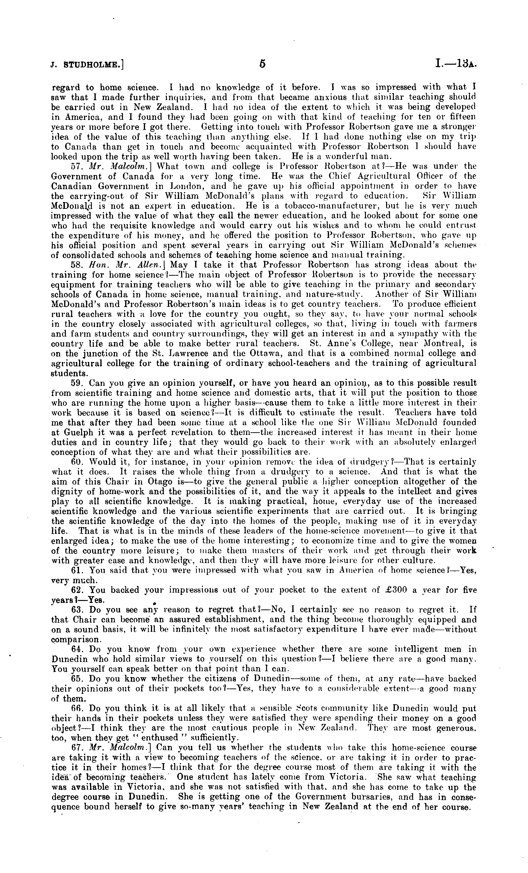 regard to home science. I had no knowledge of it before. I was so impressed with what I saw that I made further inquiries, and from that beoame anxious that similar teaching should be carried out in New Zealand. 1 had no idea of the extent to which it was being developed in America, and 1 found they had been going on with that kind of teaching i'or ten or fifteen pears or more before I got there. Getting into touch with Professor Robertson gave me a stronger idea of the value of this teaching than anything else. If I had done nothing vise on my trip to Canada than get in touch and become acquainted with Professor Robertson I should have looked upon the trip as well worth having been taken. He is a wonderful man. 57. Mr. Malcolm.] What town and college is Professor Robertson at? — He was under the Government of Canada for a very long time. He was the Chief Agricultural Officer of the Canadian Government in London, and he gave up his official appointment in order to have the carrying-out of Sir William McDonald's plans with regard to education. Sir William McDonald is not an expert in education. He is a tobacco-manufacturer, but he is very much impressed with the value of what they call the newer education, and he looked about for some one who had the requisite knowledge and would carry out his wishes and to whom he could entrust the expenditure of his money, and he offered the position to Professor Robertson, who gave up his official position and spent several years in carrying out Sir William McDonald's schemes of consolidated schools and schemes of teaching home science and manual training. 58. Hon. Mr. Allen.] May 1 take it that Professor Robertson has strong ideas about the training for home science? —The main object of Professor Robertson is to provide the necessary equipment for training teachers who will be able to give teaching in tin primary and secondary schools of Canada in home science, manual training, and nature-study. Another of Sir William McDonald's and Professor Robertson's main ideas is to get country teachers. To produce efficient rural teachers with a love for the country you ought. 80 they say. to have your normal schools in the country closely associated with agricultural colleges, so that, living in toucli with farmers and farm students and country surroundings, they will get an interest in and a sympathy with the country life and be able to make better rural teachers. St. Anne's College, near Montreal, is on the junction of the St. Lawrence and the Ottawa, and that is a combined normal college and agricultural college for the training of ordinary school-teachers and the training of agricultural students. 59. Can you give an opinion yourself, or have you heard an opinion, as to this possible result from scientific training and home science and domestic arts, that it will put the position to those who are running the home upon a higher basis —cause them to take a little more interest in their work because it is based on science? —It is difficult to estimate the result. Teachers have told me that after they had been some time at a school like the one Sir William McDonald founded at Guelph it was a perfect revelation to them—the increased interest it has meant in their home duties and in country life; that they would go back to their work with an absolutely enlarged conception of what they are and what their possibilities are. 60. Would it, for instance, in your opinion remove the idea of drudgery?— That is certainly what it does. It raises the whole thing from a drudgery to a science. And that is what the aim of this Chair in Otago is—to give the general public a higher conception altogether of the dignity of home-work and the possibilities of it, and the way it appeals to the intellect and gives pla_y to all scientific knowledge. It is making practical, home, everyday use of the increased scientific knowledge and the various scientific experiments that are carried out. It is bringing the scientific knowledge of the day into the homes of the people, making use of it in everyday life. That is what is in the minds of these leaders of the home-science movement- to give it that enlarged idea; to make the use of the home interesting; to economize time and to give the women of the country more leisure; to make them masters of their work and get through their work with greater ease and knowledge, and then they will have more leisure for other culture. 61. You said that you were impressed with what you saw in America of home science? —Yes, very much. 62. You backed your impressions out of your pocket to the extent of £300 a year for five years?— Yes. 63. Do you see any reason to regret that? —No, I certainly see no reason to regret it. If that Chair can become an assured establishment, and the thing become thoroughly equipped and on a sound basis, it will lie infinitely the most satisfactory expenditure I have ever made —without comparison. 64. Do you know from your own experience whether there are some intelligent men in Dunedin who hold similar views to yourself on this question? — l believe there are a good many. You yourself can speak better on that point than 1 can. 65. Do you know whether the citizens of Dunedin —some of them, at any rate have backed their opinions out of their pockets too? —Yes, they have to a considerable extent—-a good many of them. 66. Do you think it is at all likely that a sensible Scots community like Dunedin would put their hands in their pockets unless they were satisfied they were spending their money on a good object , ? —l think they are the most cautious people in New Zealand. Thc\ are most generous. too, when they get " enthused " sufficiently. 67. Mr. Malcolm.] Can you tell us whether the students who take this home-science course are taking it with a view to becoming teachers of the science, or are taking it in order to practice it in their homes? —I think that for the degree course most of them are ta