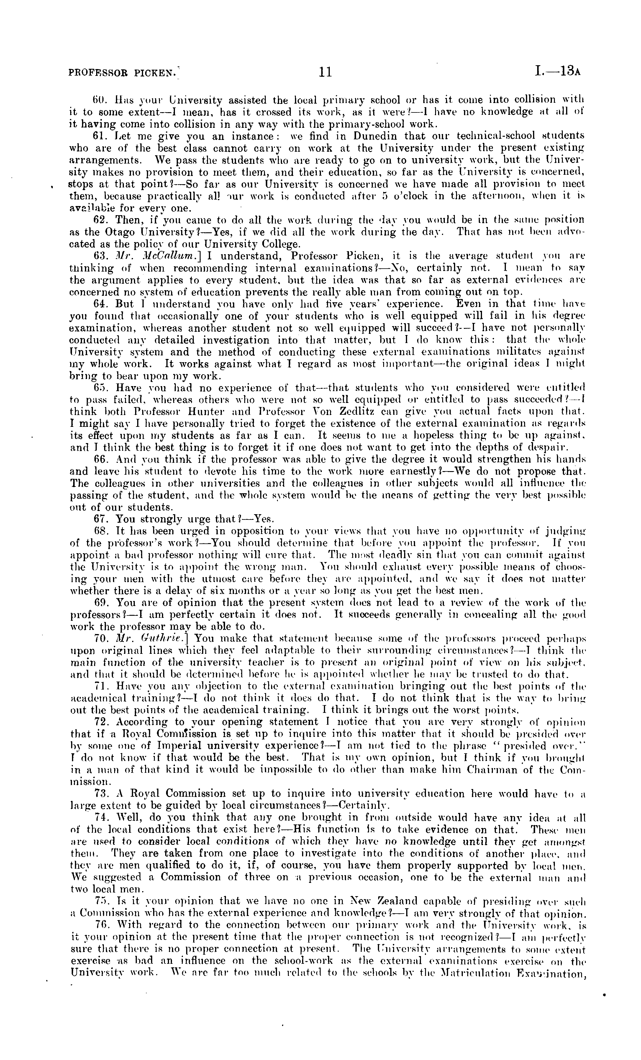 (ill. lias your University assisted the local primary school or has it oome into collision with it to some extent —1 mean, has it crossed its work, as it were?- I have no knowledge at all of it having come into collision in any way with the primary-school work. 61. Let me give you an instance: we find in Dunedin that our teohnical-school students who are of the best class cannot carry on work at the University under the present existing arrangements. We pass the students who are ready to go on to university work, but the University makes no provision to meet them, and their education, so far as the University is concerned, stops at that point?—So far as our University is oonoerned we have made iill provision to meet them, because practically al! >ur work is conducted after ."> o'clock in the afternoon, when it is available for every one. 62. Then, if you came to do all the work during the daj you would be in the same position as the Otago University?— Yes, if we did all the work during the day. That has not been advo cated as the policy of our University College. 63. Mr. McCalliiin .] I understand, Professor Picken, it is the average student you are thinking of when recommending internal examinations? —Xo, certainly not. I mean to say the argument applies to every student, but the idea was that so far as external evidences are concerned no system of education prevents the really able man from coining out on top. 64. But I understand you have only had live years' experience. Even in that lime lime you found that occasionally one of your students who is well equipped will fail in his degree examination, whereas another student not so well equipped will succeed.'--! have not personally conducted any detailed investigation into that matter, but I do know this : that the whole University system and the method of conducting these external examinations militates against my whole work. It works against what T regard as most important —the original ideas I might bring to bear upon my work. (i."). Have you had no experience of that- that- students who you considered were entitled tii pass failed, whereas others who were nol so well equipped or entitled to pass succeeded? I think both Professor Hunter and Professor Yon Zedlitz can give you actual facts upon that. I might say 1 have personally tried to forget the existence of the external examination as regards its effect upon my students as far as I can. It seems to me a hopeless thing to be up against. and 1 think the best tiling is to forget it it' one 'lues nol want to get into tin- depths of despair. 66. And you think if the professor was able to give the degree it would strengthen his hands and leave his student to devote his time to the work more earnestly? —We do not propose that. The colleagues in other universities and the colleagues in other subjects would all influence tin , passing of the student, and the whole system would be the moans of getting the very best possible nut of our students. 67. You strongly urge that?— Yes. 68. It has been urged in opposition to your views that you have no opportunity of judging of tin' professor's work .' -You should determine that before you appoint the professor. If you appoint a bad professor nothing will cure that. The mist deadly sin that you can commit against the University is to appoint the wrong man. You should exhaust every possible means of choosing your men with the utmost care before the] are appointed, and we say it does not matter whether there is a delay of six months or a year so long as you get the best men. 00. You are of opinion that the present system does not lead to a review of the work of tin , professors?—l am perfectly certain it does not. It succeeds generally in concealing all the good work the professor maj be able to do. Til. Mr. <■'tif/tr'i . I You make that statement because some of the professors proceed perhaps upon original lines which they feel adaptable to their surrounding circumstances? — ] think the main Function of the university teacher is to present an original point of view on his subject, and that it should be determined before he is appointed whether he may be trusted to do that. 71. Have you any objection to the external examination bringing out the best points of the academical training?—l do not think it dots do that. Ido not think that is the way to bring out the best points of the academical training. I think it brings out the worst points. 72. According to your opening statement I notice that you are very strongly of opinion that if a Royal Commission is set up to inquire into this matter thai it should be presided over by some one of Imperial university experience.' 1 am not tied to (lie phrase "presided over." 1 do not know if that would be the best. That is my own opinion, but 1 think if you brought in a man of that kind it would be impossible to do other than make him Chairman of the Com mission. 73. A Royal Commission set up to inquire into university education here would have to a large extent to be guided by local circumstances? —Certainly. 71. Well, do you think that any one brought in from outside would have any idea at all of the local conditions that exist here?— His function is to take evidence mi that. These men are used to consider local conditions of which they have no knowledge until they get amongst them. They are taken from one place to investigate into the conditions of another place, and they are men qualified to do it, if, of course, you have them properly supported by local men. We suggested a Commission of three on a previous occasion, one to be the external man and two local men. 7."). Is it your opinion that we have no one in New Zealand capable of presiding over such a Commission who has the external experience and knowledge?—T am very strongly of that opinion. 7(i. With regard to the connection between our primary work and the University work, is it your opinion at the present time that the proper