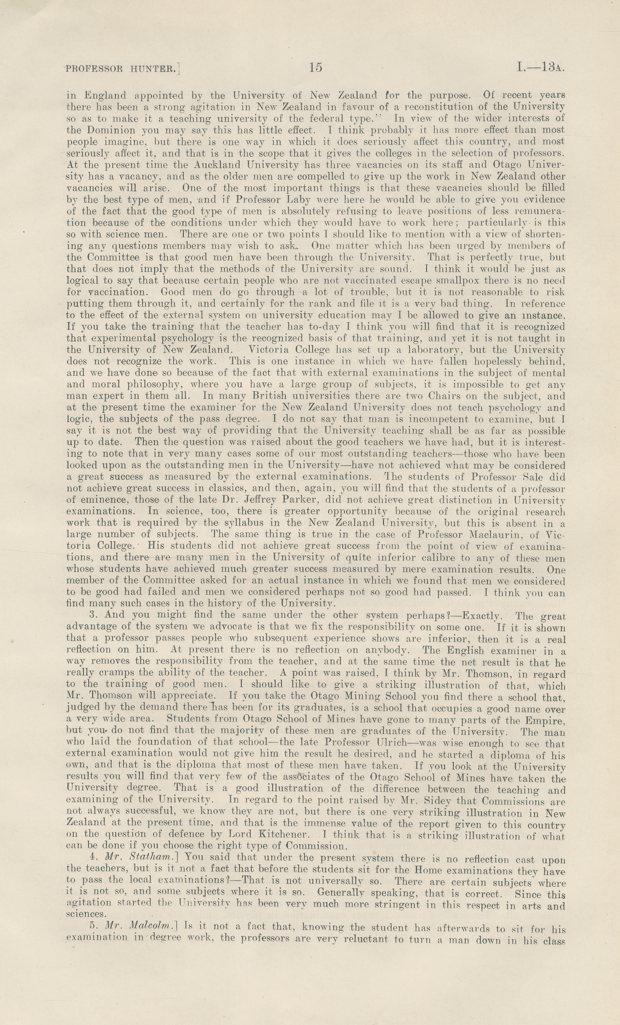 in England appointed by the University of New Zealand for the purpose. Of recent years there has been a strong agitation in New Zealand in favour of a reoonstitution of the University so as to make it a teaching university of the federal type." In view of the wider interests of the Dominion you may say this has little effect. I think probably it lias more effect than most people imagine, but there is one way in which it does seriously affect this country, and most seriously affect it, and that is in the scope that it gives the colleges in the selection of professors. At the present time the Auckland University has three vacancies on its staff and Otago University has a vacancy, and as the older men are compelled to give up the work in New Zealand other vacancies will arise. One of the most important things is that these vacancies should be filled by the best type of men, and if Professor Laby were here he would be able to give you evidence of the fact that the good type of men is absolutely refusing to leave positions of less remuneration because of the conditions under which they would have to work here; particularly-is this so with science men. There are one or two points 1 should like to mention with a view of shortening any questions members may wish to ask,. One matter which lias been urged by members of the Committee is that good men have been through the University. That is perfectly true, but that does not imply that the methods of the University are sound. I think it would be just as logical to say that because certain people who are not vaccinated escape smallpox there is no need for vaccination. Good men do go through a lot of trouble, but it is not reasonable to risk putting them through it, and certainly for the rank and file it is a very bad thing. In reference to the effect of the external system on university education may I be allowed to give an instance. If you take the training that the teacher has to-day I think you will find that it is recognized that experimental psychology is the recognized basis of that training, and yet it is not taught in the University of New Zealand. Victoria College has set up a laboratory, but the University does not recognize the work. This is one instance in which we have fallen hopelessly behind, and we have done so because of the fact that with external examinations in the subject of mental and moral philosophy, where you have a large group of subjects, it is impossible to get any man expert in them all. In many British universities there are two Chairs on the subject, and at the present time the examiner for the New Zealand University does not teach psychology and logic, the subjects of the pass degree. I do not say that man is incompetent to examine, but I say it is not the best way of providing that the University teaching shall be as far as possible up to date. Then the question was raised about the good teachers we have had, but it is interesting to note that in verj' many cases some of our most outstanding teachers—those who have been looked upon as the outstanding men in the University—have not achieved what may be considered a great success as measured by the external examinations. The students of Professor Sale did not achieve great success in classics, and then, again, you will find that the students of a professor of eminence, those of the late Dr. Jeffrey Parker, did not achieve great distinction in University examinations. In science, too, there is greater opportunity because of the original research work that is required by the syllabus in the New Zealand University, but this is absent in a large number of subjects. The same thing is true in the case of Professor Maclaurin. of Victoria College. ■ His students did not achieve great success from the point of view of examinations, and there are many men in the University of quite inferior calibre to any of these men whose students have achieved much greater success measured by mere examination results. One member of the Committee asked for an actual instance in which we found that men we considered to be good had failed and men we considered perhaps not so good had passed. I think you can find many such cases in the history of the University. 3. And you might find the same under the other system perhaps? —Exactly. The great advantage of the system we advocate is that we fix the responsibility on some one. If it is shown that a professor passes people who subsequent experience shows are inferior, then it is a real reflection on him. At present there is no reflection on anybody. The English examiner in a way removes the responsibility from the teacher, and at the same time the net result is that he really cramps the ability of the teacher. A point was raised, I think by Mr. Thomson, in regard to the training of good men. I should like to give a striking illustration of that, which Mr. Thomson will appreciate. If you take the Otago Mining School you find there a school that, judged by the demand there lias been for its graduates, is a school that occupies a good name over a very wide area. Students from Otago School of Mines have gone to many parts of the Empire, but you. do not find that the majority of these men are graduates of the University. The man who laid the foundation of that school —the late Professor Ulrich—was wise enough to see that external examination would not give him the result he desired, and he started a diploma of his own, and that is the diploma that most of these men have taken. If you look at the University results you will find that very few of the assßciates of the Otago School of Mines have taken the University degree. That is a good illustration of the difference between the teaching and examining of the University. In regard to the point raised by Mr. Sidey that Commissions are not always successful, we know they are not, but there is one very striking illustration in New Zealand at the present time, and that is the immense value of the 