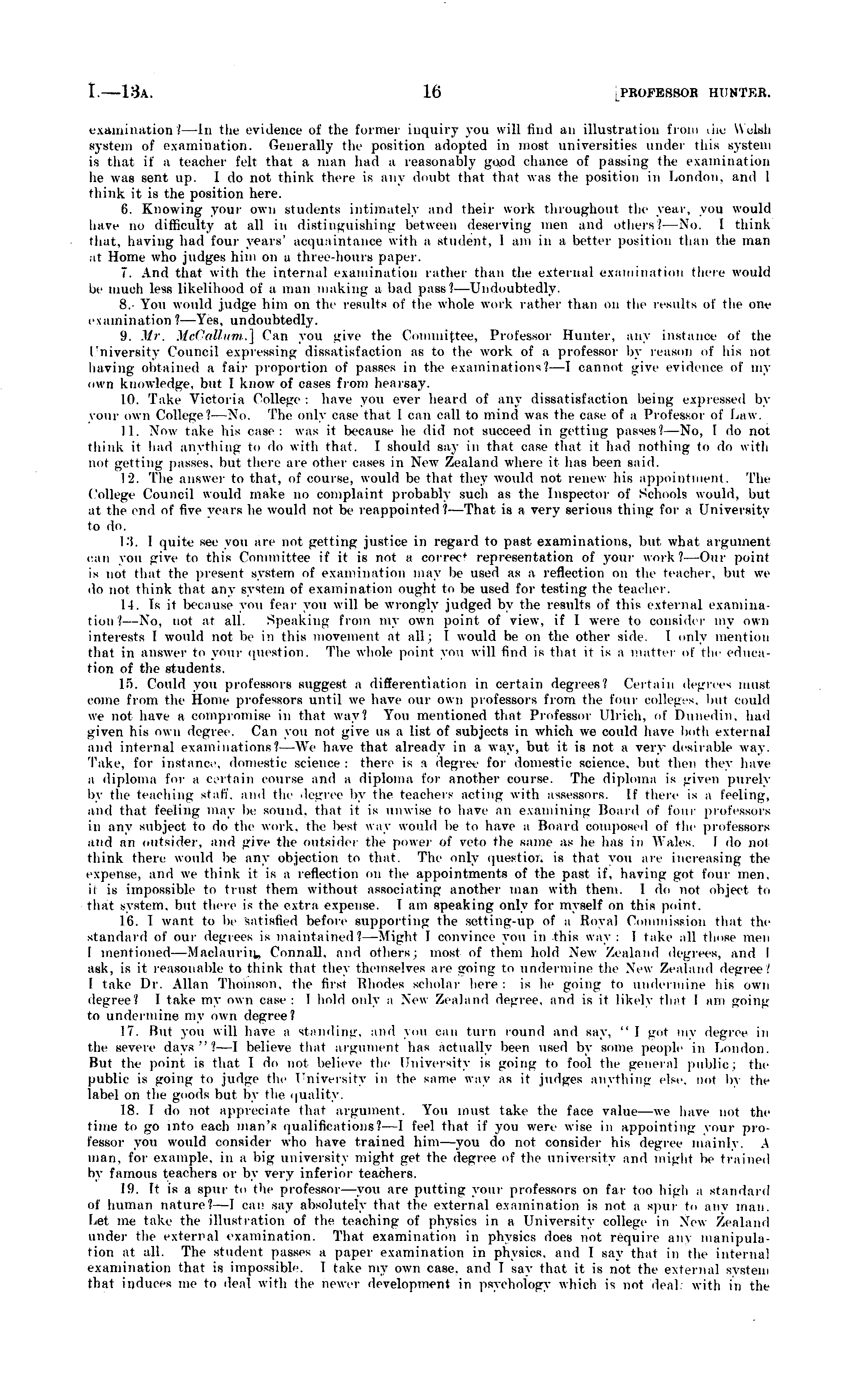 examination I—ld1 — Id the evidence of the former inquiry vmi will find an illustration from lluj \\ eish system of examination. Generally the position adopted in most universities under this system is that if a teacher felt that a man had a reasonably gQpd chance of passing the examination he was sent up. Ido not think there is any doubt that that was the position in London, and I think it is the position here. 6. Knowing your own students intimately and their work throughout the year, you would have no difficulty at all in distinguishing between deserving men and others?— No. 1 think that, haying had four years' acquaintance with a student, I am in a better position than the man n\ Home who judges him on a three-hours paper. 7. And that with the internal examination rather than the external examination then- would lie much less likelihood of a man making a bad pass? —Undoubtedly. 8.- You would judge him on the results of the whole work rather than on the results of the one examination I—Yes,1 —Yes, undoubtedly. 9. Mi\ McCallum.] Can yon give the Committee, Professor Hunter, any instance of the University Council expressing dissatisfaction as to the work of a professor by reason of his not having obtained a fair proportion of passes in the examinations?—[ cannot give evidence of my own knowledge, but 1 know of cases from hearsay. 1(1. Take Victoria College: have you ever heard of any dissatisfaction being expressed by pour own College) — No. The only ease that I can call to mind was the case of a Professor of Law. 11. Now take his ease : was it Ix'cause he did not succeed iii irft 1 intr passes.' Nβ, Ido not think it had anything to do with that. 1 should say in that case that it had nothing to do with nut getting passes, lint there are other eases in New Zealand where it has been said. 12. The answer to that, of course, would be that they would not renew his appointment. The College Council would make no complaint probably such as the Inspector of Schools would, bul at the end of five years lie would not be reappointed I — That is a very serious thing for a University to do. 13. I quite see yon are iml getting justice in regard to past examinations, but what argument can you give to this Committee if it is not a eorrec* representation of your work?— Our point is not that the present system of examination may be used as a reflection on the teacher, but we do not think thai any system of examination might to be used for testing the teacher. 11. Is it because you fear you will be wrongly judged by the results of this external examination .' —No, not at all. Speaking from my own point of view, if I were to considi rmy own interests I would not be in this movement at all; I would he on the other side. I only mention thai in answer to your question. The whole point you will find is thai it is a matte, of the education of the students. l">. Could you professors suggest a differentiation in certain degrees? Certain degrees must come from the Home professors until we have our own professors from the four colleges, but could we not have a compromise in that way? You mentioned that Professor Clrich, of Dunedin, had given his own degree, (.'an you not give us a list of subjects in which we could have both external and internal examinations? —We have that already in a way, but it is not a ver\ desirable way. Take, for instance, domestic science: their is a degree for domestic science, but then they have a diploma lor a certain course and a diploma for another course. The diploma is given purely liv the teaching staff, and the degree by the teachers acting with assessors. If there is a feeling, ami that feeling may be sound, that it is unwise to have an examining Hoard of four professors in any subject to do the work, thy best way would be to have a Board composed of the professors and an outsider, and give the outsider the power of veto the same as he has in Wales. I do not think there would be any objection to that. The only question is that you are increasing tin , expense, and we think it is a reflection "ii the appointments of the past if, having got four men. ii is impossible to trust them without associating another man with them. I do not object to that system, but there is the extra expense. I am speaking only for myself on this point. IC. I want to be satisfied before supporting the setting-up of a Royal Commission that the standard of our degrees is maintained?— Might I convince yon in this way: I take all those men I mentioned—Maolauriq, Connall, and others; most of them hold New Zealand degrees, and I ask, is it reasonable to think that they themselves are going to undermine the New Zealand degree] I take Dr. Allan Thomson, the first Rhodes scholar here: is he going to undermine his own degree? 1 take my own case: I hold only a New Zealand degree, and is it Likely thai 1 am going to undermine my own degree? IT. Hut you will have a Standing, and yon can turn round and say. " I goi mv degree in the severe days"?—] believe that argument has actually been used by some people in London. Mut the point is that I do not believe the University is going to fool the general public; the public is going to judge the University in the same wav as it judges anything else, not by the label on the goods but by the quality. 18. I do not appreciate that argument. You must take the face value—we have not the time to go into each man's qualifications?—l feel that if you were wise in appointing your pro lessor you would consider who have trained him—you do not consider his degree mainly. A man, for example, in a big university might get the degree of the university anil migh< be trained by famous teachers or by very inferior teachers. 19. [t is a spur t<l 'he professor—you are putting your professors on far too high a standard id' human nature.' I can say absolutely that the external examination is not a spur to any man. Let me take the illustration of the teaching of p