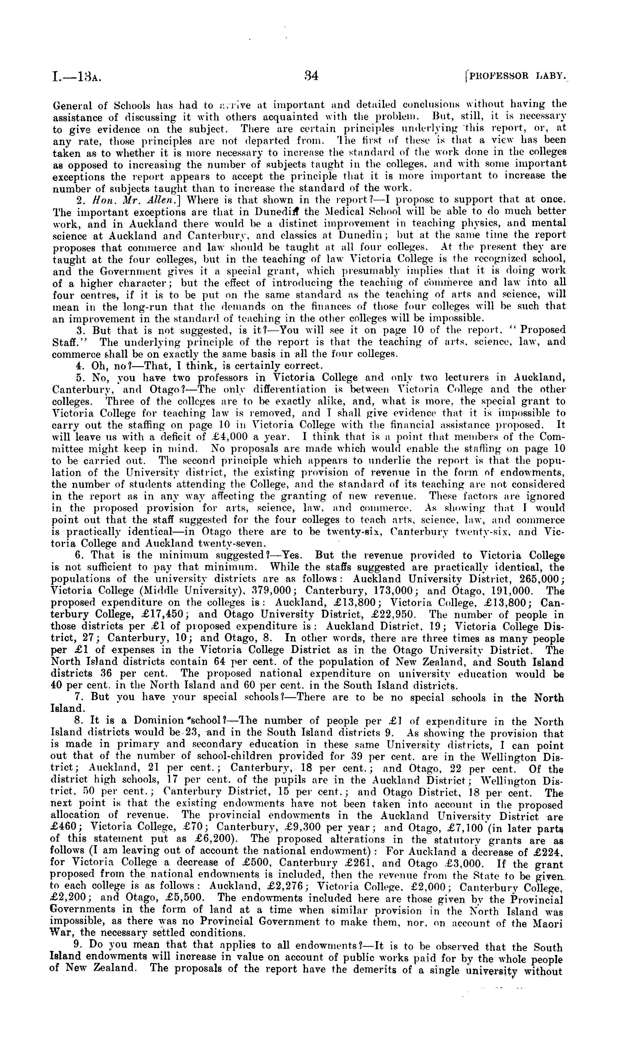 General of Schools has had to a.nve at important and detailed conclusions without having the assistance of discussing it with others acquainted with the problem. But, still, it is necessary to give evidence on the .subject. There are certain principles underlying this report, or, at any rate, those principles are not departed from. 'I he first of these is that a view has been taken as to whether it is more necessary to increase the standard of the work done in the colleges as opposed to increasing the number of subjects taught in the colleges, and with some important exceptions the report appears to accept the principle that it is more important to increase the number of subjects taught than to increase the standard of the work. 2. Hon. Mr. Allen.] Where is that shown in the report?—l propose to support that at once. The important exceptions are that in Dunedirt the Medical School will be able 10 do much better work, and in Auckland there would lie a distinct improvement in teaching physics, and mental science at Auckland and Canterbury, and classics at Dunedin ; but at the same time the report proposes that commerce and law should be taught at all four colleges. At the present they are taught at the four colleges, but in the teaching of law Victoria College is the recognized school, and the Government gives it a special grant, which presumably implies that it is doing work of a higher character; but the effect of introducing the teaching of commerce and law into all four centres, if it is to be put on the same standard as the teaching of arts and science, will mean in the long-run that the demands on the finances of those four colleges will be such that an improvement in the standard of teaching in the other colleges will be impossible. 3. But that is not suggested, is it? —You will see it on page 10 of the report. " Proposed Staff." The underlying principle of the report is that the teaching of arts, science, law. and commerce shall be on exactly the same basis in all the four colleges. i. Oh, no?— That, I think, is certainly correct. 5. No, you have two professors in Victoria College and only two lecturers in Auckland, Canterbury, and Otago?—The only differentiation is between Victoria College and the other colleges. Three of the colleges are to be exactly alike, and, what is more, the special grant to Victoria College for teaching law is removed, and 1 shall give evidence that it is impossible to carry out the staffing on page 10 in Victoria College with the financial assistance proposed. It will leave us with a deficit of £4,000 a year. I think that is a point that members of the Committee might keep in mind. No proposals are made which would enable the stalling on page 10 to be carried out. The second principle which appears to underlie the report is that the population of the University district, the existing provision of revenue in the form of endowments, the number of students attending the College, and the standard of its teaching are not considered in the report as in any way affecting the granting of new revenue. These factors are ignored in the proposed provision for arts, science, law, and commerce. As showing that I would point out that the staff suggested for the four colleges to teach arts, science, law, and commerce is practically identical —in Otago there are to be twenty-six. Canterbury twenty-six, and Victoria College and Auckland twenty-seven. 6. That is the minimum suggested?— Yes. But the revenue provided to Victoria College is not sufficient to pay that minimum. While the staffs suggested are practically identical, the populations of the university districts are as follows: Auckland University District, 265,000; Victoria College (Middle University), 379,000; Canterbury, 173,000; and Otago, 191,000. The proposed expenditure on the colleges is: Auckland, £13,800; Victoria College. £13,800; Canterbury College, £17,450; and Otago University District, £22,950. The number of people in those districts per £1 of proposed expenditure is: Auckland District, 19; Victoria College District, 27; Canterbury, 10; and Otago, 8. In other words, there are three times as many people per £1 of expenses in the Victoria College District as in the Otago University District. The North Island districts contain 64 per cent, of the population of New Zealand, and South Island districts 36 per cent. The proposed national expenditure on university education would be 40 per cent, in the North Island and 60 per cent, in the South Island districts. 7. But you have your special schools? —There are to be no special schools in the North Island. 8. It is a Dominion'school? —The number of people per £1 of expenditure in the North Island districts would be 23, and in the South Island districts 9. As showing the provision that is made in primary and secondary education in these same University districts, I can point out that of the number of school-children provided for 39 per cent, are in the Wellington District; Auckland, 21 per cent.; Canterbury, 18 per cent.; and Otago. 22 per cent. Of the district high schools, 17 per cent, of the pupils are in the Auckland District; Wellington District. 50 per cent.; Canterbury District, 15 per cent.; and Otago District, 18 per cent. The next point is that the existing endowments have not been taken into account in the proposed allocation of revenue. The provincial endowments in the Auckland University District are £460; Victoria College, £70; Canterbury, £9,300 per year; and Otago, £7,100(in later parts of this statement put as £6,200). The proposed alterations in the statutory grants are as follows (I am leaving out of account the national endowment) : For Auckland a decrease of £224. for Victoria College a decrease of £500, Canterbury £261, and Otago £3,000. If the grant proposed from the national endowments is included, then the revenue from the State to be given to each college is as follows: Auckland, £2,276; Victoria Colleg