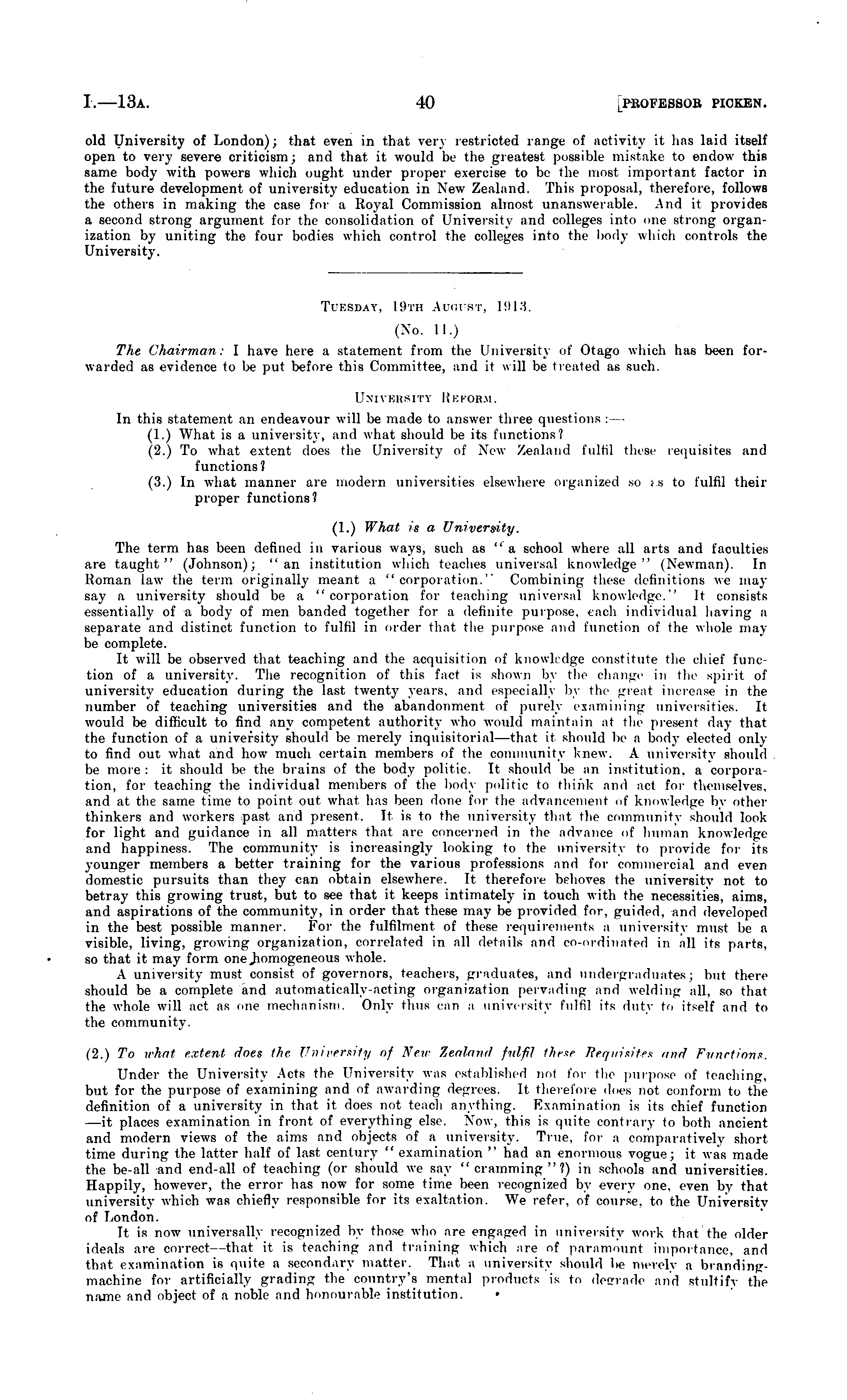 Tuesday, 19th August, 1913. (Xo. 11.) The Chairman: I have here a statement from the University of Otago which has been forwarded as evidence to be put before this Committee, and it will be treated as such. University He form. In this statement an endeavour will be made to answer three questions :— (1.) What is a university, and what should be its functions? (2.) To what extent does the University of New Zealand fulfil these requisites and functions? (3.) In what manner are modern universities elsewhere organized so j.s to fulfil their proper functions? (1.) What is a University. The term has been defined in various ways, such as "a school where all arts and faculties are taught" (Johnson); "an institution which teaches universal knowledge" (Newman). In Homan law the term originally meant a "corporation." Combining these definitions we may say a university should be a " corporation for teaching universal knowledge." It consists essentially of a body of men banded together for a definite purpose, each individual having a separate and distinct function to fulfil in order that the purpose and function of the whole maj be complete. It will be observed that teaching and the acquisition of knowledge constitute the chief function of a university. The recognition of this fact is shown by the change in the spirit of university education during the last twenty years, and especially by the great increase in the number of teaching universities and the abandonment of purely examining universities. It would be difficult to find any competent authority who would maintain at the present day that the function of a university should be merely inquisitorial —that it should be a body elected only to find out what and how much certain members of the community knew. A university should be more :it should be the brains of the body politic. It should be an institution, a corporation, for teaching the individual members of the body politic to think and act for themselves, and at the same time to point out what has been done for the advancement of knowledge by other thinkers and workers past and present. It is to the university that the community should look for light and guidance in all matters that are concerned in the advance of human knowledge and happiness. The community is increasingly looking to the university to provide for its younger members a better training for the various professions and for commercial and even domestic pursuits than they can obtain elsewhere. It therefore behoves the university not to betray this growing trust, but to see that it keeps intimately in touch with the necessities, aims, and aspirations of the community, in order that these may be provided for. guided, and developed in the best possible manner. For the fulfilment of these requirements a university musi lie a visible, living, growing organization, correlated in all details and co-ordinated in all its pails. so that it may form onejiomogeneous whole. A university must consist of governors, teachers, graduates, and undergraduates; but there should be a complete and automatically-acting organization pervading and welding all. so that the whole will act as one mechanism. Only thus can a university fulfil its duty to itself and to the community. (2.) To what extent does the University of New Zealand fulfil these BeqvisiU* and Function?. Under the University Acts the University was established not for the purpose of teaching, but for the purpose of examining and of awarding degrees. It therefore does not conform to the definition of a university in that it does not teach anything. Examination is its chief function —it places examination in front of everything else. Now, this is quite contrary to both ancient and modem views of the aims and objects of a university. True, for a comparatively short time during the latter half of last century " examination " had an enormous vogue; it was made the be-all and end-all of teaching (or should we say "cramming"?) in schools and universities. Happily, however, the error has now for some time been recognized by every one, even by that university which was chiefly responsible for its exaltation. We refer, of course, to the University of London. It is now universally recognized by those who are engaged in university work that the older ideals are correct —that it is teaching and training which are of paramount importance, and that examination is quite a secondary matter. That a university should be merely a brandingmachine for artificially grading the country's mental products is to detrrade and stultify the name and object of a noble and honourable institution.
