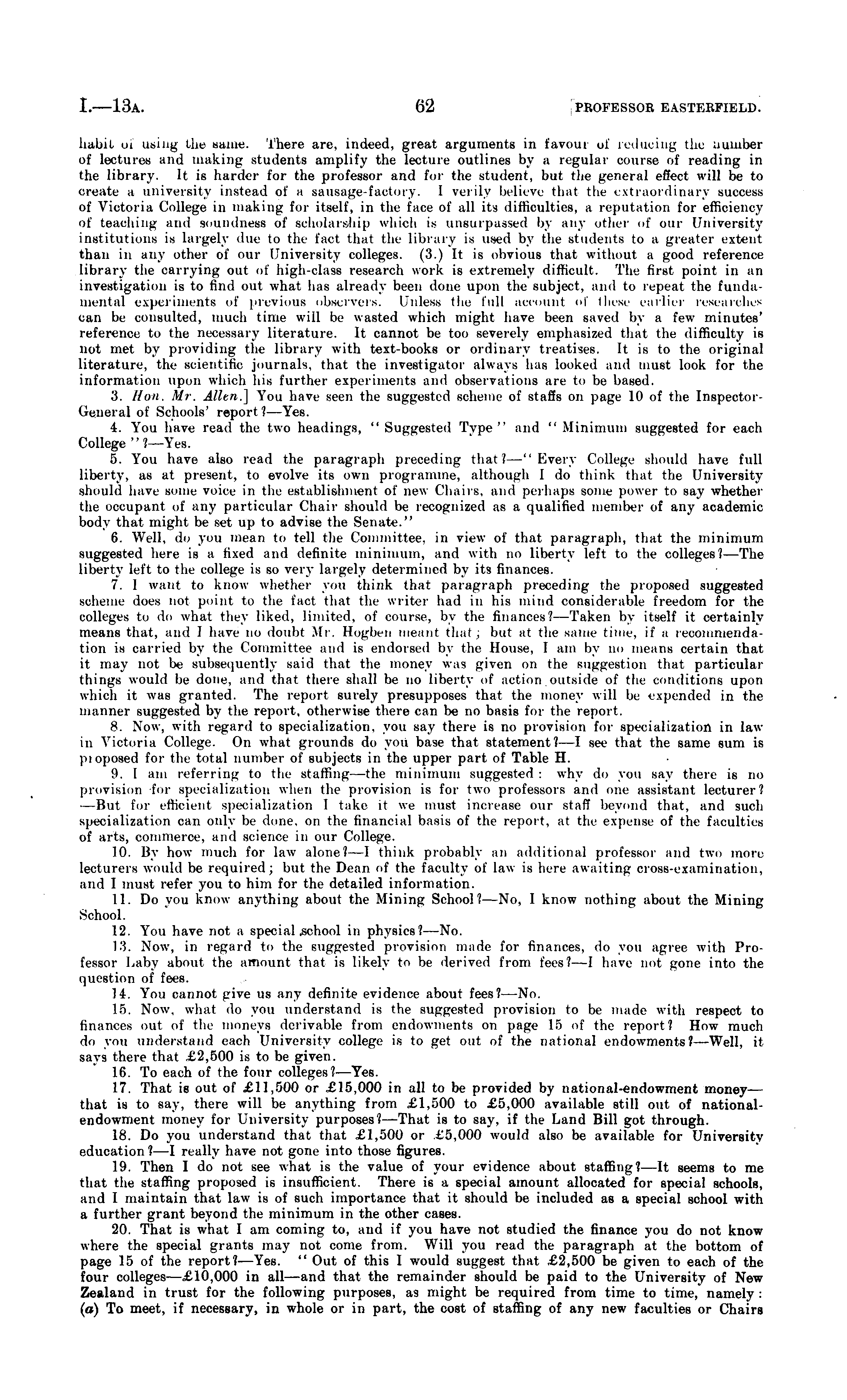 huljiL in using the same. There are, indeed, great arguments in favour of reducing the ;iumber of lectures and making students amplify the lecture outlines by a regular course of reading in the library. It is harder for the professor and for the student, but the general effect will be to create a university instead of h sausage-faotory. I verily believe that (he extraordinary success of Victoria College in making fur itself, in the face of all its difficulties, a reputation for efficiency of teaching and soundness of scholarship which is unsurpassed by any other i>t' our University institutions is largely due to the fact that the library is used by the students to a greater extent than in any other of our University colleges. (3.) It is obvious that without a good reference library the carrying out of high-class research work is extremely difficult. The first point in an investigation is to rind out what lias already been done upon the subject, and to repeat the fundamental experiments of previous observers. Unless the lull account of these earlier researches can be consulted, much time will be wasted which might have been saved by a few minutes' reference to the necessary literature. It cannot be too severely emphasized that the difficulty is not met by providing the library with text-books or ordinary treatises. It is to the original literature, the scientific journals, that the investigator always has looked and must look for the information upon which his further experiments and observations are to be based. 3. Eon, Mr. Allen.] You have seen the suggested scheme' of staffs on page 10 of the InspectorGeneral of Schools' report ? —Yes. 4. You have read the two headings, " Suggested Type" and " Minimum suggested for each College "?—Yes. 5. You have also read the paragraph preceding that?—" Every College should have full liberty, as at present, to evolve its own programme, although I do think that the University should have some voice in the establishment of new Chairs, and perhaps some power to say whether the occupant of any particular Chair should be recognized as a qualified member of any academic body that might be set up to advise the Senate." 6. Well, do you mean to tell the Committee, in view of that paragraph, that the minimum suggested here is a fixed and definite minimum, and with no liberty left to the colleges?— The liberty left to the college is so very largely determined by its finances. 7. 1 want to know whether you think that paragraph preceding the proposed suggested scheme does not point to the fact that the writer had in his mind considerable freedom for the colleges to do what they liked, limited, of course, by the finances?— Taken by itself it certainly means that, and I have no doubt Mr. Sogben meant that ; but at the same time, if a recommendation is carried by the Committee and is endorsed by the House, I am by do means certain that it may not Ik , subsequently said that the money was given on the suggestion that particular things would lie done, and that there shall be no liberty of action outside of the conditions upon which it was granted. The report surely presupposes that the money will be expended in the manner suggested by the report, otherwise there can lie no basis for the report. 8. Now, with regard to specialization, you say there is no provision for specialization in law in Victoria College. On what grounds do you base that statement?—l see that the same sum is pioposed for the total number of subjects in the upper part of Table H. i>. I am referring to the staffing—the minimum suggested : why do you say there is no provision for specialization when the provision is for two professors and oik , assistant lecturer? —But for efficient specialization I take it we must increase our staff beyond that, and such specialization can only be done, on the financial basis of the report, at the expense of the faculties of arts, commerce, and science in our College. 10. By how much for law alone? —I think probably an additional professor and two more lecturers would be required; but the Dean of the faculty of law is here awaiting cross-examination, and I must refer you to him for the detailed information. 11. Do you know anything about the Mining School? —No, I know nothing about the Mining School. 12. You have not a special .school in physics?— No. 13. Now, in regard to the suggested provision made for finances, do you agree with Professor baby about the amount that is likely to be derived from fees?—l have not gone into the question of fees. 14. You cannot give us any definite evidence about fees? —No. I f>. Now. what do you understand is the suggested provision to be made with respect to finances out of the moneys derivable from endowments on page 15 of the report? How much do you understand each University college is to get out of the national endowments? —Well, it says there that £2,500 is to be given. 16. To each of the four colleges?— Yes. 17. That is out of £11,500 or £15,000 in all to be provided by national-endowment money— that is to say, there will be anything from £1,500 to £5,000 available still out of nationalendowment money for University purposes? —That is to say, if the Land Bill got through. 18. Do you understand that that £1,500 or £5,000 would also be available for University education ? —I really have not gone into those figures. 19. Then I do not see what is the value of your evidence about staffing?—lt seems to me that the staffing proposed is insufficient. There is a special amount allocated for special schools, and I maintain that law is of such importance that it should be included as a special school with a further grant beyond the minimum in the other cases. 20. That is what I am coming to, and if you have not studied the finance you do not know where the special grants may not come from. Will you read the paragraph at the bottom of page 15 of the report?— Yes. " Out of this I would suggest