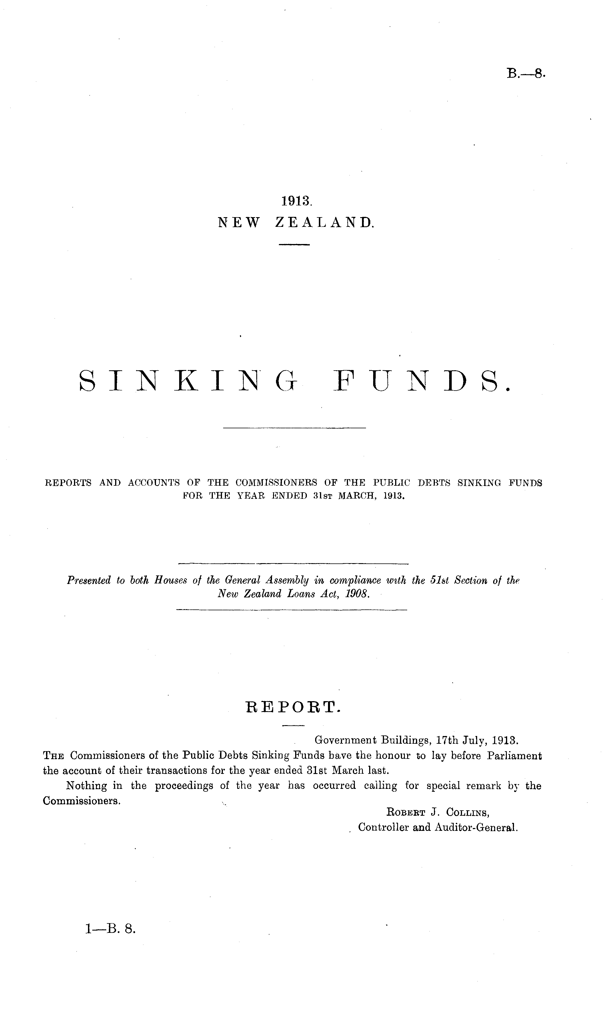 BEPOBT. Government Buildings, 17th July, 1913. The Commissioners of the Public Debts Sinking Funds have the honour to lay before Parliament the account of their transactions for the year ended 31st March last. Nothing in the proceedings of the year has occurred calling for special remark by the Commissioners. Eobeet J. Collins, Controller and Auditor-General.