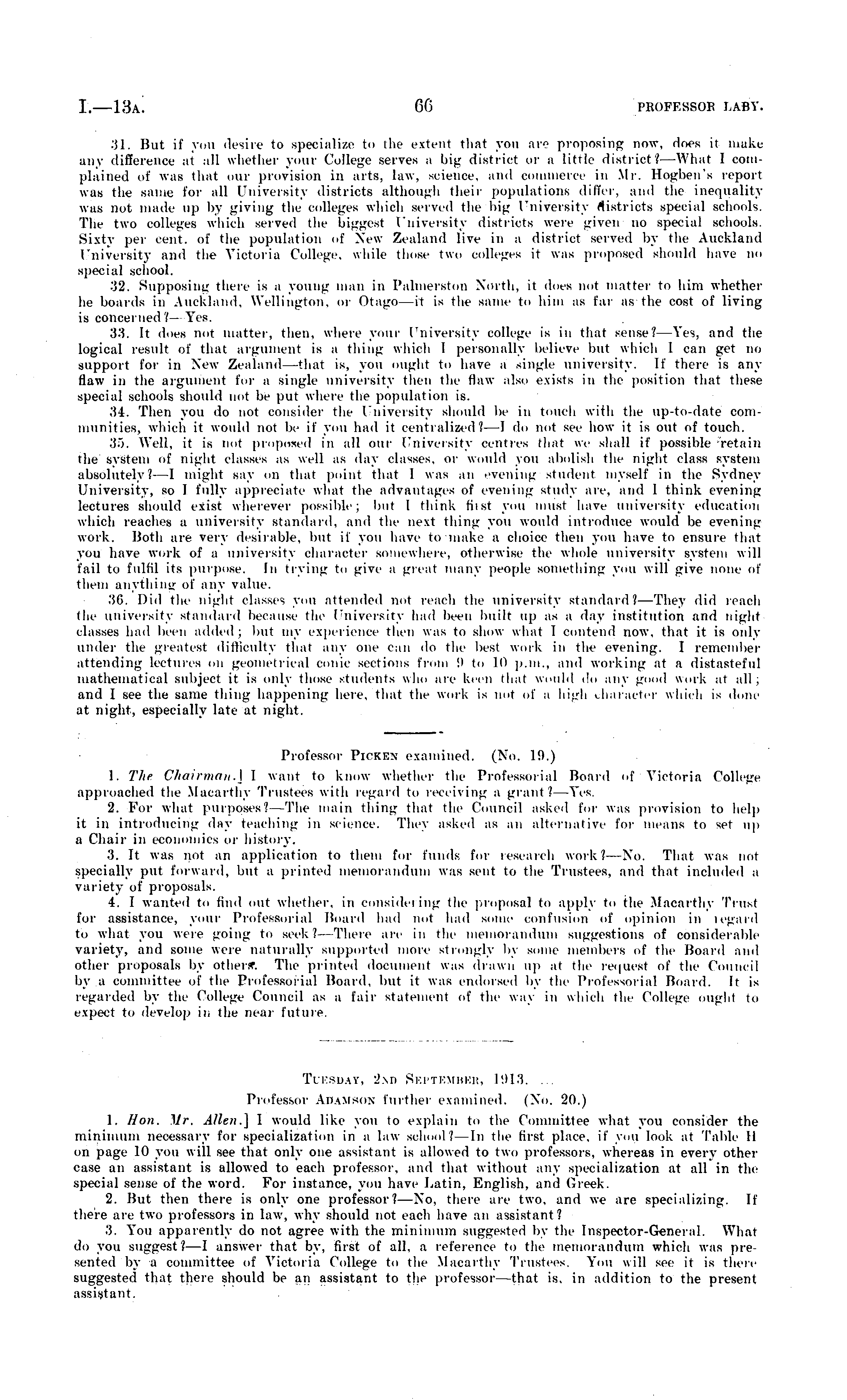 Tuesday, 2nd September, 1913. ... Professor ADAMSON further examined. (Xo. 20.) 1. Bon. I//'. Allen.] I would like you to explain to the Committee what you consider the minimum necessary for specialization in a law school? —In the first place, if you look at Table II on page 10 you will see that only one assistant is allowed to two professors, whereas in every other case an assistant is allowed to each professor, and that without any specialization at all in the special sense of the word. For instance, you have Latin, English, and Greek. 2. But then there is only one professor?—No, there are two. and we are specializing. If there are two professors in law, why should not each have an assistant? .'i. You apparently do not agree with the minimum suggested by the Inspector-General. What do you suggest?— l answer that by, first of all. a reference to the memorandum which was presented by a committee of Victoria College to the Macarthy Trustees. You will see it is there suggested that there should be an assistant to the professor —that is. in addition to the present assistant.