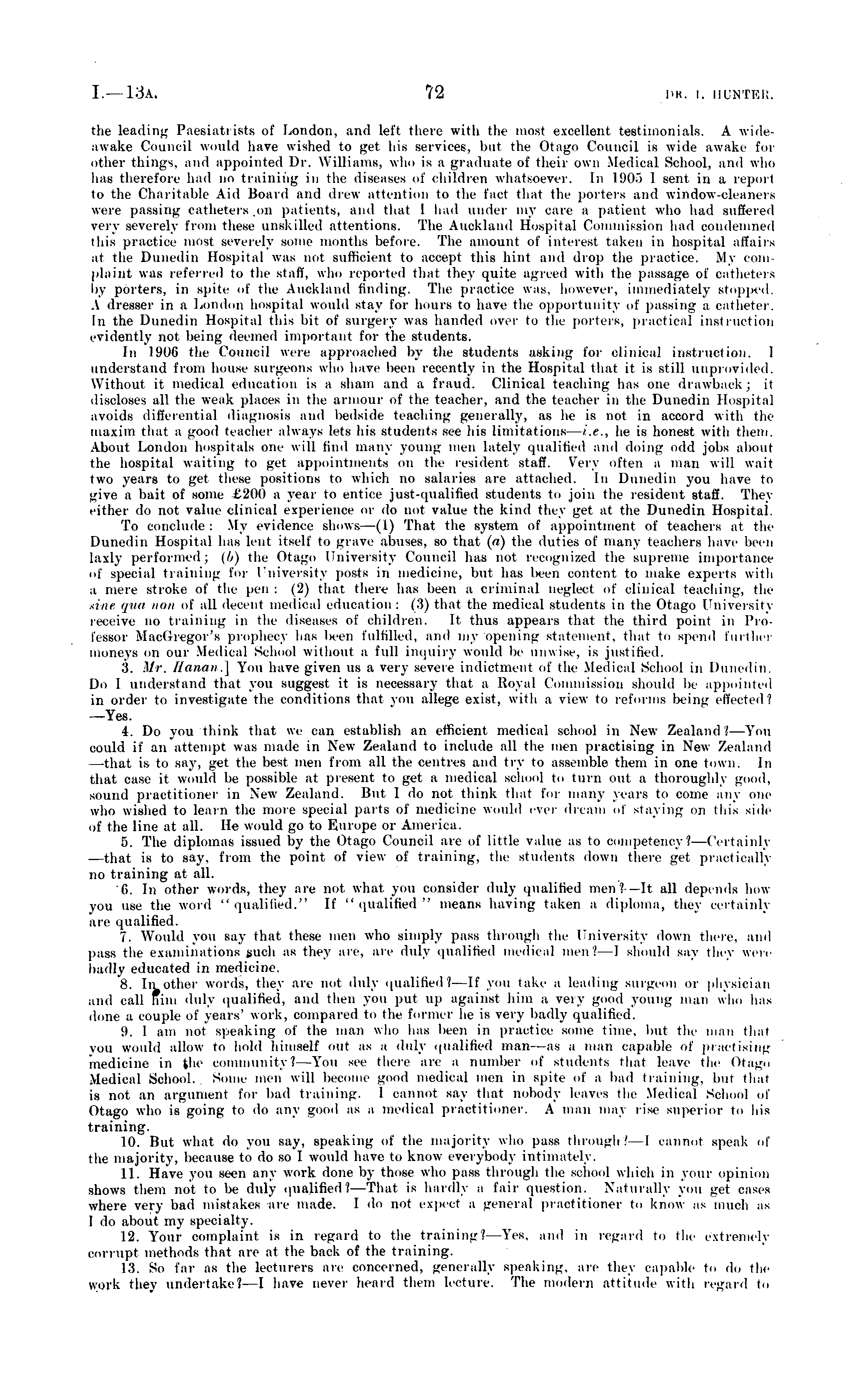 the leading Paesiatrists of London, and left there with the most excellent testimonials. A wideawake Council would have wished to gel his services, but the Otago Council is wide awake for other things, and appointed Dr. Williams, who is a graduate of their own Medical School, ami who has therefore had uo training in the diseases of children whatsoever. In lij()."i 1 sent in a report to the Charitable Aid Board and drew attention to the Tact that the porters and window-cleanerß were passing catheters on patients, and that 1 hud under my care a patient who had suffered very severely from these unskilled attentions. The Auckland Hospital Commission hail condemned this praotice most severely some months before. The amount of interest taken in hospital affairs at the Dunedin Hospital was not sufficient to accept this hint and drop the practice. My com plaint was referred to the staff, who reported thai they quite agreed with the passage of catheters by porters, in spite of the Auckland finding. The practice was. however, immediately stopped. A dresser in a London hospital would stay for hours to have the opportunity of passing a catheter. In the Dunedin Hospital this hit of surgery was handed over to the porters, practical instruction evidently not being deemed important for the students. In 1906 the Council were approached by the students asking for clinical instruction. 1 understand from house surgeons who have been recently in the Hospital that it is still unprovided. Without it medical education is a sham and a fraud. Clinical teaching has one drawback; it discloses all the weak places in the armour of the teacher, and the teacher in the Dunedin Hospital avoids differential diagnosis and bedside teaching generally, as he is not in accord with the maxim that a good teacher always lets his students see his limitations— i.e., he is honest with them. About London hospitals one will find many young men lately qualified and doing odd jobs about the hospital waiting to get appointments on the resident staff. Very often a man will wait two years to get these positions to which no salaries are attached. In Dunedin you have to give a bait of some £200 a year to entice just-qualified students to join the resident staff. TheA either do not value clinical experience or do ii.it value the kind they get at the Dunedin Hospital. To conclude: My evidence shows —(I) That the system of appointment of teachers at the Dunedin Hospital has lent itself to grave abuses, so that (rt) the duties of many teachers have been laxly performed; (h) tin , Otago University Council has not recognized the supreme importance of special training for University posts in medicine, but has been content to make experts with a mere stroke of the pen : (2) that there has been a criminal neglect of clinical teaching, the tine qua nan of all decent medical education : (3) that the medical students in the Otago University receive no training in the diseases of children. It thus appears that the third point in Professor Macdrcgor's prophecy has been fulfilled, and my opening statement, that to spend further moneys on our Medical School without a full inquiry would lie unwise, is justified. ,S. Mr. Hanan.] You have given us a very severe indictment of the Medical School in Dunedin. Do I understand that you suggest it is necessary that a Royal Commission should be appointed in order to investigate the conditions that you allege exist, with a view to reforms being effected i —Yes. 4. Do you think that we can establish an efficient medical school in New Zealand.' —You could if an attempt was made in New Zealand to include all the men practising in New Zealand —that is to say, get the best men from all the centres and try to assemble them in one town. In that case it would he possible at present to get a medical school to turn out a thoroughly good, sound practitioner in New Zealand. Hut 1 do not think that for many years to come any one who wished to learn the 1 c special parts of medicine would ever dream of staying on this side of the line at all. lie would go to Europe or America. 5. The diplomas issued by the Otago Council are of little value as to competency?— Certainly —that is to say. from the point of view of training, the students down there get practically no training at all. G. In other words, they are not what you consider duly qualified men?—lt all depends how you use the word " qualified;" If "qualified" means having taken a diploma, they certainly are qualified. 7. Would you say that these men who simply pass through the University down there, and pass the examinations such as they arc, arc duly qualified medical men I I should say they were badly educated in medicine. 8. In other words, they are not duly qualified) —If you take a leading surgeon or physician and call Him duly qualified, and then you put up against him a very good young man who has done a couple of years' work, compared to the former he is very badly qualified. !). I am not speaking of the man who has been in practice some time, but the man that you would allow to hold himself out as a duly qualified man-—as a man capable of practising medicine in th<' community?— You see there are a number of students that leave the Otago Medical School. Some men will become good medical men in spite of a bad training, but that is not an argument for bad training. 1 cannot say that nobody leaves the Medical School of Otago who is going to do any good as a medical practitioner. A man may rise superior to his training. 10. But what do you say, speaking of the majority who pass through?—] cannot speak of the majority, because to do so I would have to know everybody intimately. 11. Have you seen any work done by those who pass through the school which in your opinion shows them not to be duly qualified? —That is hardly a fair question. Naturally you get cases where very bad mistakes are made. I do not expect a general practitioner to know as much as 