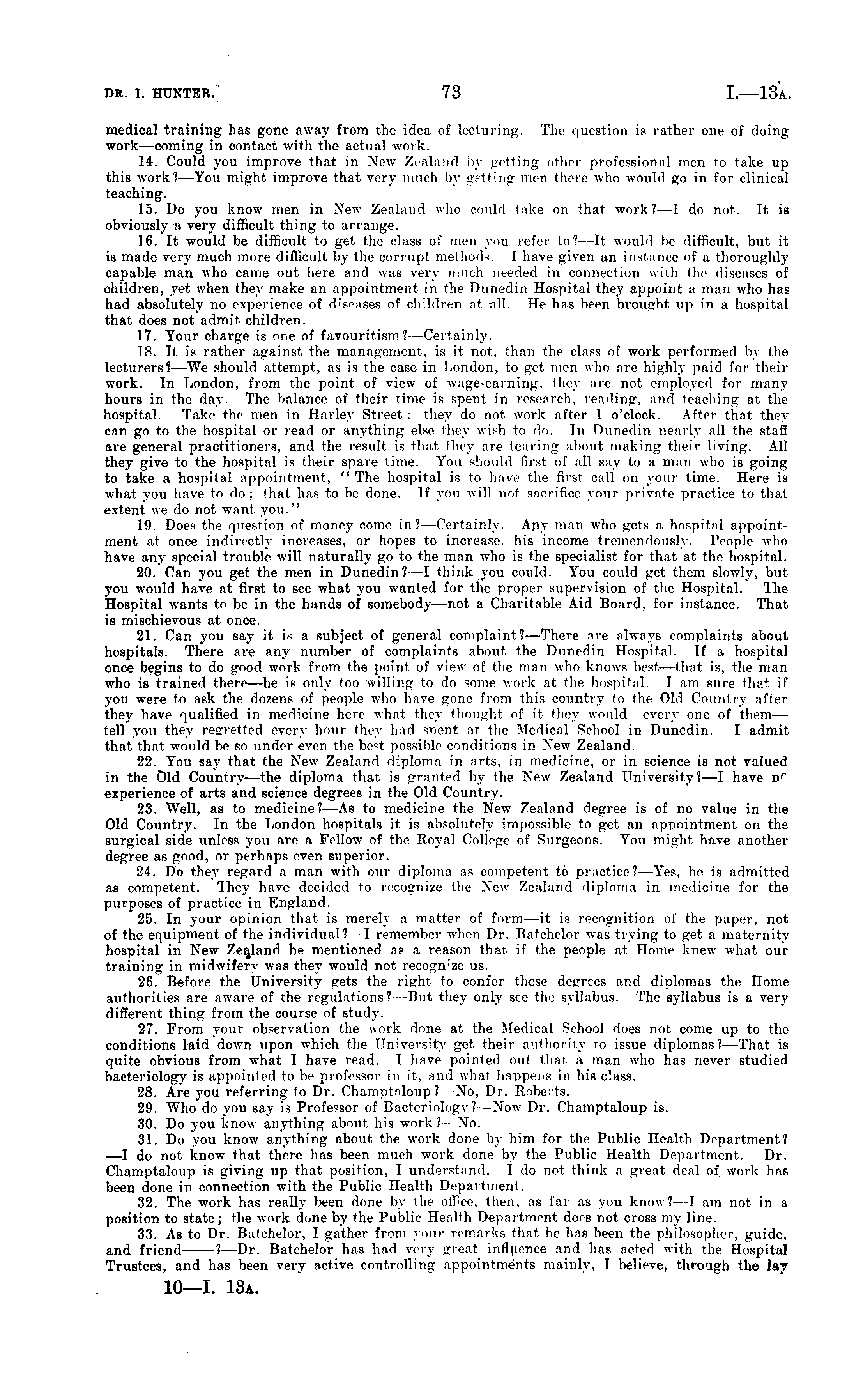 medical training has gone away from the idea of lecturing. The question is rather one of doing work —coming in contact with the actual "work. 14. Could you improve that in Xew Zealand In getting other professional men to take up this work?— You might improve that very much by getting men there who would go in for clinical teaching. 15. Do you know men in New Zealand who could lake on that work?—T do Tint. It is obviously a very difficult thing to arrange. 16. It would be difficult to get the class of men you refer to?— lt would be difficult, but it is made very much more difficult by the corrupt methods. I have given an instance of a thoroughly capable man who came out here and was very much needed in connection with the diseases of children, yet when they make an appointment in the Dunedin Hospital they appoint a man who has had absolutely no experience of diseases of children at all. He has been brought up in a hospital that does not admit children. 17. Tour charge is one of favouritism? —Certainly. 18. It is rather against the management, is it not, than the class of work performed by the lecturers? —We should attempt, as is the case in London, to get men who are highly paid for their work. In London, from the point of view of wage-earning, they are not employed for many hours in the day. The balance of their time is spent in research, reading, and teaching at the hospital. Take the men in Harley Street : they do not work after 1 o'clock. After that they can go to the hospital or read or anything else they wish to do. In Dunedin nearly all the staff are general practitioners, and the result is that they are tearing about making their living. All they give to the hospital is their spare time. You should first of all say to a man who is going to take a hospital appointment, " The hospital is to have the first call on your time. Here is what you have to do; that has to be done. If you will not sacrifice your private practice to that extent we do not want you." 19. Does the question of money come in?— Certainly. Any man who gets a hospital appointment at once indirectly increases, or hopes to increase, his income tremendously. People who have any special trouble will naturally go to the man who is the specialist for that at the hospital. 20. Can you get the men in Dunedin? —I think you could. You could get them slowly, but you would have at first to see what you wanted for the proper supervision of the Hospital. The Hospital wants to be in the hands of somebody—not a Charitable Aid Board, for instance. That is mischievous at once. 21. Can you say it is a subject of general complaint?— There are always complaints about hospitals. There are any number of complaints about the Dunedin Hospital. If a hospital once begins to do good work from the point of view of the man who knows best—that is, the man who is trained there—he is only too willing to do some work at the hospital. lam sure that if you were to ask the dozens of people who have gone from this country to the Old Country after they have qualified in medicine here what they thought of it they would—every one of them— tell you they regretted every hour they had spent at the Medical School in Dunedin. I admit that that would be so under even the best possible conditions in Xew Zealand. 22. You say that the New Zealand diploma in arts, in medicine, or in science is not valued in the Old Country—the diploma that is granted by the New Zealand University?—l have n r experience of arts and science degrees in the Old Country. 23. Well, as to medicine?—As to medicine the New Zealand degree is of no value in the Old Country. In the London hospitals it is absolutely impossible to get an appointment on the surgical side unless you are a Fellow of the Royal College of Surgeons. You might have another degree as good, or perhaps even superior. 24. Do they regard a man with our diploma as competent to practice?— Yes, he is admitted as competent. They have decided to recognize the New Zealand diploma in medicine for the purposes of practice in England. 25. In your opinion that is merely a matter of form—it is recognition of the paper, not of the equipment of the individual? —I remember when Dr. Batchelor was trying to get a maternity hospital in New Zealand he mentioned as a reason that if the people at Home knew what our training in midwifery was they would not recogn'ze us. 26. Before the University gets the right to confer these degrees and diplomas the Home authorities are aware of the regulations?— But they only see the syllabus. The syllabus is a very different thing from the course of study. 27. From your observation the work done at the Medical School does not come up to the conditions laid down upon which the University get their authority to issue diplomas?— That is quite obvious from what I have read. I have pointed out that a man who has never studied bacteriology is appointed to be professor in it, and what happens in his class. 28. Are you referring to Dr. Champtaloup?—No, Dr. Roberts. 29. Who do you say is Professor of Bacteriology? —Now Dr. Champtaloup is. 30. Do you know anything about his work? —No. 31. Do you know anything about the work done by him for the Public Health Department? —I do not know that there has been much work done by the Public Health Department. Dr. Champtaloup is giving up that position, I understand. Ido not think a great deal of work has been done in connection with the Public Health Department. 32. The work has really been done by the office, then, as far as you know?—l am not in a position to state; the work done by the Public Health Department does not cross my line. 33. As to Dr. Batchelor, I gather from your remarks that he lias been the philosopher, guide, and friend ?—Dr. Batchelor has had very great influence and has acted with the Hospital Trustees, and has been very active controlling appointments mainly, I believe, through the la?