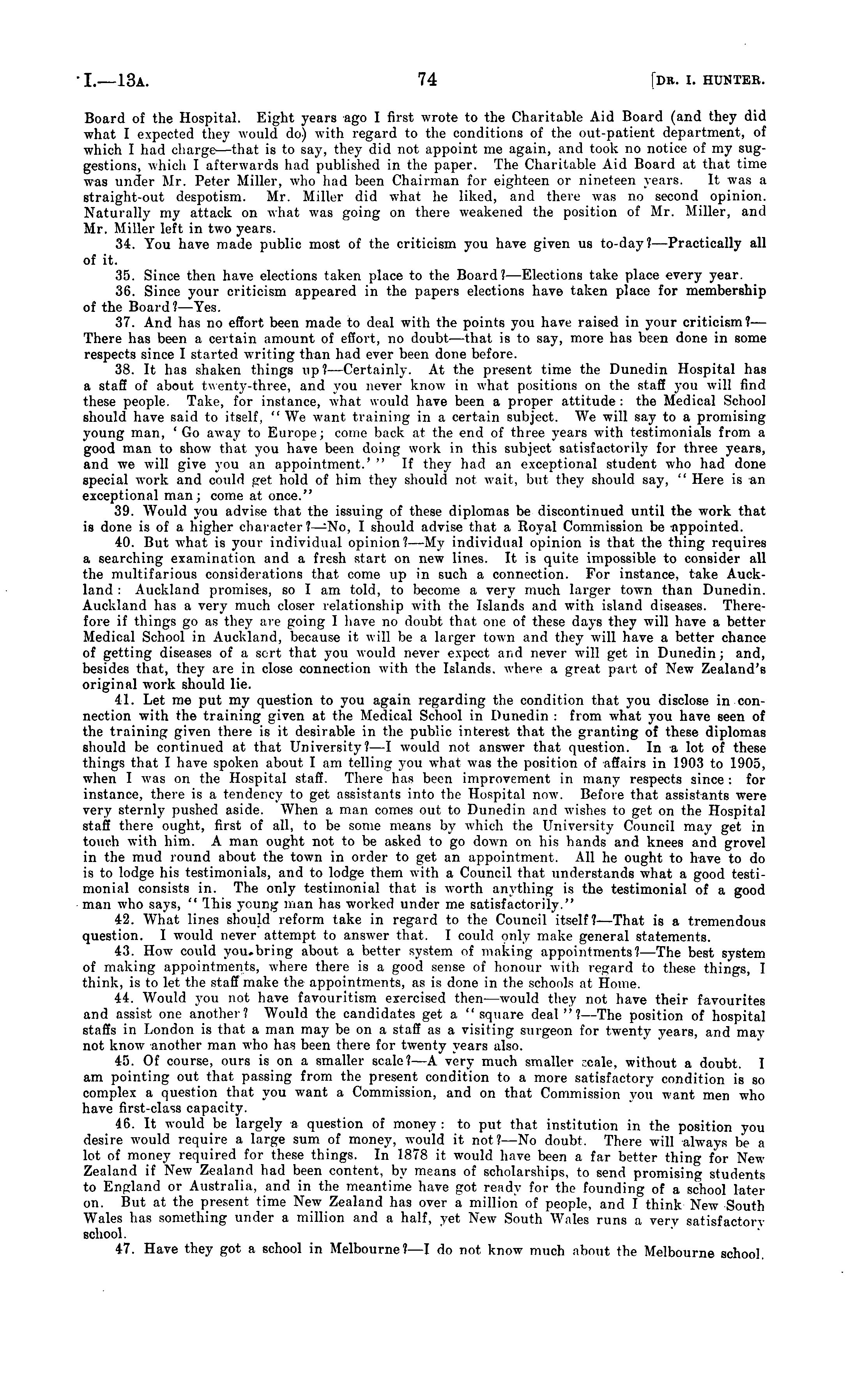 Board of the Hospital. Eight years ago I first wrote to the Charitable Aid Board (and they did what I expected they would do) with regard to the conditions of the out-patient department, of which I had chargeI—that1—that is to say, they did not appoint me again, and took no notice of my suggestions, which I afterwards had published in the paper. The Charitable Aid Board at that time was under Mr. Peter Miller, who had been Chairman for eighteen or nineteen years. It was a straight-out despotism. Mr. Miller did what he liked, and there was no second opinion. Naturally my attack on what was going on there weakened the position of Mr. Miller, and Mr. Miller left in two years. 34. You have made public most of the criticism you have given us to-day?— Practically all of it. 35. Since then have elections taken place to the Board? —Elections take place every year. 36. Since your criticism appeared in the papers elections have taken place for membership of the Board?— Yes. 37. And has no effort been made to deal with the points you have raised in your criticism? — There has been a certain amount of effort, no doubt —that is to say, more has been done in some respects since I started writing than had ever been done before. 38. It has shaken things up?— Certainly. At the present time the Dunedin Hospital has a staff of about twenty-three, and you never know in what positions on the staff you will find these people. Take, for instance, what would have been a proper attitude : the Medical School should have said to itself, "We want training in a certain subject. We will say to a promising young man, ' Go away to Europe; come back at the end of three years with testimonials from a good man to show that you have been doing work in this subject satisfactorily for three years, and we will give you an appointment.' ' If they had an exceptional student who had done special work and could get hold of him they should not wait, lint they should say, " Here is an exceptional man; come at once." 39. Would you advise that the issuing of these diplomas be discontinued until the work that is done is of a higher character ?—No, I should advise that a Royal Commission be appointed. 40. But what is your individual opinion?—My individual opinion is that the thing requires a searching examination and a fresh start on new lines. It is quite impossible to consider all the multifarious considerations that come up in such a connection. For instance, take Auckland : Auckland promises, so I am told, to become a very much larger town than Dunedin. Auckland has a very much closer relationship with the Islands and with island diseases. Therefore if things go as they are going I have no doubt that one of these days they will have a better Medical School in Auckland, because it will be a larger town and they will have a better chance of getting diseases of a sort that you would never expect and never will get in Dunedin; and, besides that, they are in close connection with the Islands, where a great part of New Zealand's original work should lie. 41. Let me put my question to you again regarding the condition that you disclose in connection with the training given at the Medical School in Dunedin : from what you have seen of the training given there is it desirable in the public interest that the granting of these diplomas should be continued at that University? —I would not answer that question. In a lot of these things that I have spoken about I am telling you what was the position of affairs in 1903 to 1905, when I was on the Hospital staff. There has been improvement in many respects since : for instance, there is a tendency to get assistants into the Hospital now. Before that assistants were very sternly pushed aside. When a man comes out to Dunedin and wishes to get on the Hospital staff there ought, first of all, to be some means by which the University Council may get in touch with him. A man ought not to be asked to go down on his hands and knees and grovel in the mud round about the town in order to get an appointment. All he ought to have to do is to lodge his testimonials, and to lodge them with a Council that understands what v good testimonial consists in. The only testimonial that is worth anything is the testimonial of a good man who says, " This young man has worked under me satisfactorily." 42. What lines should reform take in regard to the Council itself?— That is a tremendous question. I would never attempt to answer that. I could only make general statements. 43. How could you.bring about a better system of making appointments?— The best system of making appointments, where there is a good sense of honour with regard to these things, I think, is to let the staff make the appointments, as is done in the schools at Home. 44. Would you not have favouritism exercised then—would they not have their favourites and assist one another? Would the candidates get a "square deal"?— The position of hospital staffs in London is that a man may be on a staff as a visiting surgeon for twenty years, and may not know another man who has been there for twenty years also. 45. Of course, ours is on a smaller scale? —A very much smaller .cale, without a doubt. I am pointing out that passing from the present condition to a more satisfactory condition is so complex a question that you want a Commission, and on that Commission you want men who have first-class capacity. 46. It would be largely a question of money : to put that institution in the position you desire would require a large sum of money, would it not?—No doubt. There will always be a lot of money required for these things. In 1878 it would have been a far better thing for New Zealand if New Zealand had been content, by means of scholarships, to send promising students to England or Australia, and in the meantime have got ready for the founding of a school later on. But at the present time New Zealand has over a million of people, and I th