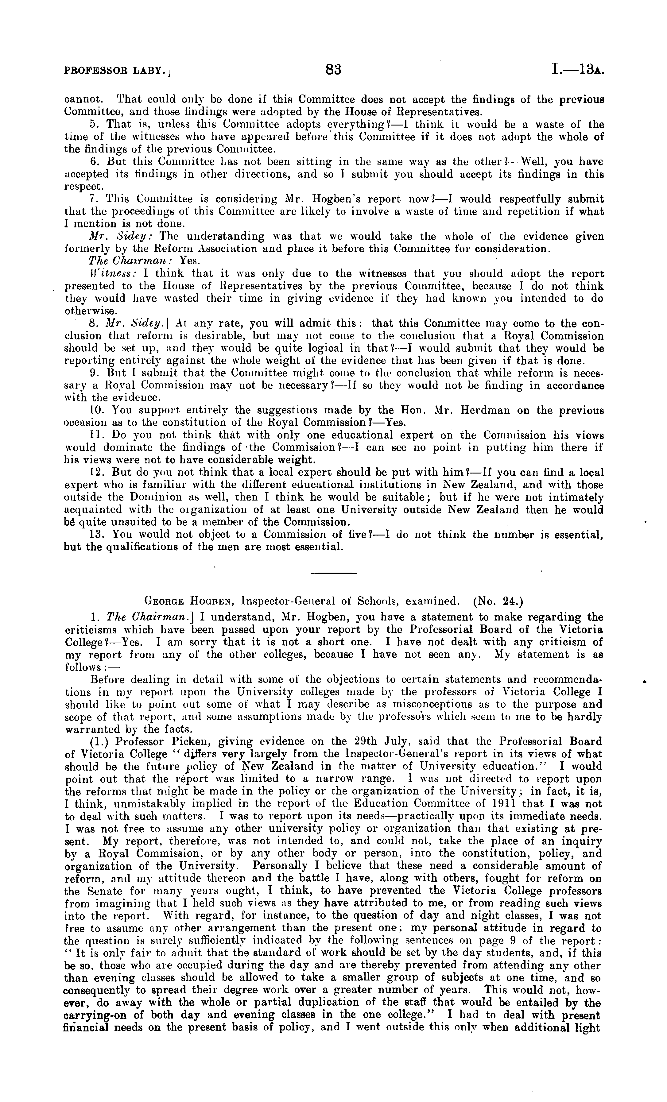 George Hogben, Inspector-General of Schools, examined. (No. 24.) 1. The Chairman.] I understand, Mr. Hogben, you have a statement to make regarding the criticisms which have been passed upon your report by the Professorial Board of the Victoria College? —Yes. 1 am sorry that it is not a short one. I have not dealt with any criticism of my report from any of the other colleges, because I have not seen any. My statement is as follows :— Before dealing in detail with some of the objections to certain statements and recommendations in my report upon the University colleges made by the professors of Victoria College I should like to point out some of what I may describe as misconceptions as to the purpose and scope of that report, and some assumptions made by the professors which seem to me to be hardly warranted by the facts. (1.) Professor I'icken, giving evidence on the 29th July, said that the Professorial Board of Victoria College " differs very largely from the Inspector-General's report in its views of what should be the future policy of New Zealand in the matter of University education." I would point out that the report was limited to a narrow range. I was not directed to report upon the reforms that might be made in the policy or the organization of the University; in fact, it is, I think, unmistakably implied in the report of the Education Committee of 1911 that I was not to deal with such matters. I was to report upon its needs—practically upon its immediate needs. I was not free to assume any other university policy or organization than that existing at present. My report, therefore, was not intended to, and could not, take the place of an inquiry by a Royal Commission, or by any other body or person, into the constitution, policy, and organization of the University. Personally I believe that these need a considerable amount of reform, and my attitude thereon and the battle I have, along with others, fought for reform on the Senate for many years ought, T think, to have prevented the Victoria College professors from imagining that I held such views as they have attributed to me, or from reading such views into the report. With regard, for instance, to the question of day and night classes, I was not free to assume any other arrangement than the present one; my personal attitude in regard to the question is surely sufficiently indicated by the following sentences on page 9 of the report : "It is only fair to admit that the standard of work should be set by the day students, and, if this be so, those who are occupied during the day and are thereby prevented from attending any other than evening classes should be allowed to take a smaller group of subjects at one time, and so consequently to spread their degree work over a greater number of years. This would not, however, do away with the whole or partial duplication of the staff that would be entailed by the carrying-on of both day and evening classes in the one college." I had to deal with present financial needs on the present basis of policy, and T went outside this only when additional light