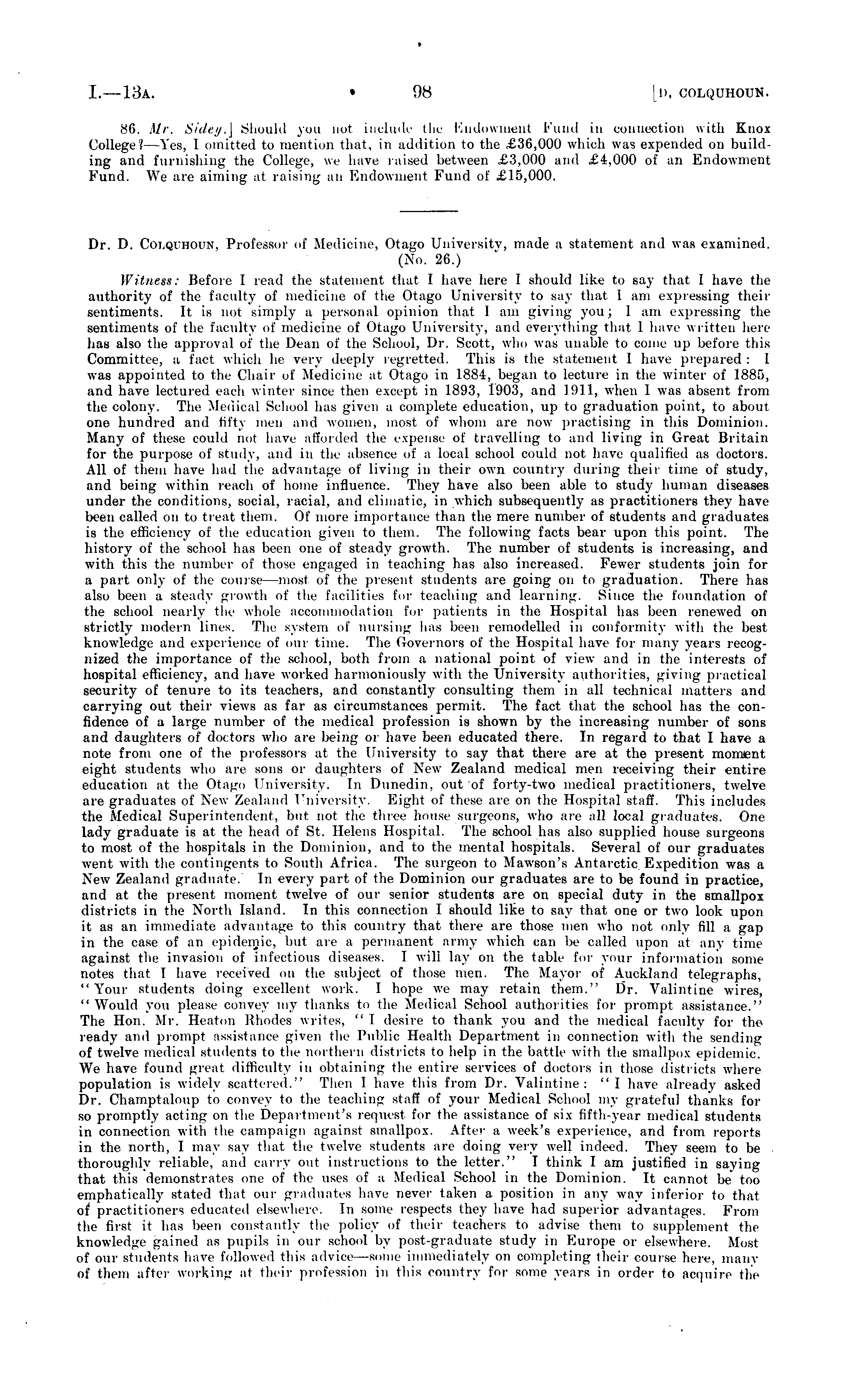Dr. D. Colquhoun, Professor of Medicine, Otago University, made a statement and was examined. (No. 26.) Witness: Before I read the statement that I have here I should like to say that I have the authority of the faculty of medicine of the Otago University to say that I am expressing their sentiments. It is noi simply a personal opinion thai lam giving yon; I am expressing the sentiments of the faculty of medicine of Otago University, and everything that 1 have written here lias also the approval of the Dean of the School, Dr. Scott, who was unable to come up before this Committee, a fact which he very deeply regretted. This is the statement I have prepared: 1 was appointed to the Chair of Medicine at Otago in 1884, began to lecture in the winter of 1885, and have lectured each winter since then except in 1893, 1903, and 1911, when 1 was absent from the colony. The Medical School has given a complete education, up to graduation point, to about one hundred and fifty men and women, most of whom are now practising in this Dominion. Many of these could not have afforded the expense of travelling to and living in Great Britain for the purpose of study, and in the absence of a local school could not have qualified as doctors. All of them have had the advantage of living in their own country during their time of study, and being within reach of home influence. They have also been able to study human diseases under the conditions, social, racial, and climatic, in which subsequently as practitioners they have been called on to treat them. Of more importance than the mere number of students and graduates is the efficiency of the education given to them. The following facts bear upon this point. The history of the school has been one of steady growth. The number of students is increasing, and with this the number of those engaged in teaching has also increased. Fewer students join for a part only of the course —most of the present students are going on to graduation. There has also been a steady growth of the facilities for teaching and learning. Since the foundation of the school nearly the whole accommodation for patients in the Hospital has been renewed on strictly modern lines. The system of nursing has been remodelled in conformity with the best knowledge and experience of our time. The Governors of the Hospital have for many years recognized the importance of the school, both from a national point of view and in the interests of hospital efficiency, and have worked harmoniously with the University authorities, giving practical security of tenure to its teachers, and constantly consulting them in all technical matters and carrying out their views as far as circumstances permit. The fact that the school has the confidence of a large number of the medical profession is shown by the increasing number of sons and daughters of doctors who are being or have been educated there. In regard to that I have a note from one of the professors at the University to say that there are at the present moment eight students who are sons or daughters of New Zealand medical men receiving their entire education at the Otago University. In Dunedin, out of forty-two medical practitioners, twelve are graduates of New Zealand University. Eight of these are on the Hospital staff. This includes the Medical Superintendent, but not the three house surgeons, who are all local graduates. One lady graduate is at the head of St. Helens Hospital. The school has also supplied house surgeons to most of the hospitals in the Dominion, and to the mental hospitals. Several of our graduates went with the contingents to South Africa. The surgeon to Mawson's Antarctic Expedition was a New Zealand graduate. In every part of the Dominion our graduates are to be found in practice, and at the present moment twelve of our senior students are on special duty in the smallpox districts in the North Island. In this connection I should like to say that one or two look upon it as an immediate advantage to this country that there are those men who not only fill a gap in the case of an epidemic, bul are a permanent army which can be called upon at any time against the invasion of infectious diseases. I will lav on the table for your information some notes that I have received on the subject of those men. The Mayor of Auckland telegraphs, "Your students doing excellent work. I hope we may retain them." Dr. Valintine wires, " Would you please convey my thanks to the Medical School authorities for prompt assistance." The Hon. Mr. Heaton Rhodes writes, " \ desire to thank you and the medical faculty for the ready and prompt assistance given the Public Health Department in connection with the sending of twelve medical students to the northern districts to help in the battle with the smallpox epidemic, We have found great difficulty in obtaining the entire services of doctors in those districts where population is widely Bca'ttered." Then I have this from Dr. Valintine: "I have already asked Dr. Champtaloup to convey to the teaching staff of your Medical School my grateful thanks for so promptly acting on the Department's request for the assistance of six fifth-year medical students in connection with the campaign against smallpox. After a week's experience, and from reports in the north, I may say that the twelve students are doing very well indeed. They seem to be thoroughly reliable, and carry out instructions to the letter." I think I am justified in saying that this demonstrates one of the uses of a Medical School in the Dominion. It cannot be* too emphatically stated that our graduates have never taken a position in any way inferior to that of practitioners educated elsewhere. In some respects they have had superior advantages. From the first it has been constantly the policy of their teachers to advise them to supplement the knowledge gained as pupils in our school by post-graduate study in Europe or elsewhere. Most of our students have followed t